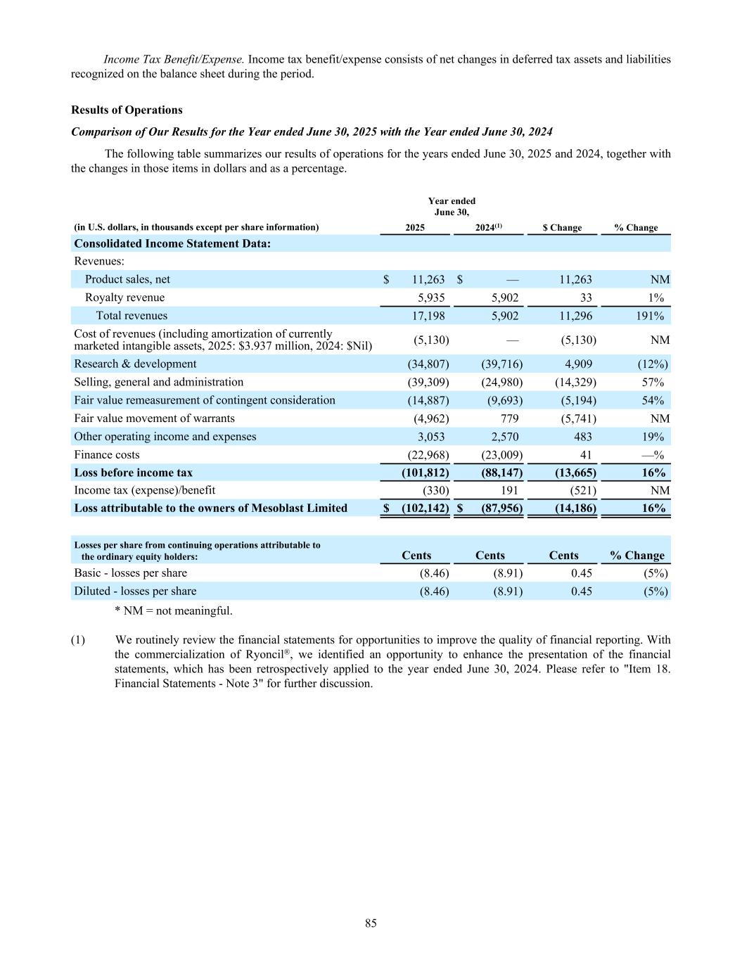 Income Tax Benefit/Expense. Income tax benefit/expense consists of net changes in deferred tax assets and liabilities recognized on the balance sheet during the period. Results of Operations Comparison of Our Results for the Year ended June 30, 2025 with the Year ended June 30, 2024 The following table summarizes our results of operations for the years ended June 30, 2025 and 2024, together with the changes in those items in dollars and as a percentage. Year ended June 30, (in U.S. dollars, in thousands except per share information) 2025 2024(1) $ Change % Change Consolidated Income Statement Data: Revenues: Product sales, net $ 11,263 $ — 11,263 NM Royalty revenue 5,935 5,902 33 1% Total revenues 17,198 5,902 11,296 191% Cost of revenues (including amortization of currently marketed intangible assets, 2025: $3.937 million, 2024: $Nil) (5,130) — (5,130) NM Research & development (34,807) (39,716) 4,909 (12%) Selling, general and administration (39,309) (24,980) (14,329) 57% Fair value remeasurement of contingent consideration (14,887) (9,693) (5,194) 54% Fair value movement of warrants (4,962) 779 (5,741) NM Other operating income and expenses 3,053 2,570 483 19% Finance costs (22,968) (23,009) 41 —% Loss before income tax (101,812) (88,147) (13,665) 16% Income tax (expense)/benefit (330) 191 (521) NM Loss attributable to the owners of Mesoblast Limited $ (102,142) $ (87,956) (14,186) 16% Losses per share from continuing operations attributable to the ordinary equity holders: Cents Cents Cents % Change Basic - losses per share (8.46) (8.91) 0.45 (5%) Diluted - losses per share (8.46) (8.91) 0.45 (5%) * NM = not meaningful. (1) We routinely review the financial statements for opportunities to improve the quality of financial reporting. With the commercialization of Ryoncil®, we identified an opportunity to enhance the presentation of the financial statements, which has been retrospectively applied to the year ended June 30, 2024. Please refer to "Item 18. Financial Statements - Note 3" for further discussion. 85