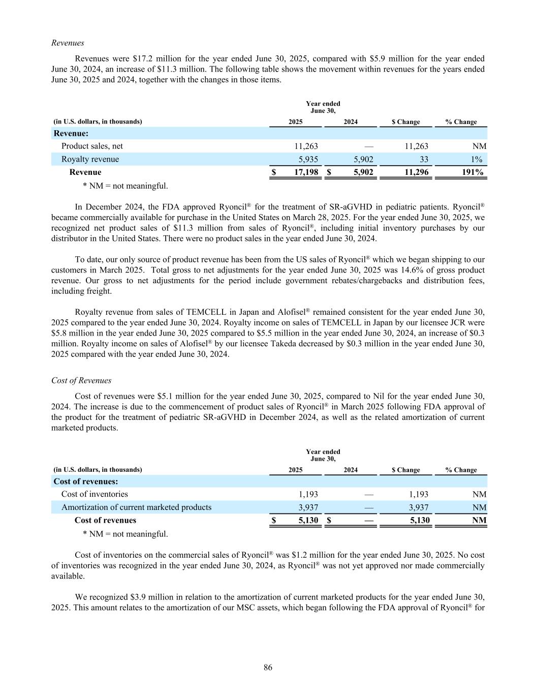 Revenues Revenues were $17.2 million for the year ended June 30, 2025, compared with $5.9 million for the year ended June 30, 2024, an increase of $11.3 million. The following table shows the movement within revenues for the years ended June 30, 2025 and 2024, together with the changes in those items. Year ended June 30, (in U.S. dollars, in thousands) 2025 2024 $ Change % Change Revenue: Product sales, net 11,263 — 11,263 NM Royalty revenue 5,935 5,902 33 1% Revenue $ 17,198 $ 5,902 11,296 191% * NM = not meaningful. In December 2024, the FDA approved Ryoncil® for the treatment of SR-aGVHD in pediatric patients. Ryoncil® became commercially available for purchase in the United States on March 28, 2025. For the year ended June 30, 2025, we recognized net product sales of $11.3 million from sales of Ryoncil®, including initial inventory purchases by our distributor in the United States. There were no product sales in the year ended June 30, 2024. To date, our only source of product revenue has been from the US sales of Ryoncil® which we began shipping to our customers in March 2025. Total gross to net adjustments for the year ended June 30, 2025 was 14.6% of gross product revenue. Our gross to net adjustments for the period include government rebates/chargebacks and distribution fees, including freight. Royalty revenue from sales of TEMCELL in Japan and Alofisel® remained consistent for the year ended June 30, 2025 compared to the year ended June 30, 2024. Royalty income on sales of TEMCELL in Japan by our licensee JCR were $5.8 million in the year ended June 30, 2025 compared to $5.5 million in the year ended June 30, 2024, an increase of $0.3 million. Royalty income on sales of Alofisel® by our licensee Takeda decreased by $0.3 million in the year ended June 30, 2025 compared with the year ended June 30, 2024. Cost of Revenues Cost of revenues were $5.1 million for the year ended June 30, 2025, compared to Nil for the year ended June 30, 2024. The increase is due to the commencement of product sales of Ryoncil® in March 2025 following FDA approval of the product for the treatment of pediatric SR-aGVHD in December 2024, as well as the related amortization of current marketed products. Year ended June 30, (in U.S. dollars, in thousands) 2025 2024 $ Change % Change Cost of revenues: Cost of inventories 1,193 — 1,193 NM Amortization of current marketed products 3,937 — 3,937 NM Cost of revenues $ 5,130 $ — 5,130 NM * NM = not meaningful. Cost of inventories on the commercial sales of Ryoncil® was $1.2 million for the year ended June 30, 2025. No cost of inventories was recognized in the year ended June 30, 2024, as Ryoncil® was not yet approved nor made commercially available. We recognized $3.9 million in relation to the amortization of current marketed products for the year ended June 30, 2025. This amount relates to the amortization of our MSC assets, which began following the FDA approval of Ryoncil® for 86
