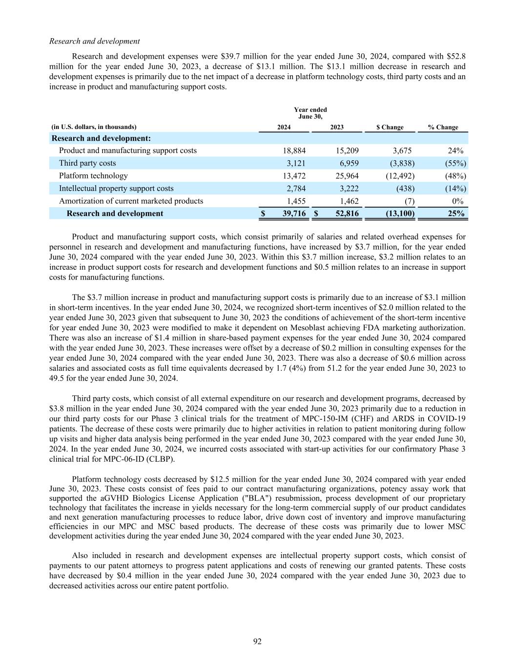 Research and development Research and development expenses were $39.7 million for the year ended June 30, 2024, compared with $52.8 million for the year ended June 30, 2023, a decrease of $13.1 million. The $13.1 million decrease in research and development expenses is primarily due to the net impact of a decrease in platform technology costs, third party costs and an increase in product and manufacturing support costs. Year ended June 30, (in U.S. dollars, in thousands) 2024 2023 $ Change % Change Research and development: Product and manufacturing support costs 18,884 15,209 3,675 24% Third party costs 3,121 6,959 (3,838) (55%) Platform technology 13,472 25,964 (12,492) (48%) Intellectual property support costs 2,784 3,222 (438) (14%) Amortization of current marketed products 1,455 1,462 (7) 0% Research and development $ 39,716 $ 52,816 (13,100) 25% Product and manufacturing support costs, which consist primarily of salaries and related overhead expenses for personnel in research and development and manufacturing functions, have increased by $3.7 million, for the year ended June 30, 2024 compared with the year ended June 30, 2023. Within this $3.7 million increase, $3.2 million relates to an increase in product support costs for research and development functions and $0.5 million relates to an increase in support costs for manufacturing functions. The $3.7 million increase in product and manufacturing support costs is primarily due to an increase of $3.1 million in short-term incentives. In the year ended June 30, 2024, we recognized short-term incentives of $2.0 million related to the year ended June 30, 2023 given that subsequent to June 30, 2023 the conditions of achievement of the short-term incentive for year ended June 30, 2023 were modified to make it dependent on Mesoblast achieving FDA marketing authorization. There was also an increase of $1.4 million in share-based payment expenses for the year ended June 30, 2024 compared with the year ended June 30, 2023. These increases were offset by a decrease of $0.2 million in consulting expenses for the year ended June 30, 2024 compared with the year ended June 30, 2023. There was also a decrease of $0.6 million across salaries and associated costs as full time equivalents decreased by 1.7 (4%) from 51.2 for the year ended June 30, 2023 to 49.5 for the year ended June 30, 2024. Third party costs, which consist of all external expenditure on our research and development programs, decreased by $3.8 million in the year ended June 30, 2024 compared with the year ended June 30, 2023 primarily due to a reduction in our third party costs for our Phase 3 clinical trials for the treatment of MPC-150-IM (CHF) and ARDS in COVID-19 patients. The decrease of these costs were primarily due to higher activities in relation to patient monitoring during follow up visits and higher data analysis being performed in the year ended June 30, 2023 compared with the year ended June 30, 2024. In the year ended June 30, 2024, we incurred costs associated with start-up activities for our confirmatory Phase 3 clinical trial for MPC-06-ID (CLBP). Platform technology costs decreased by $12.5 million for the year ended June 30, 2024 compared with year ended June 30, 2023. These costs consist of fees paid to our contract manufacturing organizations, potency assay work that supported the aGVHD Biologics License Application ("BLA") resubmission, process development of our proprietary technology that facilitates the increase in yields necessary for the long-term commercial supply of our product candidates and next generation manufacturing processes to reduce labor, drive down cost of inventory and improve manufacturing efficiencies in our MPC and MSC based products. The decrease of these costs was primarily due to lower MSC development activities during the year ended June 30, 2024 compared with the year ended June 30, 2023. Also included in research and development expenses are intellectual property support costs, which consist of payments to our patent attorneys to progress patent applications and costs of renewing our granted patents. These costs have decreased by $0.4 million in the year ended June 30, 2024 compared with the year ended June 30, 2023 due to decreased activities across our entire patent portfolio. 92