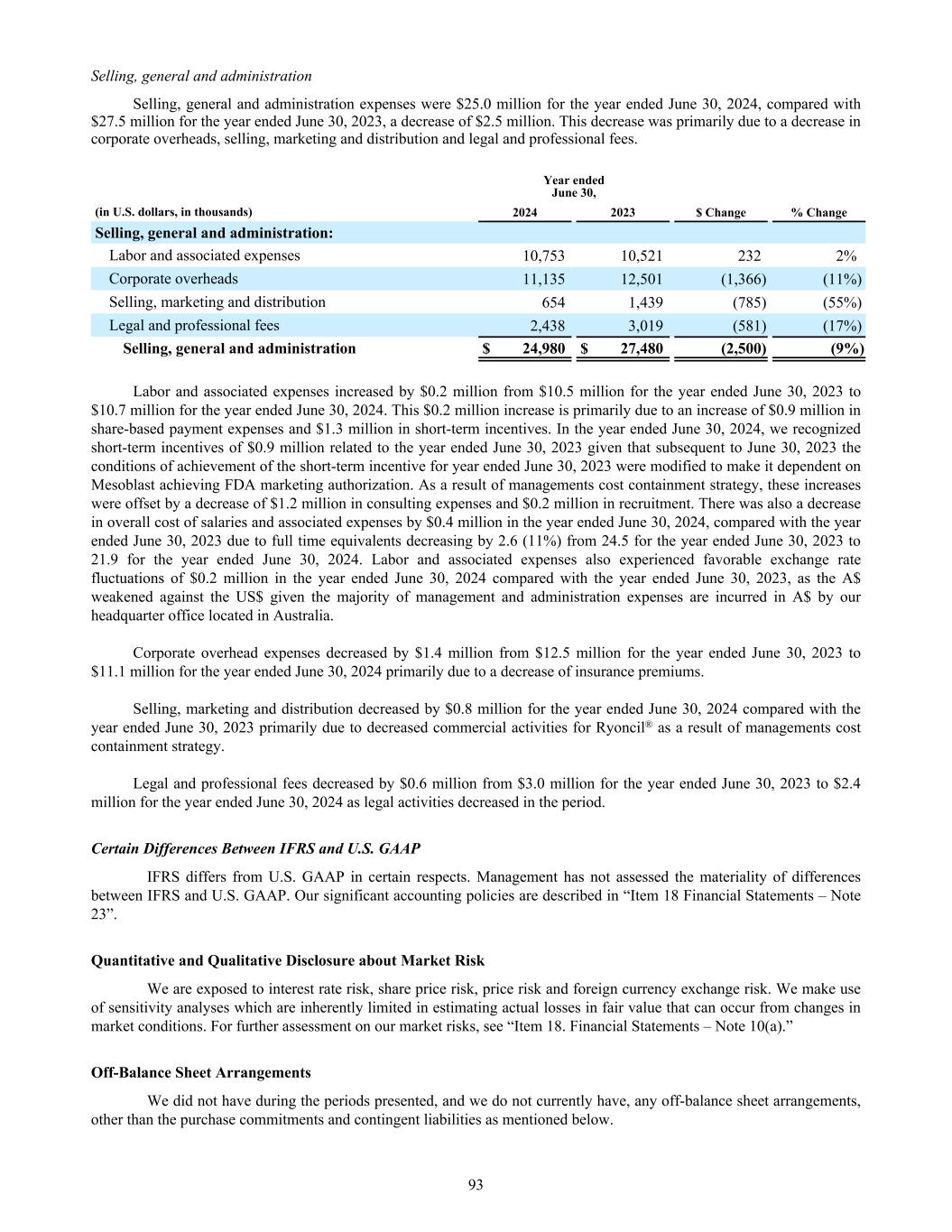 Selling, general and administration Selling, general and administration expenses were $39.3 million for the year ended June 30, 2025, compared with $25.0 million for the year ended June 30, 2024, an increase of $14.3 million. This increase was primarily due to an increase in labor and associated expenses, corporate overheads and legal and professional fees. Year ended June 30, (in U.S. dollars, in thousands) 2025 2024 $ Change % Change Selling, general and administration: Labor and associated expenses 18,734 10,753 7,981 74% Corporate overheads 11,426 11,135 291 3% Selling, marketing and distribution 4,676 654 4,022 NM Legal and professional fees 4,473 2,438 2,035 83% Selling, general and administration $ 39,309 $ 24,980 14,329 57% * NM = not meaningful. Labor and associated expenses increased by $8.0 million from $10.7 million for the year ended June 30, 2024 to $18.7 million for the year ended June 30, 2025. This increase is primarily due to an increase of $6.7 million in share-based payment expenses. In August 2024, the compensation structure for short-term incentives was revised providing all employees with the choice to elect into receiving an option grant in lieu of cash payment of their short-term incentive entitlements pertaining to the years ended June 30, 2023 and 2024. This revised structure enabled us to avoid a $2.0 million cash payment of short-term incentives. The options granted in lieu of cash resulted in a $3.3 million increase in share-based payment expenses. There was also an increase of $0.7 million in consulting expenses in the year ended June 30, 2025 compared with the year ended June 30, 2024. Corporate overhead expenses increased by $0.3 million from $11.1 million for the year ended June 30, 2024 to $11.4 million for the year ended June 30, 2025 primarily due to an increase in travel expenses. Selling, marketing and distribution increased by $4.0 million for the year ended June 30, 2025 compared with the year ended June 30, 2024 primarily due to increased commercial activities for Ryoncil® following FDA approval of the product for the treatment of pediatric SR-aGVHD in December 2024. Legal and professional fees increased by $2.0 million for the year ended June 30, 2025 compared with the year ended June 30, 2024 primarily due to expenses incurred related to the FDA approval of Ryoncil® for pediatric SR-aGVHD during the year ended June 30, 2025. Fair value remeasurement of contingent consideration Fair value remeasurement of contingent consideration was a $14.9 million loss for the year ended June 30, 2025 compared with a $9.7 million loss for the year ended June 30, 2024. Of the $14.9 million loss for the year ended June 30, 2025, $4.6 million was due to the remeasurement of contingent consideration pertaining to the acquisition of MSC assets from Osiris. This loss was a net result of changing the key assumptions of the contingent consideration valuation such as probability of success, development timelines and the increase in valuation as the time period shortens between the valuation date and the potential settlement dates of contingent consideration including the impact of receiving FDA approval for Ryoncil® in the treatment of children with SR-aGVHD in December 2024. Within the $14.9 million loss for the year ended June 30, 2025, we also recognized a loss of $10.3 million due to the remeasurement of the milestone paid in relation to the FDA approval of Ryoncil® in the treatment of children with SR- aGVHD in the United States in December 2024. The contingent consideration milestone was paid in January 2025 through the issuance of shares, which are subject to a 12-month lock-up period. If the share price decreases over the lock-up period an additional payment equal to the reduction in the share price multiplied by the amount of issued shares under that milestone payment is required to be paid. This loss reflects the fair value remeasurement of the issued shares as at June 30, 2025. 88