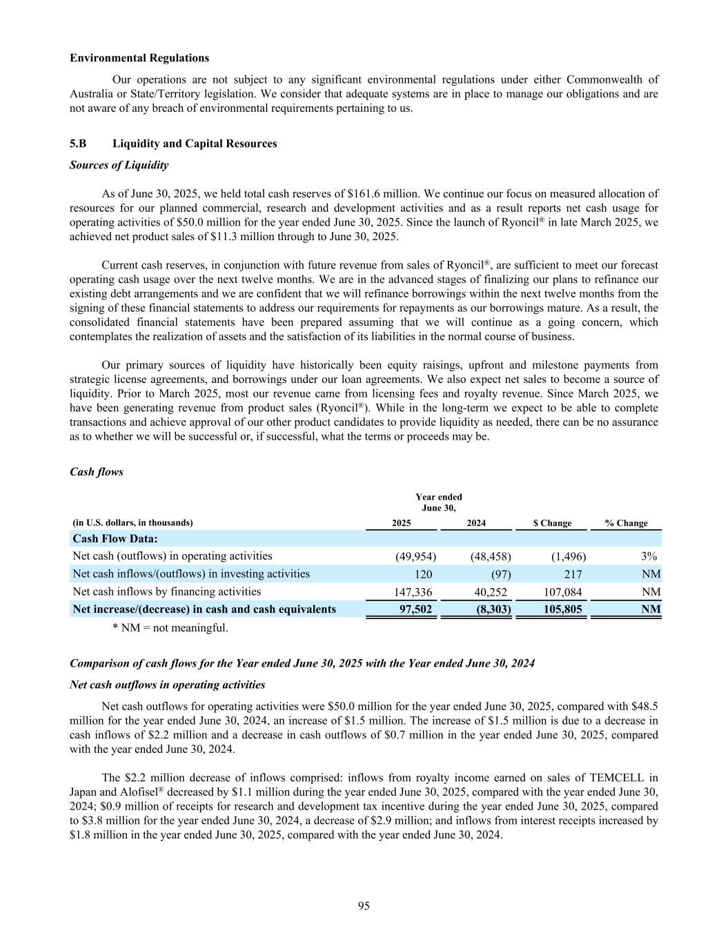 • seek regulatory and marketing approvals in multiple jurisdictions for our product candidates that successfully complete clinical studies and identify and apply for regulatory designations to facilitate development and ultimate commercialization of our products; • establish and maintain collaborations and strategic partnerships with third parties for the development and commercialization of our product candidates, or otherwise build and maintain a sales, marketing and distribution infrastructure and/or external logistics to commercialize Ryoncil® in the United States and any other products for which we may obtain marketing approval; • further develop and implement our proprietary manufacturing processes in both planar technology and our bioreactor programs, and expand our manufacturing capabilities and resources for commercial production; • seek coverage and reimbursement from third-party payors, including government and private payors for Ryoncil® and future products; • make milestone or other payments under our agreements pursuant to which we have licensed or acquired rights to intellectual property and technology; • seek to maintain, protect and expand our intellectual property portfolio; • seek to attract and retain skilled personnel; and • develop and maintain the compliance and other infrastructure necessary to support product commercialization and distribution. If we were to experience any delays or encounter issues with any of the above, including clinical holds, failed studies, inconclusive or complex results, safety or efficacy issues, or other regulatory challenges that require longer follow- up of existing studies, additional studies, or additional supportive studies in order to pursue marketing approval, it could further increase the costs associated with the above. Further, the net operating losses we incur may fluctuate significantly from quarter to quarter and year to year, such that a period-to-period comparison of our results of operations may not be a good indication of our future performance. To the extent that we raise additional capital through the sale of equity or convertible debt securities, your ownership interest may be diluted, and the terms of these securities may include liquidation or other preferences that adversely affect your rights as a shareholder or as a holder of the ADSs. Debt financing, if available, may involve agreements that include covenants limiting or restricting our ability to take certain actions, such as incurring additional debt, making capital expenditures or declaring dividends. If we raise additional funds through strategic collaborations or partnerships, or marketing, distribution or licensing arrangements with third parties, we may be required to do so at an earlier stage than would otherwise be ideal and/or may have to limit valuable rights to our intellectual property, technologies, product candidates or future revenue streams, or grant licenses or other rights on terms that are not favorable to us. Furthermore, any additional fundraising efforts may divert our management from their day-to-day activities, which may adversely affect our ability to commercialize Ryoncil® in the United States as well as develop and commercialize our product candidates. As of June 30, 2025, we held total cash reserves of $161.6 million. We continue our focus on measured allocation of resources for our planned commercial, research and development activities and as a result reports net cash usage for operating activities of $50.0 million for the year ended June 30, 2025. Since the launch of Ryoncil® in late March 2025, we achieved net product sales of $11.3 million through to June 30, 2025. Current cash reserves, in conjunction with future revenue from sales of Ryoncil®, are sufficient to meet our forecast operating cash usage over the next twelve months. We are in the advanced stages of finalizing our plans to refinance our existing debt arrangements and we are confident that we will refinance our borrowings within the next twelve months from the signing of these financial statements to address our requirements for repayments as our borrowings mature. As a result, the consolidated financial statements have been prepared assuming that we will continue as a going concern, which contemplates the realization of assets and the satisfaction of its liabilities in the normal course of business. If we are unable to obtain adequate funding or partnerships beyond the 12-month period we may not be able to continue as a going concern, and our shareholders and holders of the ADSs may lose some or all of their investment in Mesoblast. See Note 1(i) of our accompanying financial statements. The terms of our loan facilities with funds associated with Oaktree Capital Management, L.P. (“Oaktree”) and NovaQuest Capital Management, L.L.C. (“NovaQuest”) could restrict our operations, particularly our ability to respond to changes in our business or to take specified actions. On November 19, 2021, we entered into a loan agreement and guaranty with Oaktree, with a secured five-year senior debt facility. The principal balance at the end of the three-year interest only period was $52.2 million, which 8