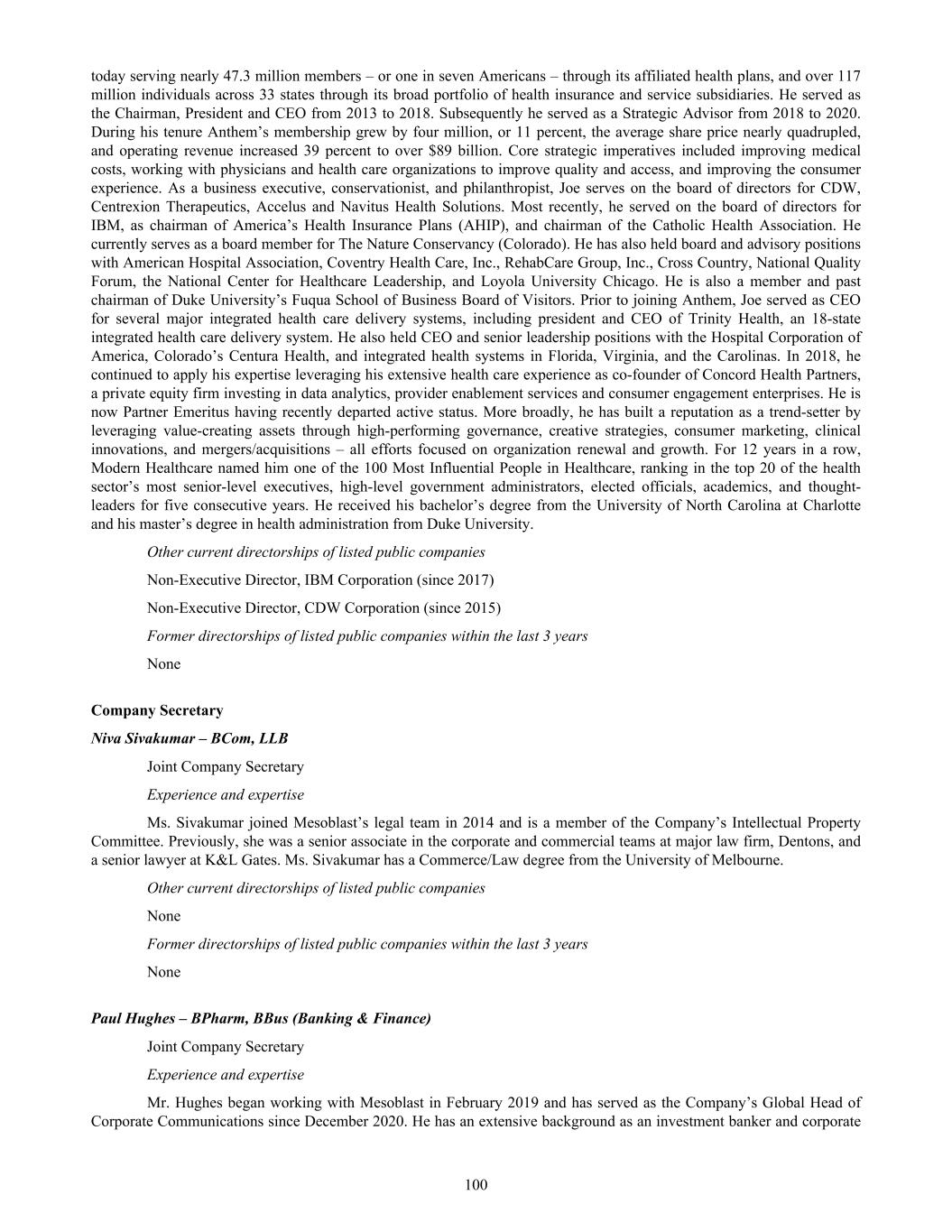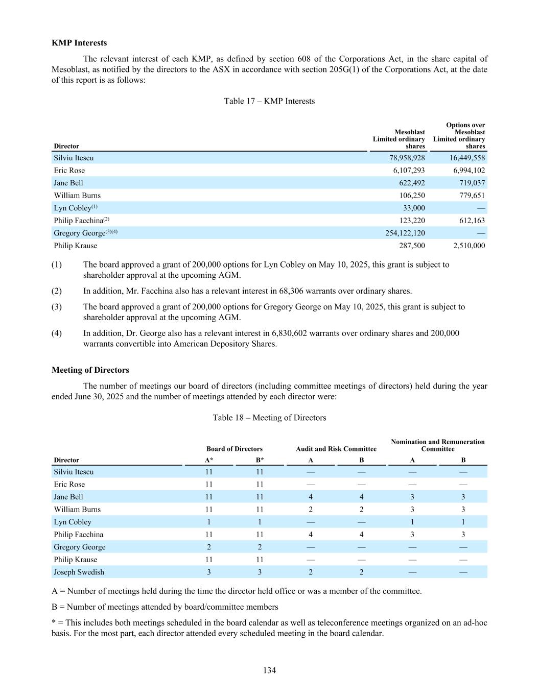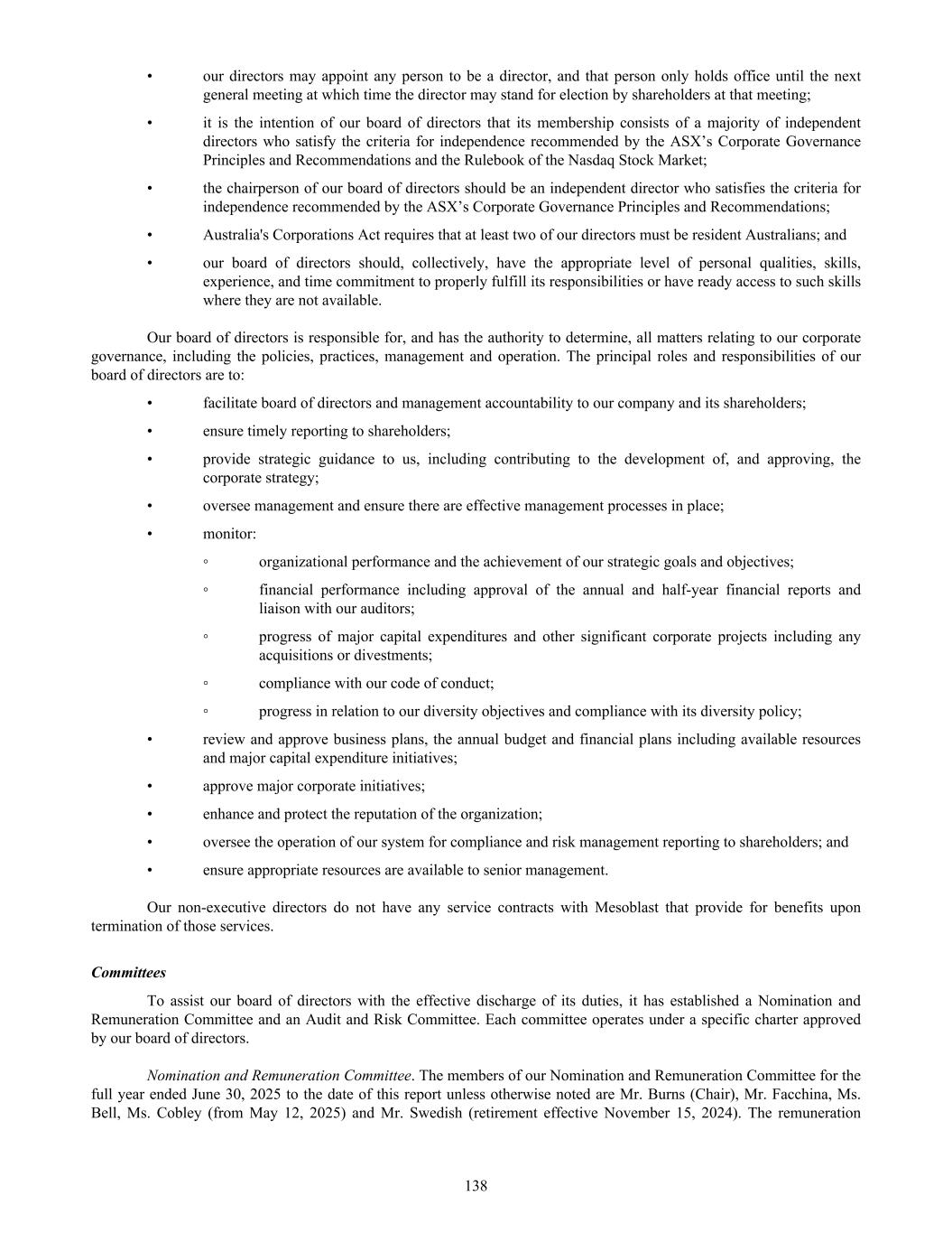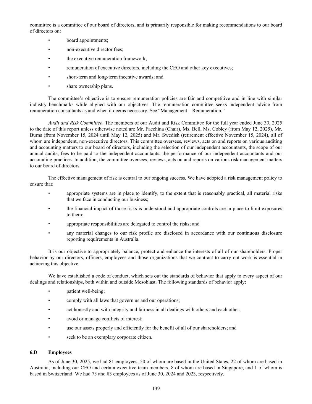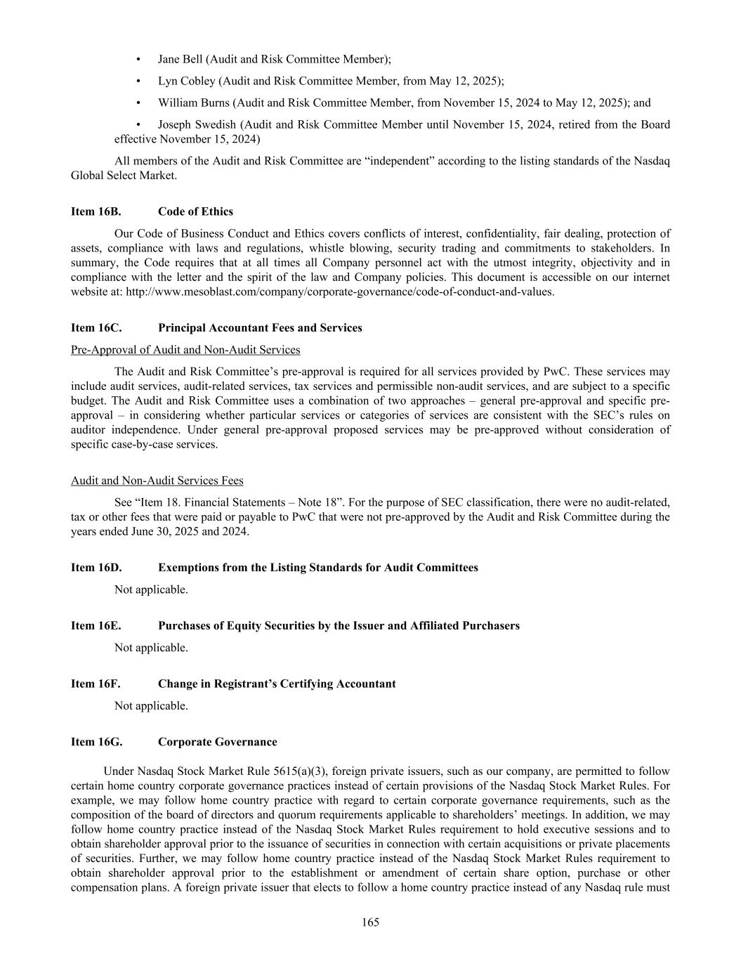 • Jane Bell (Audit and Risk Committee Member); • Lyn Cobley (Audit and Risk Committee Member, from May 12, 2025); • William Burns (Audit and Risk Committee Member, from November 15, 2024 to May 12, 2025); and • Joseph Swedish (Audit and Risk Committee Member until November 15, 2024, retired from the Board effective November 15, 2024) All members of the Audit and Risk Committee are “independent” according to the listing standards of the Nasdaq Global Select Market. Item 16B. Code of Ethics Our Code of Business Conduct and Ethics covers conflicts of interest, confidentiality, fair dealing, protection of assets, compliance with laws and regulations, whistle blowing, security trading and commitments to stakeholders. In summary, the Code requires that at all times all Company personnel act with the utmost integrity, objectivity and in compliance with the letter and the spirit of the law and Company policies. This document is accessible on our internet website at: http://www.mesoblast.com/company/corporate-governance/code-of-conduct-and-values. Item 16C. Principal Accountant Fees and Services Pre-Approval of Audit and Non-Audit Services The Audit and Risk Committee’s pre-approval is required for all services provided by PwC. These services may include audit services, audit-related services, tax services and permissible non-audit services, and are subject to a specific budget. The Audit and Risk Committee uses a combination of two approaches – general pre-approval and specific pre- approval – in considering whether particular services or categories of services are consistent with the SEC’s rules on auditor independence. Under general pre-approval proposed services may be pre-approved without consideration of specific case-by-case services. Audit and Non-Audit Services Fees See “Item 18. Financial Statements – Note 18”. For the purpose of SEC classification, there were no audit-related, tax or other fees that were paid or payable to PwC that were not pre-approved by the Audit and Risk Committee during the years ended June 30, 2025 and 2024. Item 16D. Exemptions from the Listing Standards for Audit Committees Not applicable. Item 16E. Purchases of Equity Securities by the Issuer and Affiliated Purchasers Not applicable. Item 16F. Change in Registrant’s Certifying Accountant Not applicable. Item 16G. Corporate Governance Under Nasdaq Stock Market Rule 5615(a)(3), foreign private issuers, such as our company, are permitted to follow certain home country corporate governance practices instead of certain provisions of the Nasdaq Stock Market Rules. For example, we may follow home country practice with regard to certain corporate governance requirements, such as the composition of the board of directors and quorum requirements applicable to shareholders’ meetings. In addition, we may follow home country practice instead of the Nasdaq Stock Market Rules requirement to hold executive sessions and to obtain shareholder approval prior to the issuance of securities in connection with certain acquisitions or private placements of securities. Further, we may follow home country practice instead of the Nasdaq Stock Market Rules requirement to obtain shareholder approval prior to the establishment or amendment of certain share option, purchase or other compensation plans. A foreign private issuer that elects to follow a home country practice instead of any Nasdaq rule must 165