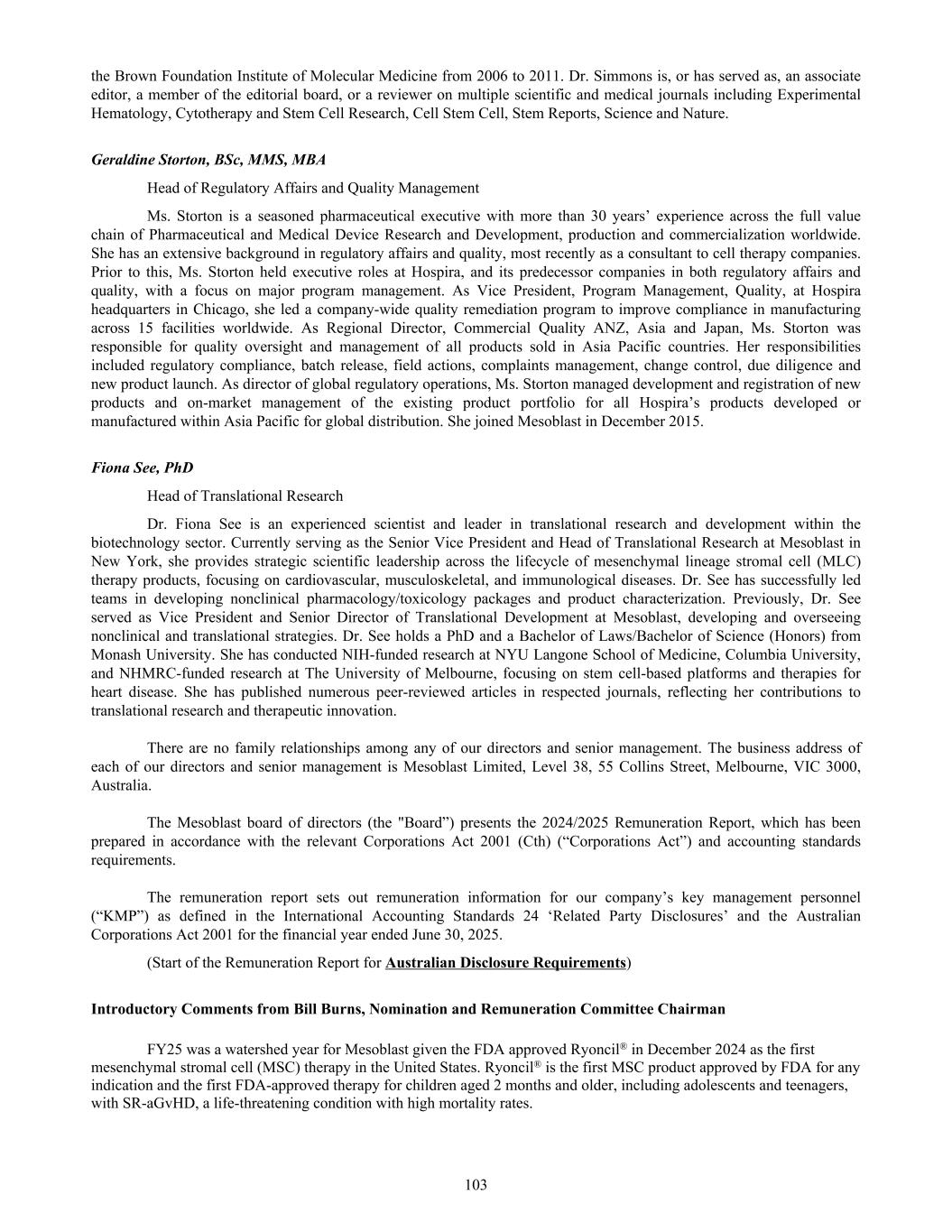 MESOBLAST LIMITED 2025 ANNUAL REPORT 1 MESSAGE FROM THE CHAIR Dear fellow shareholders, I am delighted to be writing this report to you after such a groundbreaking year for the Company. The financial year ending 30 June 2025 is marked by momentous progress, with United States Food and Drug Administration’s (FDA) approval of our lead product Ryoncil® (remestemcel-L-rknd) for pediatric steroid-refractory acute graft-versus-host disease (SR-aGvHD) – the first mesenchymal stromal cell therapy ever approved by the FDA. This milestone is the culmination of many years of scientific, regulatory, and clinical excellence and commitment. I wish to extend my deepest gratitude to our Executive team led very capably and with great resilience by our Chief Executive Dr Silviu Itescu, and to our whole staff for their dedication, creativity, and persistence. The FDA approval of Ryoncil® is not simply a regulatory milestone: it is a turning point in our transition from development to commercialization, and a powerful validation of Mesoblast’s scientific platform, manufacturing rigor, and clinical strategy. The commercial launch of Ryoncil® has been executed flawlessly with strong uptake to date and growing sales. We are very pleased with the commercial and government reimbursement that is now in place, as we ensure that all children with this devastating disease have access to our life-saving treatment. While continuing to manage cash spend carefully, the Mesoblast management team is also extending Ryoncil® use to additional indications in children and adults with severe inflammatory conditions, making this a very valuable franchise. Achieving a first FDA approval and demonstrating successful product commercialization provide important validation for our whole strategy and value chain of our technology platforms. The learnings from Ryoncil® are being adapted to the rest of the company’s pipeline, and will hold us in good stead as we work towards further FDA approvals for our cardiovascular and back pain indications for our second generation stromal cell technology platform rexlemestrocel-L. I would also like to acknowledge the unique skillsets of my fellow Board members, enhanced this year with the appointments of Dr Gregory George MD PhD and Ms Lyn Cobley whose operational and financial guidance will be of immeasurable benefit to our management team. Finally, to our shareholders — thank you for your patience, belief, and partnership in this journey. We are now a commercial company with an approved therapy, and I remain confident that you will see the compounding rewards of your support. Yours sincerely, Jane C. Bell AM Chair of the Board Jane C. Bell AM Chair of the Board