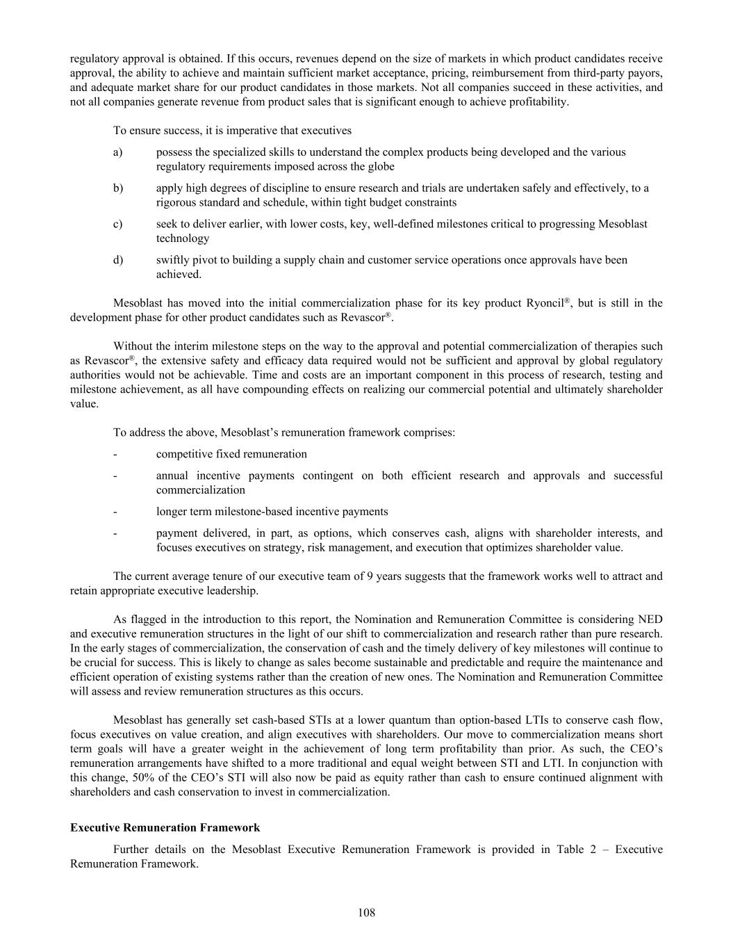 During the reporting period, Mesoblast continued with an online performance and merit management program and integrated an online professional development program that links the recording of participation in professional development aligned to job role. The online performance management program enables employees to track their performance and receive regular feedback from their manager. The formal annual review process assesses the individual employee’s performance against objectives and quantifiable criteria that are aligned to the Mesoblast business plan, reducing the risk of bias. All employees below the executive level participated in this program during the period. 5. Product Quality and Patient Safety 5.1 Scientific Research and Innovation Over the past decade there has been a surge of interest internationally in the cutting-edge science of cellular medicines and their use in treating a wide range of diseases. Mesoblast is a commercial stage biotechnology company with a significant clinical pipeline of advanced staged product candidates. We work in close collaborative associations with leading cell therapy research centers, as well as having our own in-house R&D laboratories and specialists. We ensure rigorous scientific investigations are performed with well-characterized cell populations in order to understand mechanisms of action for each potential medical application. We undertake extensive pre-clinical translational studies to guide subsequent clinical trials. 5.2 Use of Stem Cells Mesoblast’s novel allogeneic product candidates are based on rare (approximately 1:100,000 in bone marrow) mesenchymal lineage cells that respond to tissue damage, secreting mediators that promote tissue repair and modulate immune responses. Mesenchymal lineage cells are collected from the bone marrow of healthy adult donors, and proprietary processes are utilized to expand them to a uniform, well-characterized, and highly reproducible cell population. This enables manufacturing an industrial scale for commercial purposes. Mesoblast’s cells can be administered to patients without the need for donor-recipient matching or recipient immune suppression. The distinction between embryonic stem cells (“ESCs”) and non-ESCs, such as our mesenchymal lineage cells, can be easily misunderstood by the public and has the potential to create negative public attitudes toward cell therapy. As Mesoblast’s cells are not ESCs, we minimize the risk of being exposed to ethical, legal, or social concerns that have arisen in relation to the collection and use of ESCs. 5.3 Use of Animal in Research Mesoblast is committed to the welfare and humane treatment of animals and only undertakes development studies in animal models where required by applicable regulatory bodies. These studies are undertaken by expert third-party providers who are specialists in the management of animals and their welfare. Mesoblast’s approach to product development is to ensure rigorous scientific investigations are performed with well-characterized cell populations in order to understand mechanisms of action for each potential indication. Extensive preclinical translational studies guide clinical trials that are structured to meet stringent safety and efficacy criteria set by international regulatory agencies. In the United States, where the majority of our clinical development takes place, all of our product candidates are regulated as biological products by the Center for Biologics Evaluation and Research (“CBER”) in the FDA. Biological products are subject to federal regulation under the Federal Food, Drug, and Cosmetic Act (“FDCA”), the Public Health Service (“PHS”) Act, and other federal, state, local and foreign statutes and regulations. Both the FDCA and the PHS Act, as applicable, and their corresponding regulations govern, among other things, the testing, manufacturing, safety, efficacy, labeling, packaging, storage, record keeping, distribution, import, export, reporting, advertising and other promotional practices involving drugs and biological products. The process required by the FDA before a biological product may be marketed in the U.S. generally involves years of studies and many complex steps. The first of these is completion of nonclinical laboratory studies, meaning in vivo and in vitro experiments in which an investigational product is studied prospectively in a test system under laboratory conditions to determine its safety, must be conducted according to Good Laboratory Practice (“GL”) regulations, as well 50