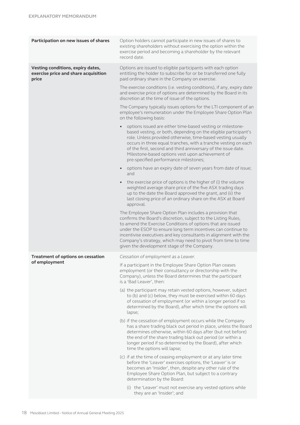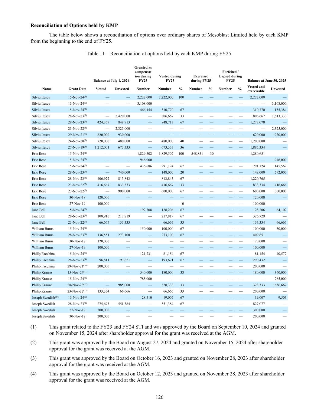 Dividend yield The Company has yet to pay a dividend so it has been assumed the dividend yield on the shares underlying the options will be 0%. Risk free interest rate This has been sourced from the Reserve Bank of Australia historical interest rate tables for government bonds. Model inputs The model inputs for the valuations of options approved and granted during the year ended June 30, 2025 are as follows: Series Valuation date(1) Exercise price per share A$ Share price at valuation date A$ Expected share price volatility Life(2) Dividend yield Risk-free interest rate 91 15-Nov-24 0.32 1.57 72.64% 5.3 yrs 0% 4.26% 95 18-Jul-24 1.35 1.11 72.68% 5.8 yrs 0% 3.99% 96 24-Sep-24 0.01 1.06 72.55% 2.6 yrs 0% 3.51% 96a 24-Sep-24 0.01 1.06 72.55% 0.9 yrs 0% 3.51% 96b 24-Sep-24 0.01 1.06 72.55% 2.6 yrs 0% 3.51% 96c 15-Nov-24 0.01 1.57 72.64% 2.6 yrs 0% 4.26% 96d 15-Nov-24 0.01 1.57 72.64% 0.8 yrs 0% 4.26% 97 03-Oct-24 1.07 1.35 72.55% 5.8 yrs 0% 3.63% 97a 16-Dec-24 0.97 1.83 72.65% 5.7 yrs 0% 3.95% 97b 17-Dec-24 0.97 1.94 72.65% 5.7 yrs 0% 3.93% 97c 20-Dec-24 1.07 2.42 73.89% 5.6 yrs 0% 4.08% 97d 25-Jun-25 1.07 1.61 73.60% 5.2 yrs 0% 3.43% 98 17-Apr-25 1.44 1.65 73.83% 5.5 yrs 0% 3.58% 99 15-Nov-24 0.97 1.57 72.64% 5.7 yrs 0% 4.26% 100 20-Dec-24 2.01 2.42 73.89% 5.9 yrs 0% 4.08% 101 24-Apr-25 1.83 1.79 73.83% 5.6 yrs 0% 3.56% 102 07-May-25 1.83 1.72 73.77% 5.6 yrs 0% 3.59% 103 25-Jun-25 1.89 1.61 73.60% 5.8 yrs 0% 3.43% 104(3) 30-Jun-25 1.72 1.66 73.57% 5.8 yrs 0% 3.47% 105 06-Jun-25 1.72 1.76 73.64% 5.9 yrs 0% 3.57% 106 05-Jun-25 1.72 1.77 73.65% 5.9 yrs 0% 3.54% (1) Valuation date is the date at which the entity and the employee agree to a share-based payment arrangement, being when the entity and the employee have a shared understanding of the terms and conditions of the arrangement. (2) Expected life after factoring likely early exercise. (3) Fair value estimated at June 30, 2025 as the valuation date under IFRS2 has not been met as of June 30, 2025. The closing share market price of an ordinary share of Mesoblast Limited on the ASX as of June 30, 2025 was A$1.66. 228