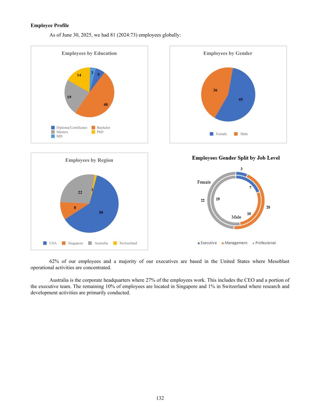 Table – Gender diversity statistics* Gender FY25 Senior Executives** FY25 Total Workforce FY24 Senior Executives** FY24 Total Workforce Male 7 36 7 35 Female 3 45 3 38 Other — — — — % Female 30% 56% 30% 52% *Based on number of employees as at June 30. Excludes contractors and consultants. **A senior executive position is one held by an executive who reports directly to the Chief Executive. Every employee, consultant and service provider has the right to work with Mesoblast in an environment that is safe, and free from intimidation, harassment, and abuse. Mesoblast prohibits harassment for any reason, including veteran status, uniform service member status, or any other protected class under federal, state, or local law. Inappropriate behavior, including verbal or physical conduct by any individual that harasses another, disrupts another’s work performance, or creates an intimidating, offensive, abusive, or hostile workplace, is not tolerated. In addition, we will not tolerate comments, jokes, or materials, including emails, which others might consider offensive. All Mesoblast personnel are required to complete mandatory training on an annual basis to recognize and deal with inappropriate behavior in our workplaces, including the New York City Commission on Human Rights – Accredited Program: Confronting Sexual Harassment; Tools & Strategies to Create a Harassment Free Workplace and Mesoblast’s Fair Treatment policy. 4.2 Health and Safety Mesoblast provides a workplace that is clean and safe for all associates and one that complies with health and safety laws. As an organization whose activities are predominantly office and laboratory based, Mesoblast chooses to track its safety record using total recordable incident frequency rate (“TRIFR”) i.e., number of recorded injuries for each one million hours worked. No incidents were recorded for FY25. An Environment Health and Safety Management System and supporting policies have been developed and aligned for each jurisdiction in preparation for company wide training. Mesoblast continued to implement hybrid/flexible working arrangements and the employee assistance program was made available across all sites. 4.3 Recruitment, Development and Retention Mesoblast operates at the forefront of a highly specialized industry and we recognize that our talented people are key to developing our cell therapy technology. Our policies and procedures follow equal employment opportunities principles for fair treatment, including diversity and compensation. Our employees are given equal access to job opportunities and promotions based on capability, performance and potential for growth and progression as part of our retention program. Mesoblast’s recruitment process enables our line managers to prepare a job description that outlines accountabilities and selection criteria that emphasize the skills, knowledge and experience. Job criteria and interview guides are prepared for each role advertised to ensure consistency across all the interviews. Jobs are advertised through multiple channels based on the specialization of the job role. All job roles are published on the Mesoblast intranet site providing transparency to all employees within the company and an equal opportunity to apply. Job descriptions are prepared in a way that enables employees to consider lateral moves based on competence rather than expertise in years of service. In FY25, the voluntary turnover rate was approximately 8% with 44% male and 56% females departing the Company. Exit interviews are conducted with all departing employees and trends are monitored so that actions to minimize the turnover can be taken. Mesoblast employed one female and one male for two approved replacement roles. While acting and higher duty opportunities were minimal during this period, job profiles were prepared to enable existing employees to consider lateral moves based on competence rather than years of service, where appropriately credentialed. We provide opportunities for all colleagues to participate in professional training and education so they can enhance their skill sets and career. During FY25, employees were given the opportunity to participate in a development program that is linked to the annual Performance Management System. 49