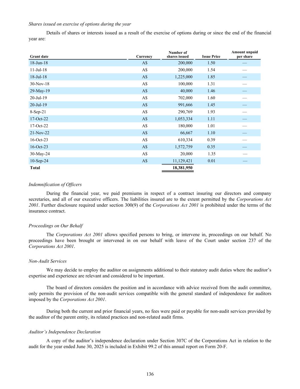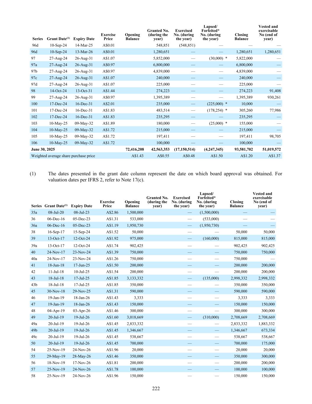 96d 10-Sep-24 14-Mar-25 A$0.01 548,851 (548,851) — — — 96d 10-Sep-24 13-Mar-26 A$0.01 1,280,651 — — 1,280,651 1,280,651 97 27-Aug-24 26-Aug-31 A$1.07 5,852,000 — (30,000) * 5,822,000 — 97a 27-Aug-24 26-Aug-31 A$0.97 6,800,000 — — 6,800,000 — 97b 27-Aug-24 26-Aug-31 A$0.97 4,839,000 — — 4,839,000 — 97c 27-Aug-24 26-Aug-31 A$1.07 240,000 — — 240,000 — 97d 27-Aug-24 26-Aug-31 A$1.07 225,000 — — 225,000 — 98 14-Oct-24 13-Oct-31 A$1.44 274,223 — — 274,223 91,408 99 27-Aug-24 26-Aug-31 A$0.97 1,395,389 — — 1,395,389 930,261 100 17-Dec-24 16-Dec-31 A$2.01 235,000 — (225,000) * 10,000 — 101 17-Dec-24 16-Dec-31 A$1.83 483,514 — (178,254) * 305,260 77,986 102 17-Dec-24 16-Dec-31 A$1.83 235,295 — — 235,295 — 103 10-May-25 09-May-32 A$1.89 180,000 — (25,000) * 155,000 — 104 10-May-25 09-May-32 A$1.72 215,000 — — 215,000 — 105 10-May-25 09-May-32 A$1.72 197,411 — — 197,411 98,705 106 10-May-25 09-May-32 A$1.72 100,000 — — 100,000 — June 30, 2025 72,416,208 42,563,353 (17,150,514) (4,247,345) 93,581,702 51,019,572 Weighted average share purchase price A$1.43 A$0.55 A$0.48 A$1.50 A$1.20 A$1.37 Series Grant Date(1) Expiry Date Exercise Price Opening Balance Granted No. (during the year) Exercised No. (during the year) Lapsed/ Forfeited* No. (during the year) Closing Balance Vested and exercisable No (end of year) (1) The dates presented in the grant date column represent the date on which board approval was obtained. For valuation dates per IFRS 2, refer to Note 17(c). 35a 08-Jul-20 08-Jul-23 A$2.86 1,500,000 — (1,500,000) — — 36 06-Dec-16 05-Dec-23 A$1.31 533,000 — (533,000) — — 36a 06-Dec-16 05-Dec-23 A$1.19 1,950,730 — (1,950,730) — — 38 16-Sep-17 15-Sep-24 A$1.52 50,000 — — 50,000 50,000 39 13-Oct-17 12-Oct-24 A$1.92 975,000 — (160,000) 815,000 815,000 39a 13-Oct-17 12-Oct-24 A$1.74 902,425 — — 902,425 902,425 40 24-Nov-17 23-Nov-24 A$1.39 750,000 — — 750,000 750,000 40a 24-Nov-17 23-Nov-24 A$1.26 750,000 — — 750,000 — 41 18-Jun-18 17-Jun-25 A$1.50 200,000 — — 200,000 200,000 42 11-Jul-18 10-Jul-25 A$1.54 200,000 — — 200,000 200,000 43 18-Jul-18 17-Jul-25 A$1.85 3,133,332 — (135,000) 2,998,332 2,998,332 43b 18-Jul-18 17-Jul-25 A$1.85 350,000 — — 350,000 350,000 45 30-Nov-18 29-Nov-25 A$1.31 590,000 — — 590,000 590,000 46 19-Jan-19 18-Jan-26 A$1.43 3,333 — — 3,333 3,333 47 19-Jan-19 18-Jan-26 A$1.43 150,000 — — 150,000 150,000 48 04-Apr-19 03-Apr-26 A$1.46 300,000 — — 300,000 300,000 49 20-Jul-19 19-Jul-26 A$1.60 3,018,669 — (310,000) 2,708,669 2,708,669 49a 20-Jul-19 19-Jul-26 A$1.45 2,833,332 — — 2,833,332 1,883,332 49b 20-Jul-19 19-Jul-26 A$1.45 1,346,667 — — 1,346,667 673,334 49c 20-Jul-19 19-Jul-26 A$1.45 538,667 — — 538,667 538,667 50 20-Jul-19 19-Jul-26 A$1.45 700,000 — — 700,000 175,000 54 25-Nov-19 24-Nov-26 A$1.96 20,000 — — 20,000 20,000 55 29-May-19 28-May-26 A$1.46 350,000 — — 350,000 300,000 56 18-Nov-19 17-Nov-26 A$1.81 200,000 — — 200,000 200,000 57 25-Nov-19 24-Nov-26 A$1.78 100,000 — — 100,000 100,000 58 25-Nov-19 24-Nov-26 A$1.96 150,000 — — 150,000 150,000 Series Grant Date(1) Expiry Date Exercise Price Opening Balance Granted No. (during the year) Exercised No. (during the year) Lapsed/ Forfeited* No. (during the year) Closing Balance Vested and exercisable No (end of year) 222
