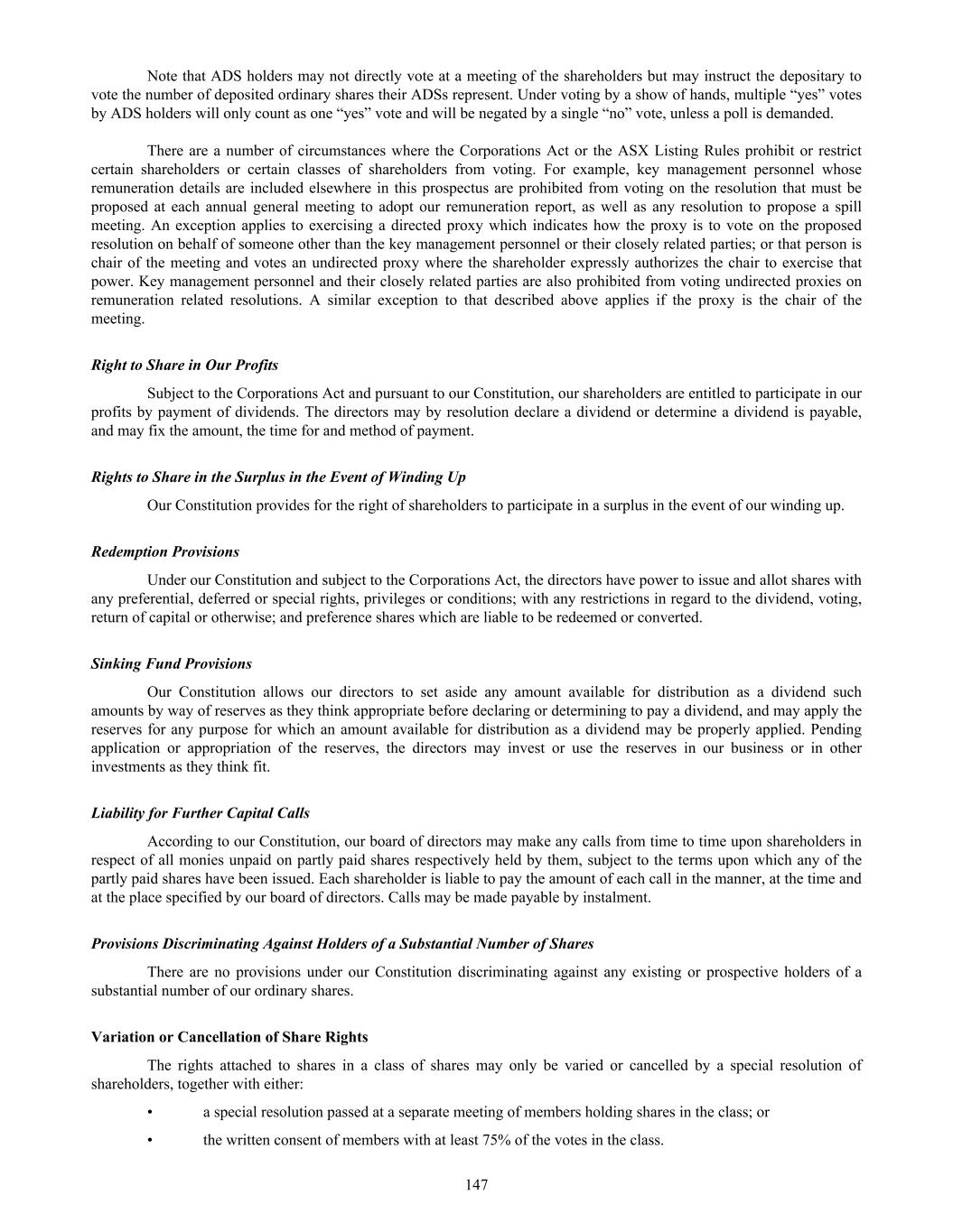maintenance of effective disclosure and financial controls. Our management and other personnel will need to continue to devote a substantial amount of time to these compliance initiatives, and we will need to add additional personnel and build our internal compliance infrastructure. Moreover, these rules and regulations have increased and will continue to increase our legal and financial compliance costs and will make some activities more time-consuming and costly. These laws and regulations could also make it more difficult and expensive for us to attract and retain qualified persons to serve on our board of directors, our board committees or as our senior management. Furthermore, if we are unable to satisfy our obligations as a public company, we could be subject to delisting of the ADSs, fines, sanctions and other regulatory action and potentially regulatory investigations and enforcement and/or civil litigation. We have never declared or paid dividends on our ordinary shares, and we do not anticipate paying dividends in the foreseeable future. Therefore, you must rely on price-appreciation of our ordinary shares or ADSs for a return on your investment. We have never declared or paid cash dividends on our ordinary shares. For the foreseeable future, we currently intend to retain all available funds and any future earnings to support our operations and to finance the growth and development of our business. Any future determination to declare cash dividends will be made at the discretion of our board of directors, subject to compliance with applicable laws and covenants under the loan facilities with Oaktree and NovaQuest or other current or future credit facilities, which may restrict or limit our ability to pay dividends, and will depend on our financial condition, operating results, capital requirements, general business conditions and other factors that our board of directors may deem relevant. We do not anticipate paying any cash dividends on our ordinary shares in the foreseeable future. As a result, a return on your investment in our ordinary shares or ADSs will likely only occur if our ordinary share or ADS price appreciates. There is no guarantee that our ordinary shares or ADSs will appreciate in value in the future. Australian takeover laws may discourage takeover offers being made for us or may discourage the acquisition of a significant position in our ordinary shares or ADSs. We are incorporated in Australia and are subject to the takeover laws of Australia. Among other things, we are subject to the Australian Corporations Act 2001 (the “Corporations Act”). Subject to a range of exceptions, the Corporations Act prohibits the acquisition of a direct or indirect interest in our issued voting shares if the acquisition of that interest will lead to a person’s voting power in us increasing to more than 20%, or increasing from a starting point that is above 20% and below 90%. Australian takeover laws may discourage takeover offers being made for us or may discourage the acquisition of a significant position in our ordinary shares. This may have the ancillary effect of entrenching our board of directors and may deprive or limit our shareholders’ opportunity to sell their ordinary shares or ADSs and may further restrict the ability of our shareholders to obtain a premium from such transactions. Significant disruptions of information technology systems, data security breaches or unauthorized disclosure of sensitive data could adversely affect our business by exposing us to liability and affect our business and reputation. We are increasingly dependent on critical, complex, and interdependent information technology systems (IT systems), including cloud-based software and external servers, some of which are managed or hosted by third parties, to support business processes as well as internal and external communications. The information and data processed and stored in our IT systems, and those of our research collaborators, CROs, contract manufacturers, suppliers, distributors, or other third parties for which we depend to operate our business, may be vulnerable to cybersecurity breaches from unauthorized activity by our employees, contractors or malware, hacking, business email compromise, phishing or other cyberattacks directed by other parties. Such breaches can result in loss, damage, denial-of-service, unauthorized access or misappropriation and may pose a risk that sensitive data, including our intellectual property, trade secrets or personal information of our employees, patients, customers or other business partners may be exposed to unauthorized persons or to the public. In addition, our increased reliance on personnel working from home may negatively impact productivity, or disrupt, delay, or otherwise adversely impact our business. Working remotely could increase our cybersecurity risk, create data accessibility concerns, and make us more susceptible to communication disruptions, any of which could adversely impact our business operations or delay necessary interactions with local and federal regulators, manufacturing sites, clinical trial sites, and other third parties. The rapidly moving nature of technology and the increasing sophistication of cybersecurity threats, may mean our measures to prevent, respond to and minimize such risks may be ineffective. If a material incident or interruption were to occur, it could result in a disruption of our development programs and future commercial operations, including due to a loss, corruption or unauthorized disclosure of our proprietary or sensitive information. Additionally, the costs to the company to investigate and mitigate cybersecurity incidents could be significant. Any disruption, security breach, or action 38