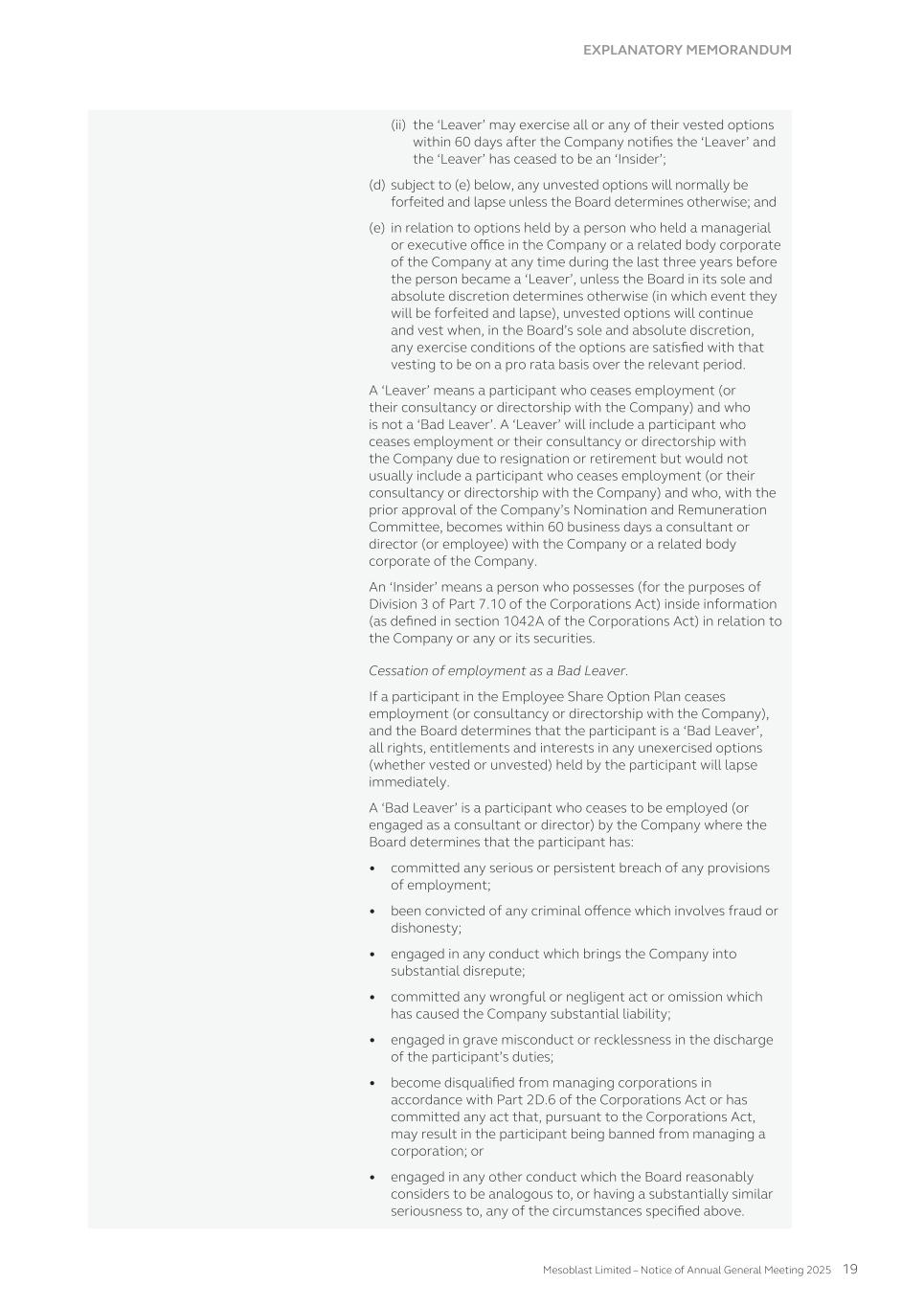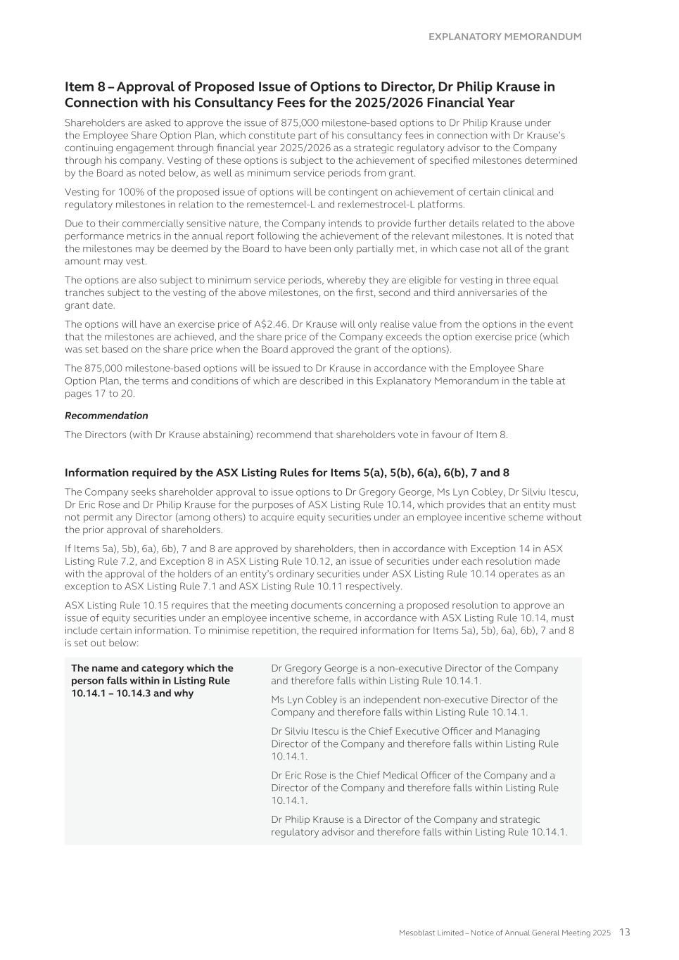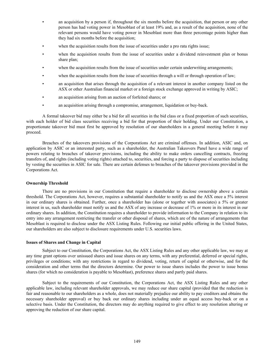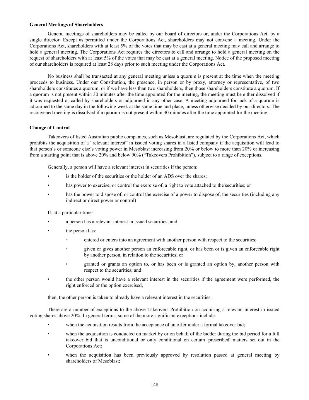 submit to Nasdaq, in advance, a written statement from an independent counsel in such issuer’s home country certifying that the issuer’s practices are not prohibited by the home country’s laws. We submitted such a written statement to Nasdaq. Other than as set forth below, we currently intend to comply with the corporate governance listing standards in the Nasdaq Stock Market Rules to the extent possible under Australian law. However, we may choose to change such practices to follow home country practice in the future. The Nasdaq Stock Market Rules require that a listed company specify that the quorum for any meeting of the holders of share capital be at least 33 1/3% of the outstanding shares of the company’s common voting stock. We follow our home country practice, rather than complying with this rule. Consistent with Australian law, our constitution does not require a quorum of at least 33 1/3% of the issued voting shares of Mesoblast for any general meeting of its shareholders. Our constitution provides that a quorum for a general meeting of our shareholders constitutes two shareholders present in person, by proxy, by attorney, or, where the shareholders is a body corporate, by representative. This provision and our practice of holding meetings with this quorum are not prohibited by the ASX Listing Rules or any other Australian law. In addition, we follow home country practice instead of Nasdaq Rule 5635(d), which requires a company to obtain shareholder approval for an issuance of securities (other than a public offering) that equals of 20% or more of the outstanding voting power in the company before such issuance. This Nasdaq rule is inconsistent with an ASX Listing Rule that provides a company cannot issue a number of securities over any rolling 12-month period exceeding 15% of the outstanding capital of the company without approval of shareholders but subject to certain exceptions such as pro-rata offers of securities to all shareholders. Lastly,we follow home country practice instead of Nasdaq Rule 5605(b)(1),which requires a majority of the board of directors to be comprised of independent directors.The Nasdaq and ASX definitions of what constitute an independent director are not identical. The ASX, unlike Nasdaq, permits an issuer to establish its own materiality threshold for determining whether a transaction between a director and an issuer affects the director’s status as independent and it does not require that a majority of the issuer’s board of directors be independent, as long as the issuer publicly discloses that fact. We believe that our Board composition is consistent with the requirements of the ASX and that it is appropriate and typical of generally accepted business practices in Australia. Item 16H. Mine Safety Disclosure Not applicable. Item 16I. Disclosure Regarding Foreign Jurisdiction that Prevent Inspections Not applicable. Item 16J. Insider Trading Policies We have a Share Trading Policy (“Policy”) which sets out the policy and procedures governing the purchase, sale and other dispositions of the Company’s securities and applies to directors, officers, employees, contractors and consultants of the Company and its subsidiaries ("Mesoblast Personnel"). The Policy aims to (i) restrict Mesoblast Personnel in possession of "inside information" from trading in our securities and (ii) ensure compliance with all applicable securities laws, rules and regulations, and listing standards. We have filed the Policy as Exhibit 11.1 to this Annual Report on Form 20-F. Item 16K. Cybersecurity The Company’s cybersecurity strategy is designed to provide a comprehensive approach to securing cybersecurity risks across our technology stack, governance framework, and human elements for our operations globally. Cybersecurity risk management is a critical component of our broader risk management strategy. Our cybersecurity program is built on industry best practices and is designed to proactively identify, assess, and mitigate cybersecurity risks, including threats associated with the use of all third-party service providers. Our cybersecurity risk assessment framework categorizes risks based on their potential impact and severity, and the Company implements targeted risk treatment plans to ensure robust protection and resilience. 166