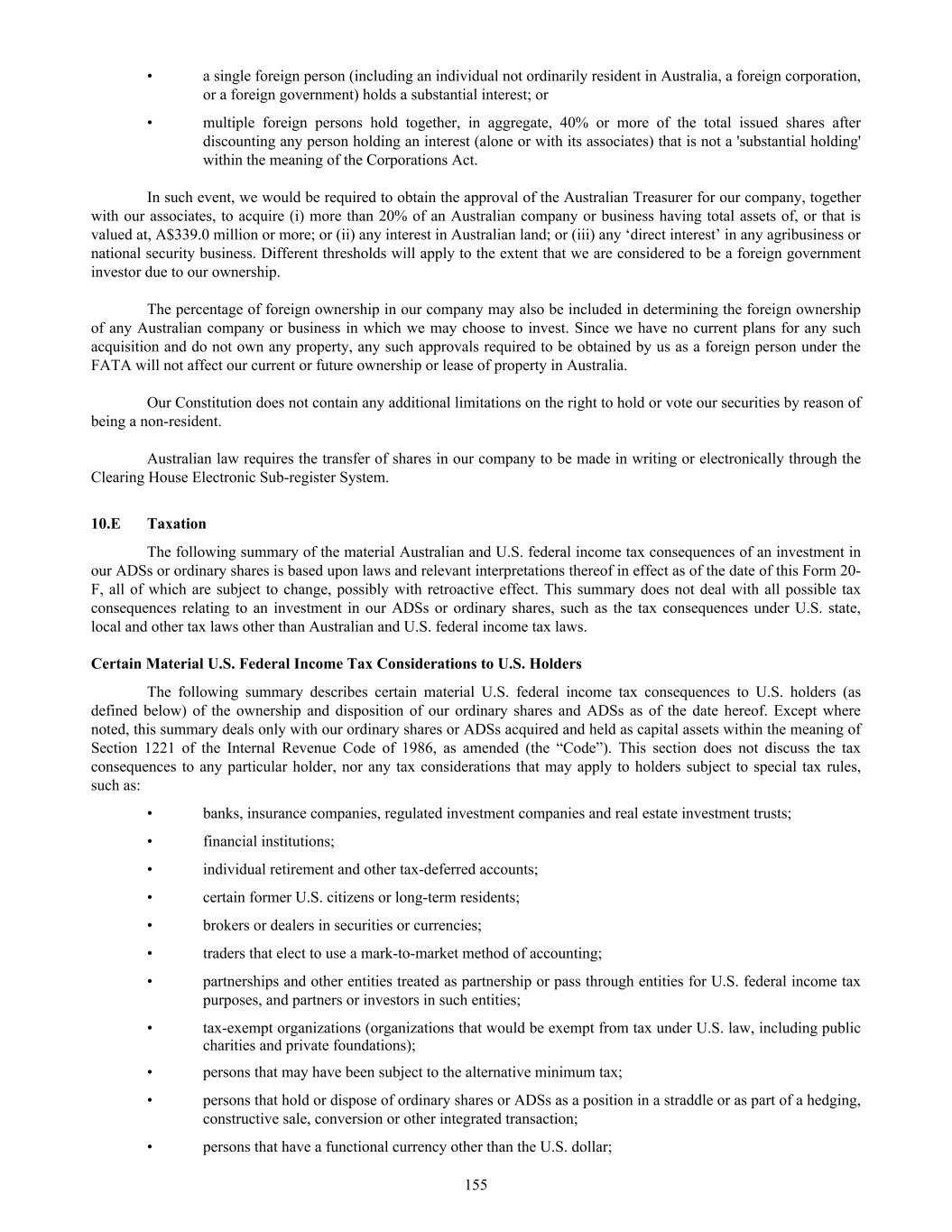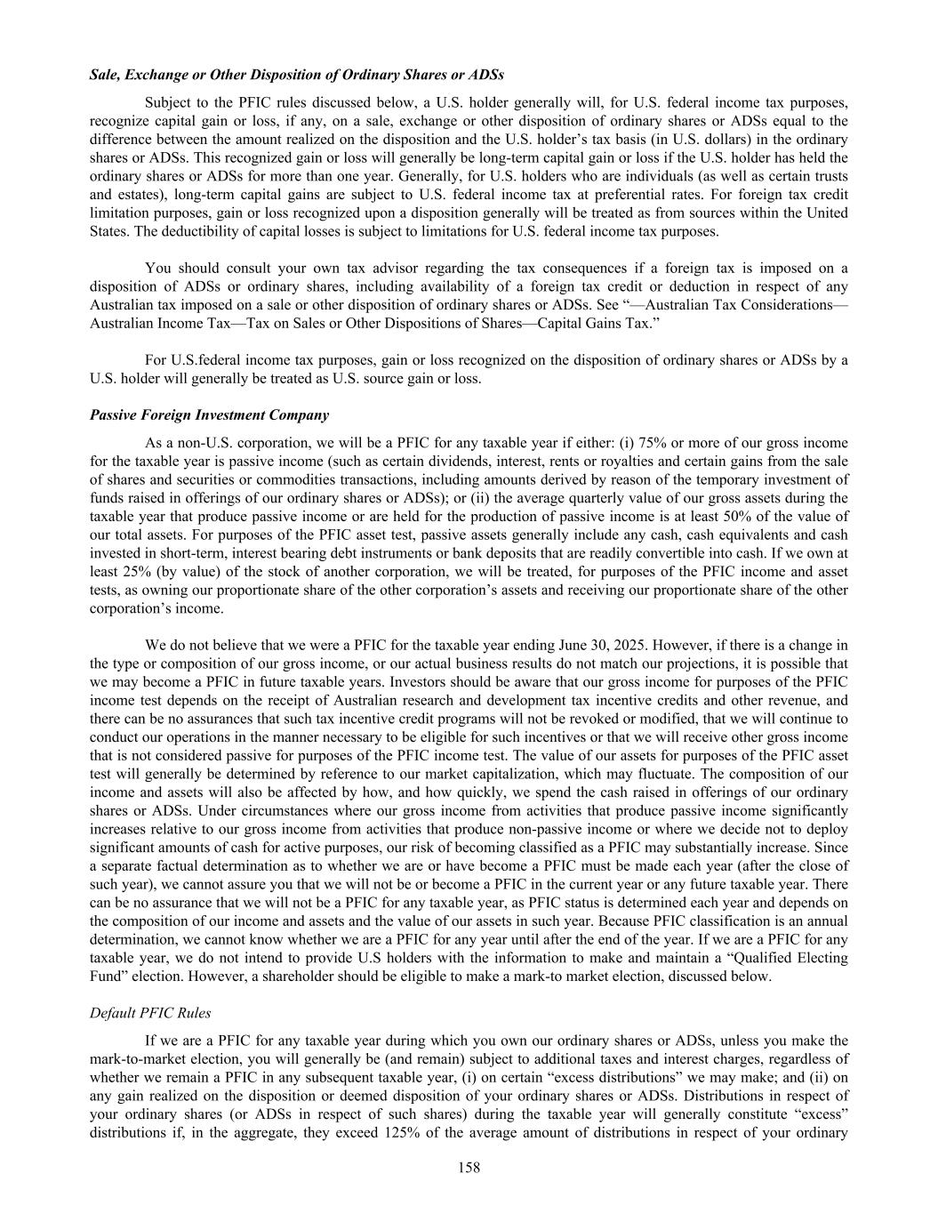 In addition, our officers, directors and principal shareholders are exempt from the reporting and “short-swing” profit recovery provisions of Section 16 of the Exchange Act. Moreover, we are not required to file periodic reports and financial statements with the SEC as frequently or as promptly as a company that files as a domestic issuer whose securities are registered under the Exchange Act, nor are we generally required to comply with the SEC’s Regulation FD, which restricts the selective disclosure of material non-public information. Accordingly, the information may not be disseminated in as timely a manner, or there may be less information publicly available concerning us generally than there is for a company that files as a domestic issuer. ADS holders may be subject to additional risks related to holding ADSs rather than ordinary shares. ADS holders do not hold ordinary shares directly and, as such, are subject to, among others, the following additional risks. • As an ADS holder (and not the holder of ordinary shares underlying your ADSs), we will not treat you as one of our shareholders and you will not be able to exercise shareholder rights, except through the American depositary receipt, or ADR, depositary as permitted by the deposit agreement. • Distributions on the ordinary shares represented by your ADSs will be paid to the ADR depositary, and before the ADR depositary makes a distribution to you on behalf of your ADSs, any withholding taxes that must be paid will be deducted. Additionally, if the exchange rate fluctuates during a time when the ADR depositary cannot convert the foreign currency, you may lose some or all of the value of the distribution. • We and the ADR depositary may amend or terminate the deposit agreement without the ADS holders’ consent in a manner that could prejudice ADS holders. ADS holders must act through the ADR depositary to exercise your voting rights and, as a result, you may be unable to exercise your voting rights on a timely basis. As a holder of ADSs (and not the ordinary shares underlying your ADSs), we will not treat you as one of our shareholders, and you will not be able to exercise shareholder rights. The ADR depositary will be the holder of the ordinary shares underlying your ADSs, and ADS holders will be able to exercise voting rights with respect to the ordinary shares represented by the ADSs only in accordance with the deposit agreement relating to the ADSs. There are practical limitations on the ability of ADS holders to exercise their voting rights due to the additional procedural steps involved in communicating with these holders. For example, holders of our ordinary shares will receive notice of shareholders’ meetings by mail or email and will be able to exercise their voting rights by either attending the shareholders meeting in person or voting by proxy. ADS holders, by comparison, will not receive notice directly from us. Instead, in accordance with the deposit agreement, we will provide notice to the ADR depositary of any such shareholders meeting and details concerning the matters to be voted upon. As soon as practicable after receiving notice from us of any such meeting, the ADR depositary will mail to holders of ADSs the notice of the meeting and a statement as to the manner in which voting instructions may be given by ADS holders. To exercise their voting rights, ADS holders must then instruct the ADR depositary as to voting the ordinary shares represented by their ADSs. Due to these procedural steps involving the ADR depositary, the process for exercising voting rights may take longer for ADS holders than for holders of ordinary shares. The ordinary shares represented by ADSs for which the ADR depositary fails to receive timely voting instructions will not be voted. Under Australian law and our Constitution, any resolution to be considered at a meeting of the shareholders shall be decided on a show of hands unless a poll is demanded by the shareholders at or before the declaration of the result of the show of hands. Under voting by a show of hands, multiple “yes” votes by ADS holders will only count as one “yes” vote and will be negated by a single “no” vote, unless a poll is demanded. If we are or become classified as a passive foreign investment company, our U.S. security holders may suffer adverse tax consequences. Based upon an analysis of our income and assets for the taxable year ended June 30, 2025, we do not believe we were a passive foreign investment company (a "PFIC") for our most recent tax year. In general, if at least 75% of our gross income for any taxable year consists of passive income or at least 50% of the average quarterly value of assets is attributable to assets that produce passive income or are held for the production of passive income, including cash, then we will be classified as a PFIC for U.S. federal income tax purposes. Passive income for this purpose generally includes dividends, interest, certain royalties and rents, and gains from commodities and securities transactions. Passive assets for this purpose generally includes assets held for the production of passive income. Accordingly, passive assets generally include any cash, cash equivalents and cash invested in short-term, interest bearing, debt instruments or bank deposits that are readily convertible into cash. Since PFIC status depends upon the composition of our income and assets and the market 41