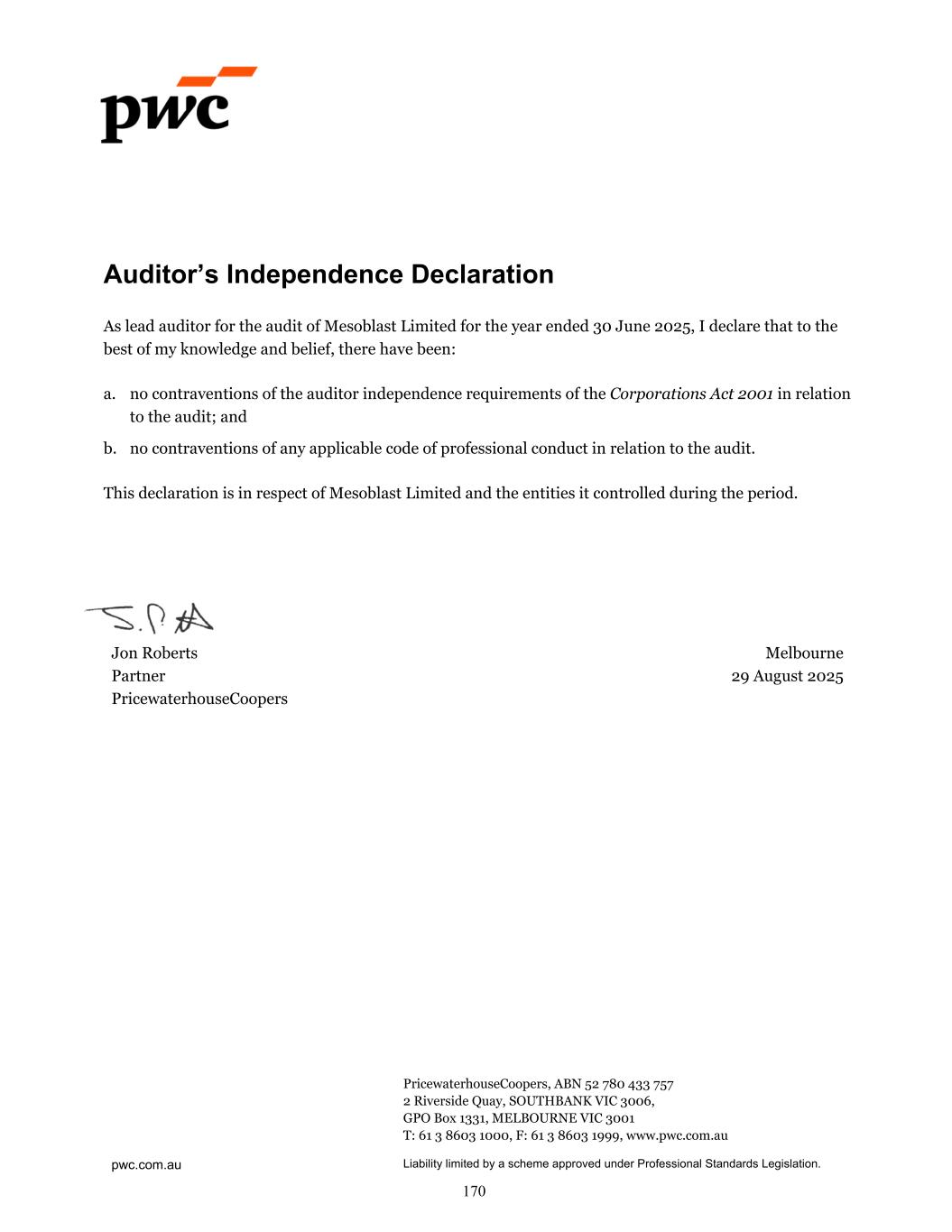pwc.com.au PricewaterhouseCoopers, ABN 52 780 433 757 2 Riverside Quay, SOUTHBANK VIC 3006, GPO Box 1331, MELBOURNE VIC 3001 T: 61 3 8603 1000, F: 61 3 8603 1999, www.pwc.com.au Liability limited by a scheme approved under Professional Standards Legislation. Auditor’s Independence Declaration As lead auditor for the audit of Mesoblast Limited for the year ended 30 June 2025, I declare that to the best of my knowledge and belief, there have been: a. no contraventions of the auditor independence requirements of the Corporations Act 2001 in relation to the audit; and b. no contraventions of any applicable code of professional conduct in relation to the audit. This declaration is in respect of Mesoblast Limited and the entities it controlled during the period. Jon Roberts Melbourne Partner PricewaterhouseCoopers 29 August 2025 170