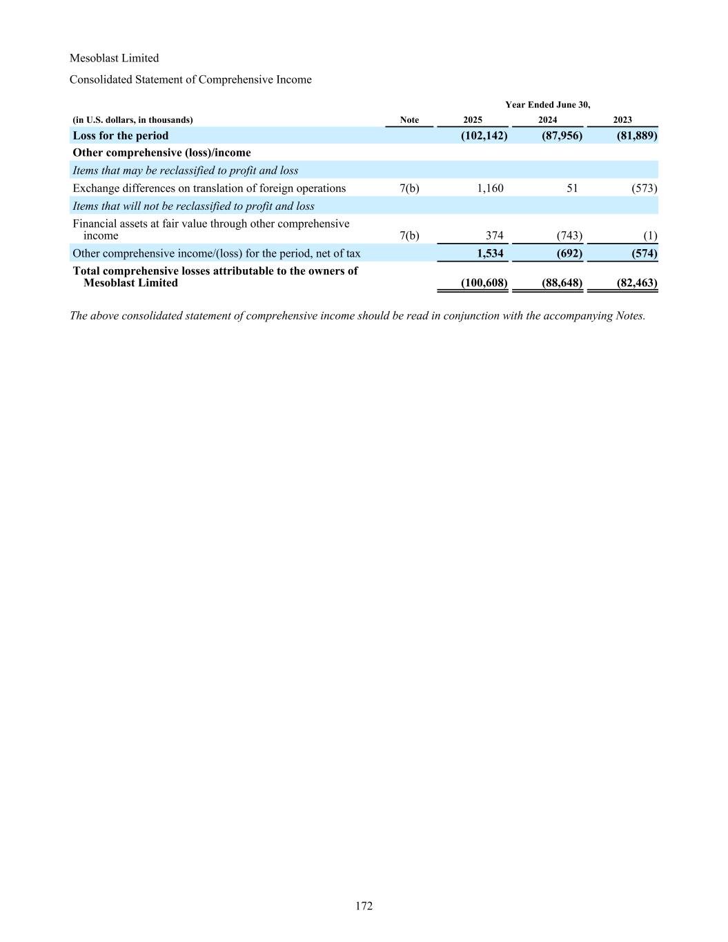Mesoblast Limited Consolidated Statement of Comprehensive Income Year Ended June 30, (in U.S. dollars, in thousands) Note 2025 2024 2023 Loss for the period (102,142) (87,956) (81,889) Other comprehensive (loss)/income Items that may be reclassified to profit and loss Exchange differences on translation of foreign operations 7(b) 1,160 51 (573) Items that will not be reclassified to profit and loss Financial assets at fair value through other comprehensive income 7(b) 374 (743) (1) Other comprehensive income/(loss) for the period, net of tax 1,534 (692) (574) Total comprehensive losses attributable to the owners of Mesoblast Limited (100,608) (88,648) (82,463) The above consolidated statement of comprehensive income should be read in conjunction with the accompanying Notes. 172