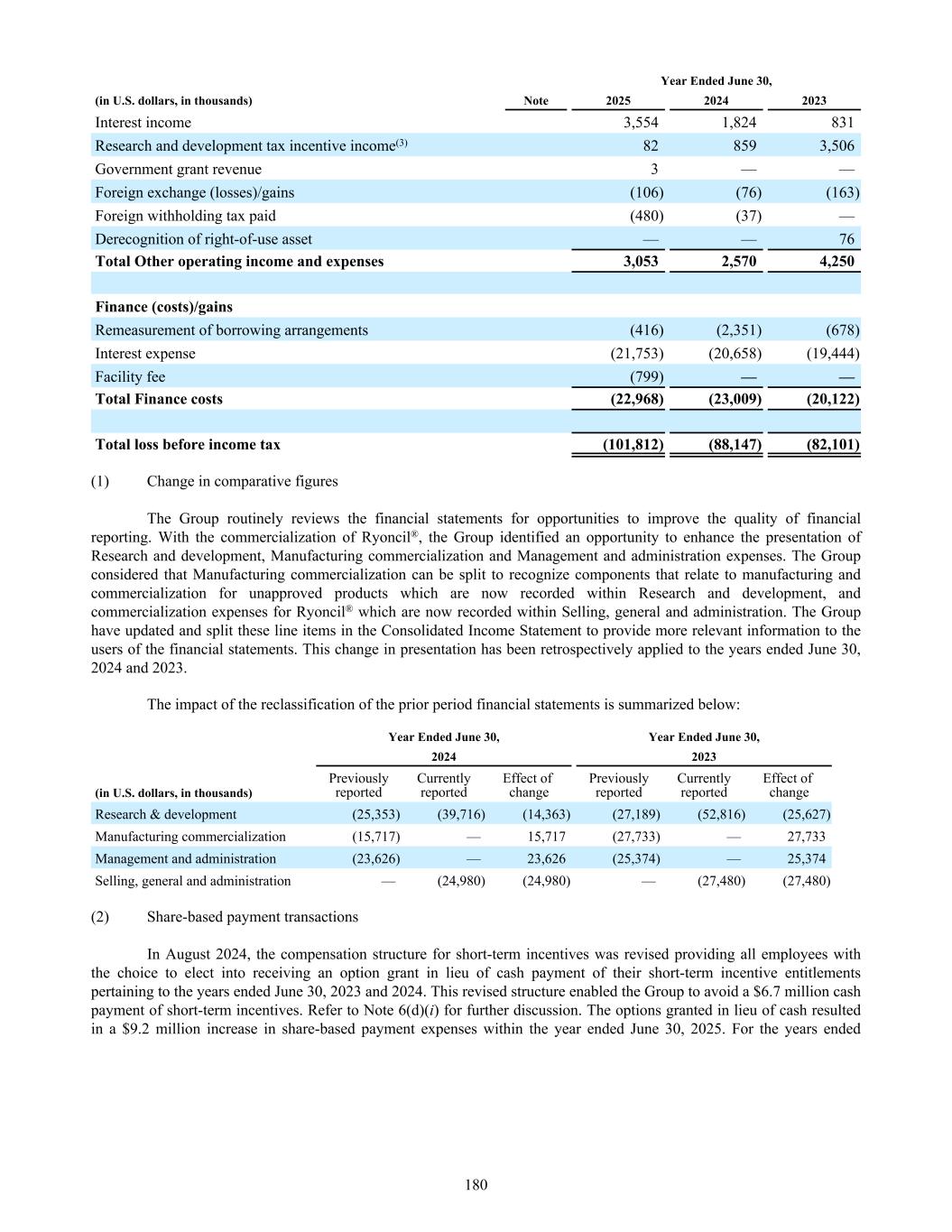 Interest income 3,554 1,824 831 Research and development tax incentive income(3) 82 859 3,506 Government grant revenue 3 — — Foreign exchange (losses)/gains (106) (76) (163) Foreign withholding tax paid (480) (37) — Derecognition of right-of-use asset — — 76 Total Other operating income and expenses 3,053 2,570 4,250 Finance (costs)/gains Remeasurement of borrowing arrangements (416) (2,351) (678) Interest expense (21,753) (20,658) (19,444) Facility fee (799) — — Total Finance costs (22,968) (23,009) (20,122) Total loss before income tax (101,812) (88,147) (82,101) Year Ended June 30, (in U.S. dollars, in thousands) Note 2025 2024 2023 (1) Change in comparative figures The Group routinely reviews the financial statements for opportunities to improve the quality of financial reporting. With the commercialization of Ryoncil®, the Group identified an opportunity to enhance the presentation of Research and development, Manufacturing commercialization and Management and administration expenses. The Group considered that Manufacturing commercialization can be split to recognize components that relate to manufacturing and commercialization for unapproved products which are now recorded within Research and development, and commercialization expenses for Ryoncil® which are now recorded within Selling, general and administration. The Group have updated and split these line items in the Consolidated Income Statement to provide more relevant information to the users of the financial statements. This change in presentation has been retrospectively applied to the years ended June 30, 2024 and 2023. The impact of the reclassification of the prior period financial statements is summarized below: Year Ended June 30, Year Ended June 30, 2024 2023 (in U.S. dollars, in thousands) Previously reported Currently reported Effect of change Previously reported Currently reported Effect of change Research & development (25,353) (39,716) (14,363) (27,189) (52,816) (25,627) Manufacturing commercialization (15,717) — 15,717 (27,733) — 27,733 Management and administration (23,626) — 23,626 (25,374) — 25,374 Selling, general and administration — (24,980) (24,980) — (27,480) (27,480) (2) Share-based payment transactions In August 2024, the compensation structure for short-term incentives was revised providing all employees with the choice to elect into receiving an option grant in lieu of cash payment of their short-term incentive entitlements pertaining to the years ended June 30, 2023 and 2024. This revised structure enabled the Group to avoid a $6.7 million cash payment of short-term incentives. Refer to Note 6(d)(i) for further discussion. The options granted in lieu of cash resulted in a $9.2 million increase in share-based payment expenses within the year ended June 30, 2025. For the years ended 180