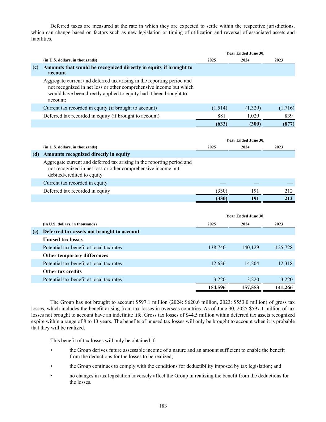 Deferred taxes are measured at the rate in which they are expected to settle within the respective jurisdictions, which can change based on factors such as new legislation or timing of utilization and reversal of associated assets and liabilities. Year Ended June 30, (in U.S. dollars, in thousands) 2025 2024 2023 (c) Amounts that would be recognized directly in equity if brought to account Aggregate current and deferred tax arising in the reporting period and not recognized in net loss or other comprehensive income but which would have been directly applied to equity had it been brought to account: Current tax recorded in equity (if brought to account) (1,514) (1,329) (1,716) Deferred tax recorded in equity (if brought to account) 881 1,029 839 (633) (300) (877) Year Ended June 30, (in U.S. dollars, in thousands) 2025 2024 2023 (d) Amounts recognized directly in equity Aggregate current and deferred tax arising in the reporting period and not recognized in net loss or other comprehensive income but debited/credited to equity Current tax recorded in equity — — — Deferred tax recorded in equity (330) 191 212 (330) 191 212 Year Ended June 30, (in U.S. dollars, in thousands) 2025 2024 2023 (e) Deferred tax assets not brought to account Unused tax losses Potential tax benefit at local tax rates 138,740 140,129 125,728 Other temporary differences Potential tax benefit at local tax rates 12,636 14,204 12,318 Other tax credits Potential tax benefit at local tax rates 3,220 3,220 3,220 154,596 157,553 141,266 The Group has not brought to account $597.1 million (2024: $620.6 million, 2023: $553.0 million) of gross tax losses, which includes the benefit arising from tax losses in overseas countries. As of June 30, 2025 $597.1 million of tax losses not brought to account have an indefinite life. Gross tax losses of $44.5 million within deferred tax assets recognized expire within a range of 8 to 13 years. The benefits of unused tax losses will only be brought to account when it is probable that they will be realized. This benefit of tax losses will only be obtained if: • the Group derives future assessable income of a nature and an amount sufficient to enable the benefit from the deductions for the losses to be realized; • the Group continues to comply with the conditions for deductibility imposed by tax legislation; and • no changes in tax legislation adversely affect the Group in realizing the benefit from the deductions for the losses. 183