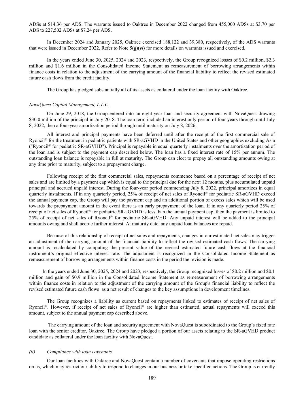 ADSs at $14.36 per ADS. The warrants issued to Oaktree in December 2022 changed from 455,000 ADSs at $3.70 per ADS to 227,502 ADSs at $7.24 per ADS. In December 2024 and January 2025, Oaktree exercised 188,122 and 39,380, respectively, of the ADS warrants that were issued in December 2022. Refer to Note 5(g)(vi) for more details on warrants issued and exercised. In the years ended June 30, 2025, 2024 and 2023, respectively, the Group recognized losses of $0.2 million, $2.3 million and $1.6 million in the Consolidated Income Statement as remeasurement of borrowing arrangements within finance costs in relation to the adjustment of the carrying amount of the financial liability to reflect the revised estimated future cash flows from the credit facility. The Group has pledged substantially all of its assets as collateral under the loan facility with Oaktree. NovaQuest Capital Management, L.L.C. On June 29, 2018, the Group entered into an eight-year loan and security agreement with NovaQuest drawing $30.0 million of the principal in July 2018. The loan term included an interest only period of four years through until July 8, 2022, then a four-year amortization period through until maturity on July 8, 2026. All interest and principal payments have been deferred until after the receipt of the first commercial sale of Ryoncil® for the treatment in pediatric patients with SR-aGVHD in the United States and other geographies excluding Asia ("Ryoncil® for pediatric SR-aGVHD"). Principal is repayable in equal quarterly instalments over the amortization period of the loan and is subject to the payment cap described below. The loan has a fixed interest rate of 15% per annum. The outstanding loan balance is repayable in full at maturity. The Group can elect to prepay all outstanding amounts owing at any time prior to maturity, subject to a prepayment charge. Following receipt of the first commercial sales, repayments commence based on a percentage of receipt of net sales and are limited by a payment cap which is equal to the principal due for the next 12 months, plus accumulated unpaid principal and accrued unpaid interest. During the four-year period commencing July 8, 2022, principal amortizes in equal quarterly instalments. If in any quarterly period, 25% of receipt of net sales of Ryoncil® for pediatric SR-aGVHD exceed the annual payment cap, the Group will pay the payment cap and an additional portion of excess sales which will be used towards the prepayment amount in the event there is an early prepayment of the loan. If in any quarterly period 25% of receipt of net sales of Ryoncil® for pediatric SR-aGVHD is less than the annual payment cap, then the payment is limited to 25% of receipt of net sales of Ryoncil® for pediatric SR-aGVHD. Any unpaid interest will be added to the principal amounts owing and shall accrue further interest. At maturity date, any unpaid loan balances are repaid. Because of this relationship of receipt of net sales and repayments, changes in our estimated net sales may trigger an adjustment of the carrying amount of the financial liability to reflect the revised estimated cash flows. The carrying amount is recalculated by computing the present value of the revised estimated future cash flows at the financial instrument’s original effective interest rate. The adjustment is recognized in the Consolidated Income Statement as remeasurement of borrowing arrangements within finance costs in the period the revision is made. In the years ended June 30, 2025, 2024 and 2023, respectively, the Group recognized losses of $0.2 million and $0.1 million and gain of $0.9 million in the Consolidated Income Statement as remeasurement of borrowing arrangements within finance costs in relation to the adjustment of the carrying amount of the Group's financial liability to reflect the revised estimated future cash flows as a net result of changes to the key assumptions in development timelines. The Group recognizes a liability as current based on repayments linked to estimates of receipt of net sales of Ryoncil®. However, if receipt of net sales of Ryoncil® are higher than estimated, actual repayments will exceed this amount, subject to the annual payment cap described above. The carrying amount of the loan and security agreement with NovaQuest is subordinated to the Group’s fixed rate loan with the senior creditor, Oaktree. The Group have pledged a portion of our assets relating to the SR-aGVHD product candidate as collateral under the loan facility with NovaQuest. (ii) Compliance with loan covenants Our loan facilities with Oaktree and NovaQuest contain a number of covenants that impose operating restrictions on us, which may restrict our ability to respond to changes in our business or take specified actions. The Group is currently 189
