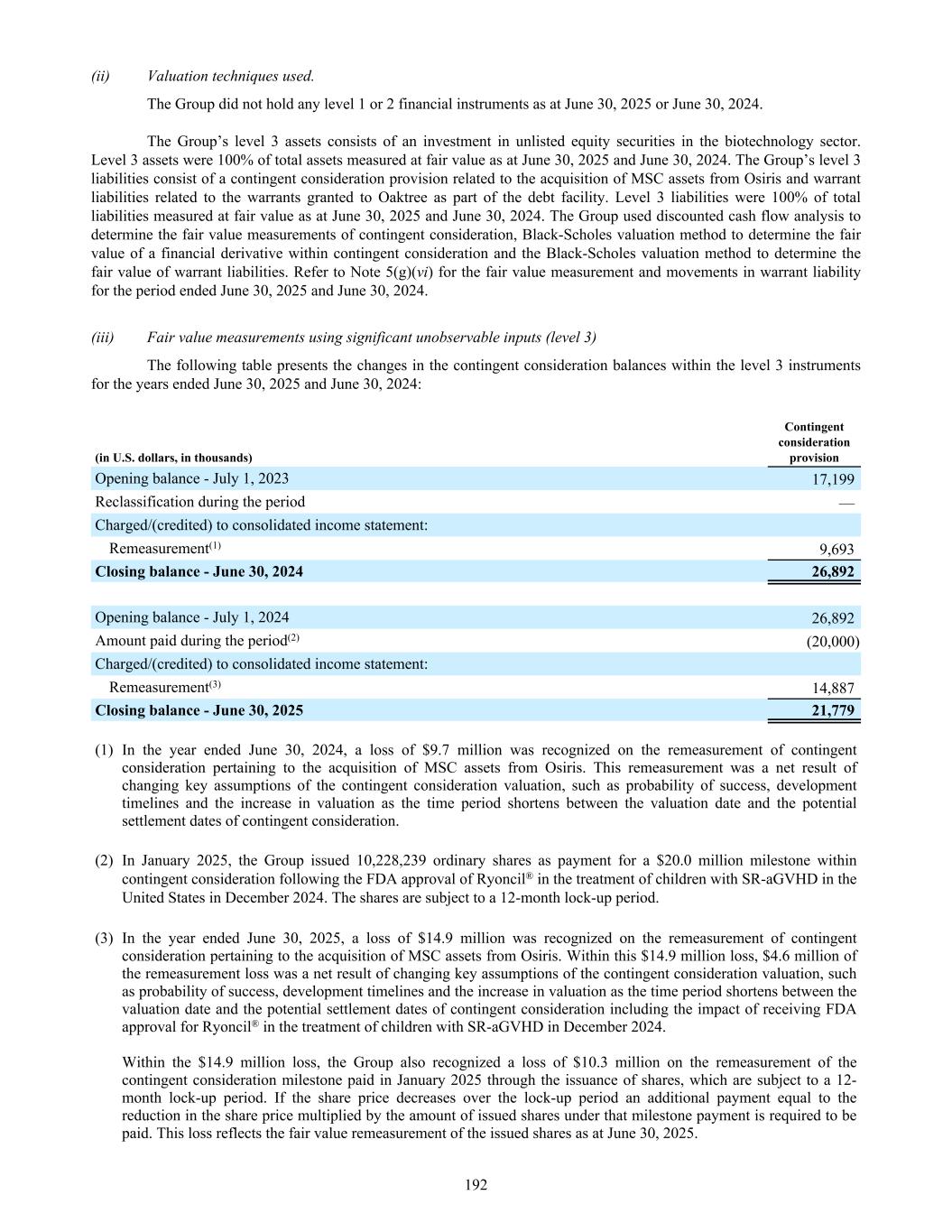 (ii) Valuation techniques used. The Group did not hold any level 1 or 2 financial instruments as at June 30, 2025 or June 30, 2024. The Group’s level 3 assets consists of an investment in unlisted equity securities in the biotechnology sector. Level 3 assets were 100% of total assets measured at fair value as at June 30, 2025 and June 30, 2024. The Group’s level 3 liabilities consist of a contingent consideration provision related to the acquisition of MSC assets from Osiris and warrant liabilities related to the warrants granted to Oaktree as part of the debt facility. Level 3 liabilities were 100% of total liabilities measured at fair value as at June 30, 2025 and June 30, 2024. The Group used discounted cash flow analysis to determine the fair value measurements of contingent consideration, Black-Scholes valuation method to determine the fair value of a financial derivative within contingent consideration and the Black-Scholes valuation method to determine the fair value of warrant liabilities. Refer to Note 5(g)(vi) for the fair value measurement and movements in warrant liability for the period ended June 30, 2025 and June 30, 2024. (iii) Fair value measurements using significant unobservable inputs (level 3) The following table presents the changes in the contingent consideration balances within the level 3 instruments for the years ended June 30, 2025 and June 30, 2024: (in U.S. dollars, in thousands) Contingent consideration provision Opening balance - July 1, 2023 17,199 Reclassification during the period — Charged/(credited) to consolidated income statement: Remeasurement(1) 9,693 Closing balance - June 30, 2024 26,892 Opening balance - July 1, 2024 26,892 Amount paid during the period(2) (20,000) Charged/(credited) to consolidated income statement: Remeasurement(3) 14,887 Closing balance - June 30, 2025 21,779 (1) In the year ended June 30, 2024, a loss of $9.7 million was recognized on the remeasurement of contingent consideration pertaining to the acquisition of MSC assets from Osiris. This remeasurement was a net result of changing key assumptions of the contingent consideration valuation, such as probability of success, development timelines and the increase in valuation as the time period shortens between the valuation date and the potential settlement dates of contingent consideration. (2) In January 2025, the Group issued 10,228,239 ordinary shares as payment for a $20.0 million milestone within contingent consideration following the FDA approval of Ryoncil® in the treatment of children with SR-aGVHD in the United States in December 2024. The shares are subject to a 12-month lock-up period. (3) In the year ended June 30, 2025, a loss of $14.9 million was recognized on the remeasurement of contingent consideration pertaining to the acquisition of MSC assets from Osiris. Within this $14.9 million loss, $4.6 million of the remeasurement loss was a net result of changing key assumptions of the contingent consideration valuation, such as probability of success, development timelines and the increase in valuation as the time period shortens between the valuation date and the potential settlement dates of contingent consideration including the impact of receiving FDA approval for Ryoncil® in the treatment of children with SR-aGVHD in December 2024. Within the $14.9 million loss, the Group also recognized a loss of $10.3 million on the remeasurement of the contingent consideration milestone paid in January 2025 through the issuance of shares, which are subject to a 12- month lock-up period. If the share price decreases over the lock-up period an additional payment equal to the reduction in the share price multiplied by the amount of issued shares under that milestone payment is required to be paid. This loss reflects the fair value remeasurement of the issued shares as at June 30, 2025. 192