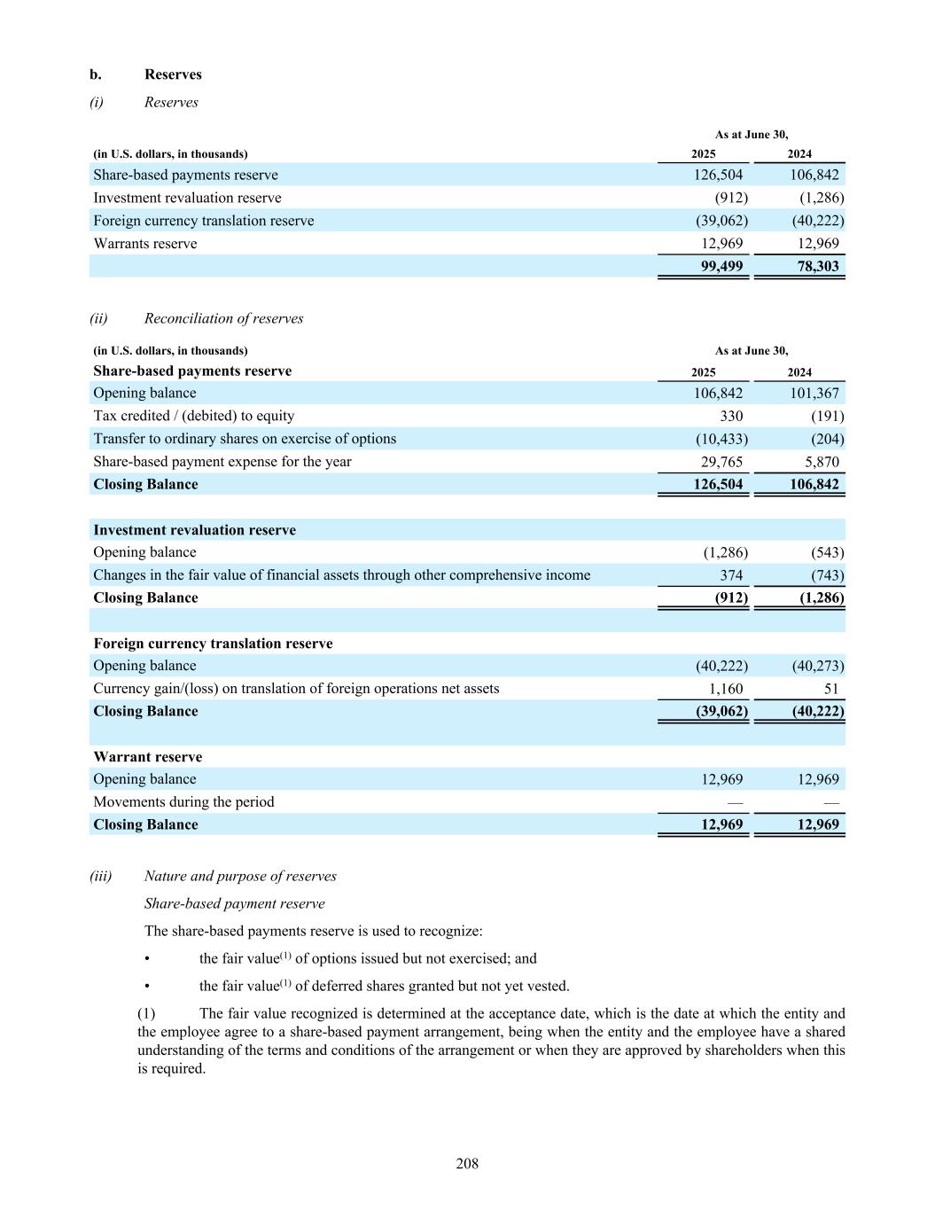 b. Reserves (i) Reserves As at June 30, (in U.S. dollars, in thousands) 2025 2024 Share-based payments reserve 126,504 106,842 Investment revaluation reserve (912) (1,286) Foreign currency translation reserve (39,062) (40,222) Warrants reserve 12,969 12,969 99,499 78,303 (ii) Reconciliation of reserves (in U.S. dollars, in thousands) As at June 30, Share-based payments reserve 2025 2024 Opening balance 106,842 101,367 Tax credited / (debited) to equity 330 (191) Transfer to ordinary shares on exercise of options (10,433) (204) Share-based payment expense for the year 29,765 5,870 Closing Balance 126,504 106,842 Investment revaluation reserve Opening balance (1,286) (543) Changes in the fair value of financial assets through other comprehensive income 374 (743) Closing Balance (912) (1,286) Foreign currency translation reserve Opening balance (40,222) (40,273) Currency gain/(loss) on translation of foreign operations net assets 1,160 51 Closing Balance (39,062) (40,222) Warrant reserve Opening balance 12,969 12,969 Movements during the period — — Closing Balance 12,969 12,969 (iii) Nature and purpose of reserves Share-based payment reserve The share-based payments reserve is used to recognize: • the fair value(1) of options issued but not exercised; and • the fair value(1) of deferred shares granted but not yet vested. (1) The fair value recognized is determined at the acceptance date, which is the date at which the entity and the employee agree to a share-based payment arrangement, being when the entity and the employee have a shared understanding of the terms and conditions of the arrangement or when they are approved by shareholders when this is required. 208