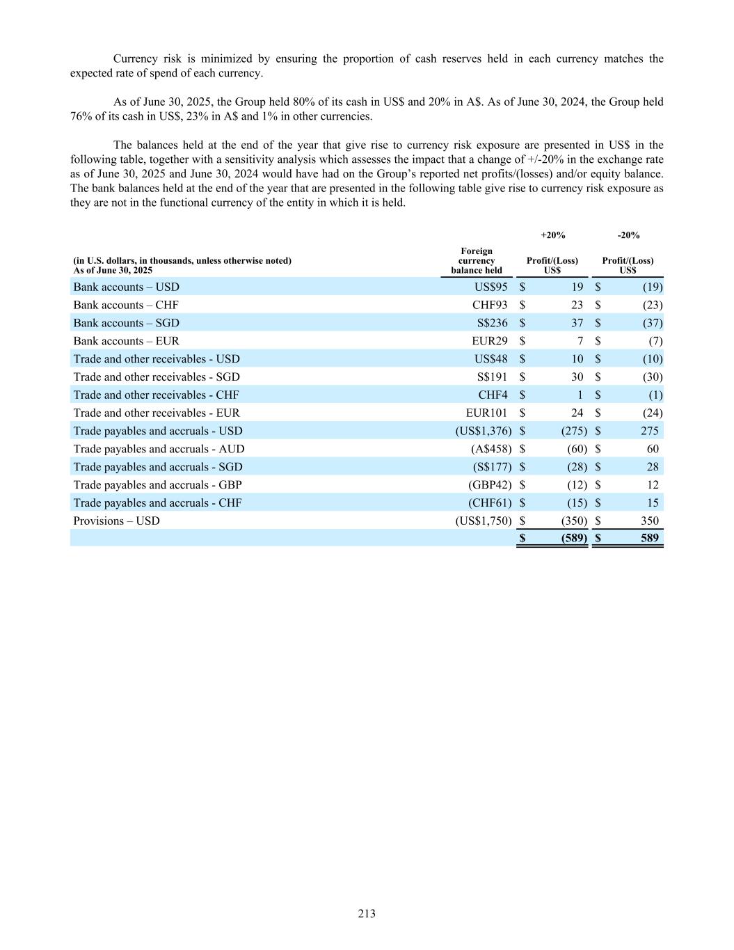 Currency risk is minimized by ensuring the proportion of cash reserves held in each currency matches the expected rate of spend of each currency. As of June 30, 2025, the Group held 80% of its cash in US$ and 20% in A$. As of June 30, 2024, the Group held 76% of its cash in US$, 23% in A$ and 1% in other currencies. The balances held at the end of the year that give rise to currency risk exposure are presented in US$ in the following table, together with a sensitivity analysis which assesses the impact that a change of +/-20% in the exchange rate as of June 30, 2025 and June 30, 2024 would have had on the Group’s reported net profits/(losses) and/or equity balance. The bank balances held at the end of the year that are presented in the following table give rise to currency risk exposure as they are not in the functional currency of the entity in which it is held. +20% -20% (in U.S. dollars, in thousands, unless otherwise noted) As of June 30, 2025 Foreign currency balance held Profit/(Loss) US$ Profit/(Loss) US$ Bank accounts – USD US$95 $ 19 $ (19) Bank accounts – CHF CHF93 $ 23 $ (23) Bank accounts – SGD S$236 $ 37 $ (37) Bank accounts – EUR EUR29 $ 7 $ (7) Trade and other receivables - USD US$48 $ 10 $ (10) Trade and other receivables - SGD S$191 $ 30 $ (30) Trade and other receivables - CHF CHF4 $ 1 $ (1) Trade and other receivables - EUR EUR101 $ 24 $ (24) Trade payables and accruals - USD (US$1,376) $ (275) $ 275 Trade payables and accruals - AUD (A$458) $ (60) $ 60 Trade payables and accruals - SGD (S$177) $ (28) $ 28 Trade payables and accruals - GBP (GBP42) $ (12) $ 12 Trade payables and accruals - CHF (CHF61) $ (15) $ 15 Provisions – USD (US$1,750) $ (350) $ 350 $ (589) $ 589 213