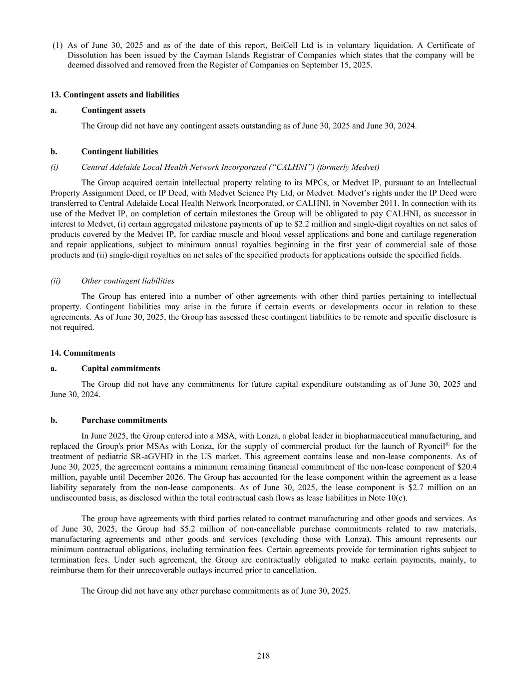 (1) As of June 30, 2025 and as of the date of this report, BeiCell Ltd is in voluntary liquidation. A Certificate of Dissolution has been issued by the Cayman Islands Registrar of Companies which states that the company will be deemed dissolved and removed from the Register of Companies on September 15, 2025. 13. Contingent assets and liabilities a. Contingent assets The Group did not have any contingent assets outstanding as of June 30, 2025 and June 30, 2024. b. Contingent liabilities (i) Central Adelaide Local Health Network Incorporated (“CALHNI”) (formerly Medvet) The Group acquired certain intellectual property relating to its MPCs, or Medvet IP, pursuant to an Intellectual Property Assignment Deed, or IP Deed, with Medvet Science Pty Ltd, or Medvet. Medvet’s rights under the IP Deed were transferred to Central Adelaide Local Health Network Incorporated, or CALHNI, in November 2011. In connection with its use of the Medvet IP, on completion of certain milestones the Group will be obligated to pay CALHNI, as successor in interest to Medvet, (i) certain aggregated milestone payments of up to $2.2 million and single-digit royalties on net sales of products covered by the Medvet IP, for cardiac muscle and blood vessel applications and bone and cartilage regeneration and repair applications, subject to minimum annual royalties beginning in the first year of commercial sale of those products and (ii) single-digit royalties on net sales of the specified products for applications outside the specified fields. (ii) Other contingent liabilities The Group has entered into a number of other agreements with other third parties pertaining to intellectual property. Contingent liabilities may arise in the future if certain events or developments occur in relation to these agreements. As of June 30, 2025, the Group has assessed these contingent liabilities to be remote and specific disclosure is not required. 14. Commitments a. Capital commitments The Group did not have any commitments for future capital expenditure outstanding as of June 30, 2025 and June 30, 2024. b. Purchase commitments In June 2025, the Group entered into a MSA, with Lonza, a global leader in biopharmaceutical manufacturing, and replaced the Group's prior MSAs with Lonza, for the supply of commercial product for the launch of Ryoncil® for the treatment of pediatric SR-aGVHD in the US market. This agreement contains lease and non-lease components. As of June 30, 2025, the agreement contains a minimum remaining financial commitment of the non-lease component of $20.4 million, payable until December 2026. The Group has accounted for the lease component within the agreement as a lease liability separately from the non-lease components. As of June 30, 2025, the lease component is $2.7 million on an undiscounted basis, as disclosed within the total contractual cash flows as lease liabilities in Note 10(c). The group have agreements with third parties related to contract manufacturing and other goods and services. As of June 30, 2025, the Group had $5.2 million of non-cancellable purchase commitments related to raw materials, manufacturing agreements and other goods and services (excluding those with Lonza). This amount represents our minimum contractual obligations, including termination fees. Certain agreements provide for termination rights subject to termination fees. Under such agreement, the Group are contractually obligated to make certain payments, mainly, to reimburse them for their unrecoverable outlays incurred prior to cancellation. The Group did not have any other purchase commitments as of June 30, 2025. 218
