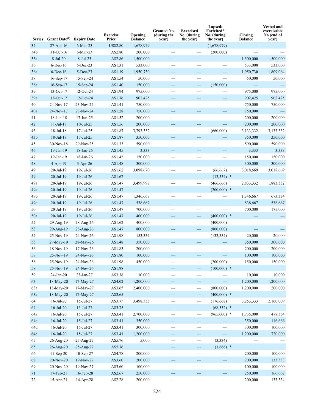 34 27-Apr-16 6-Mar-23 US$2.80 1,678,979 — — (1,678,979) — — 34b 31-Oct-16 6-Mar-23 A$2.80 200,000 — — (200,000) — — 35a 8-Jul-20 8-Jul-23 A$2.86 1,500,000 — — — 1,500,000 1,500,000 36 6-Dec-16 5-Dec-23 A$1.31 533,000 — — — 533,000 533,000 36a 6-Dec-16 5-Dec-23 A$1.19 1,950,730 — — — 1,950,730 1,809,064 38 16-Sep-17 15-Sep-24 A$1.54 50,000 — — — 50,000 50,000 38a 16-Sep-17 15-Sep-24 A$1.40 150,000 — — (150,000) — — 39 13-Oct-17 12-Oct-24 A$1.94 975,000 — — — 975,000 975,000 39a 13-Oct-17 12-Oct-24 A$1.76 902,425 — — — 902,425 902,425 40 24-Nov-17 23-Nov-24 A$1.41 750,000 — — — 750,000 750,000 40a 24-Nov-17 23-Nov-24 A$1.28 750,000 — — — 750,000 — 41 18-Jun-18 17-Jun-25 A$1.52 200,000 — — — 200,000 200,000 42 11-Jul-18 10-Jul-25 A$1.56 200,000 — — — 200,000 200,000 43 18-Jul-18 17-Jul-25 A$1.87 3,793,332 — — (660,000) 3,133,332 3,133,332 43b 18-Jul-18 17-Jul-25 A$1.87 350,000 — — — 350,000 350,000 45 30-Nov-18 29-Nov-25 A$1.33 590,000 — — — 590,000 590,000 46 19-Jan-19 18-Jan-26 A$1.45 3,333 — — — 3,333 3,333 47 19-Jan-19 18-Jan-26 A$1.45 150,000 — — — 150,000 150,000 48 4-Apr-19 3-Apr-26 A$1.48 300,000 — — — 300,000 300,000 49 20-Jul-19 19-Jul-26 A$1.62 3,098,670 — — (66,667) 3,018,669 3,018,669 49 20-Jul-19 19-Jul-26 A$1.62 — — (13,334) * 49a 20-Jul-19 19-Jul-26 A$1.47 3,499,998 — — (466,666) 2,833,332 1,883,332 49a 20-Jul-19 19-Jul-26 A$1.47 — — (200,000) * 49b 20-Jul-19 19-Jul-26 A$1.47 1,346,667 — — — 1,346,667 673,334 49c 20-Jul-19 19-Jul-26 A$1.47 538,667 — — — 538,667 538,667 50 20-Jul-19 19-Jul-26 A$1.47 700,000 — — — 700,000 175,000 50a 20-Jul-19 19-Jul-26 A$1.47 400,000 — — (400,000) * — — 52 29-Aug-19 28-Aug-26 A$1.62 400,000 — — (400,000) — — 53 29-Aug-19 28-Aug-26 A$1.47 800,000 — — (800,000) — — 54 25-Nov-19 24-Nov-26 A$1.98 153,334 — — (133,334) 20,000 20,000 55 29-May-19 28-May-26 A$1.48 350,000 — — — 350,000 300,000 56 18-Nov-19 17-Nov-26 A$1.83 200,000 — — — 200,000 200,000 57 25-Nov-19 24-Nov-26 A$1.80 100,000 — — — 100,000 100,000 58 25-Nov-19 24-Nov-26 A$1.98 450,000 — — (200,000) 150,000 150,000 58 25-Nov-19 24-Nov-26 A$1.98 — — (100,000) * 59 24-Jan-20 23-Jan-27 A$3.38 10,000 — — — 10,000 10,000 63 18-May-20 17-May-27 A$4.02 1,200,000 — — — 1,200,000 1,200,000 63a 18-May-20 17-May-27 A$3.65 2,400,000 — — (800,000) 1,200,000 200,000 63a 18-May-20 17-May-27 A$3.65 — — (400,000) * 64 16-Jul-20 15-Jul-27 A$3.75 3,498,333 — — (176,668) 3,253,333 2,160,009 64 16-Jul-20 15-Jul-27 A$3.75 — — (68,332) * 64a 16-Jul-20 15-Jul-27 A$3.41 2,700,000 — — (965,000) * 1,735,000 478,334 64c 16-Jul-20 15-Jul-27 A$3.41 350,000 — — — 350,000 116,666 64d 16-Jul-20 15-Jul-27 A$3.41 300,000 — — — 300,000 100,000 64e 16-Jul-20 15-Jul-27 A$3.41 1,200,000 — — — 1,200,000 720,000 65 26-Aug-20 25-Aug-27 A$5.76 5,000 — — (3,334) — — 65 26-Aug-20 25-Aug-27 A$5.76 — — (1,666) * 66 11-Sep-20 10-Sep-27 A$4.78 200,000 — — — 200,000 100,000 68 20-Nov-20 19-Nov-27 A$3.60 200,000 — — — 200,000 133,333 69 20-Nov-20 19-Nov-27 A$3.60 100,000 — — — 100,000 100,000 71 17-Feb-21 16-Feb-28 A$2.67 250,000 — — — 250,000 166,667 72 15-Apr-21 14-Apr-28 A$2.28 200,000 — — — 200,000 133,334 Series Grant Date(1) Expiry Date Exercise Price Opening Balance Granted No. (during the year) Exercised No. (during the year) Lapsed/ Forfeited* No. (during the year) Closing Balance Vested and exercisable No (end of year) 224