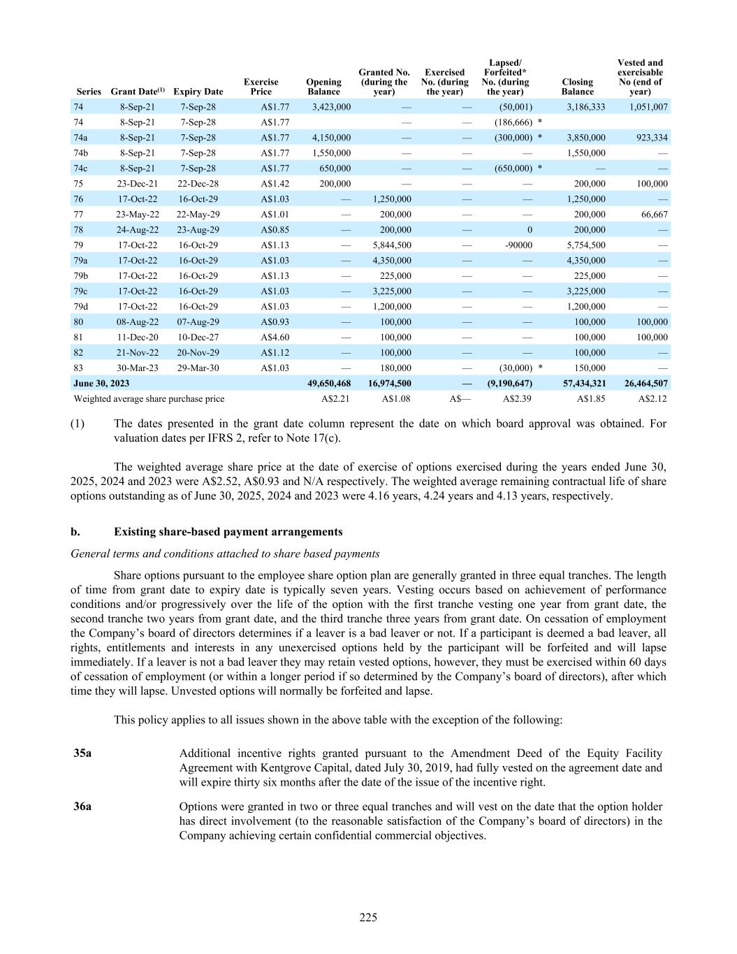 74 8-Sep-21 7-Sep-28 A$1.77 3,423,000 — — (50,001) 3,186,333 1,051,007 74 8-Sep-21 7-Sep-28 A$1.77 — — (186,666) * 74a 8-Sep-21 7-Sep-28 A$1.77 4,150,000 — — (300,000) * 3,850,000 923,334 74b 8-Sep-21 7-Sep-28 A$1.77 1,550,000 — — — 1,550,000 — 74c 8-Sep-21 7-Sep-28 A$1.77 650,000 — — (650,000) * — — 75 23-Dec-21 22-Dec-28 A$1.42 200,000 — — — 200,000 100,000 76 17-Oct-22 16-Oct-29 A$1.03 — 1,250,000 — — 1,250,000 — 77 23-May-22 22-May-29 A$1.01 — 200,000 — — 200,000 66,667 78 24-Aug-22 23-Aug-29 A$0.85 — 200,000 — 0 200,000 — 79 17-Oct-22 16-Oct-29 A$1.13 — 5,844,500 — -90000 5,754,500 — 79a 17-Oct-22 16-Oct-29 A$1.03 — 4,350,000 — — 4,350,000 — 79b 17-Oct-22 16-Oct-29 A$1.13 — 225,000 — — 225,000 — 79c 17-Oct-22 16-Oct-29 A$1.03 — 3,225,000 — — 3,225,000 — 79d 17-Oct-22 16-Oct-29 A$1.03 — 1,200,000 — — 1,200,000 — 80 08-Aug-22 07-Aug-29 A$0.93 — 100,000 — — 100,000 100,000 81 11-Dec-20 10-Dec-27 A$4.60 — 100,000 — — 100,000 100,000 82 21-Nov-22 20-Nov-29 A$1.12 — 100,000 — — 100,000 — 83 30-Mar-23 29-Mar-30 A$1.03 — 180,000 — (30,000) * 150,000 — June 30, 2023 49,650,468 16,974,500 — (9,190,647) 57,434,321 26,464,507 Weighted average share purchase price A$2.21 A$1.08 A$— A$2.39 A$1.85 A$2.12 Series Grant Date(1) Expiry Date Exercise Price Opening Balance Granted No. (during the year) Exercised No. (during the year) Lapsed/ Forfeited* No. (during the year) Closing Balance Vested and exercisable No (end of year) (1) The dates presented in the grant date column represent the date on which board approval was obtained. For valuation dates per IFRS 2, refer to Note 17(c). The weighted average share price at the date of exercise of options exercised during the years ended June 30, 2025, 2024 and 2023 were A$2.52, A$0.93 and N/A respectively. The weighted average remaining contractual life of share options outstanding as of June 30, 2025, 2024 and 2023 were 4.16 years, 4.24 years and 4.13 years, respectively. b. Existing share-based payment arrangements General terms and conditions attached to share based payments Share options pursuant to the employee share option plan are generally granted in three equal tranches. The length of time from grant date to expiry date is typically seven years. Vesting occurs based on achievement of performance conditions and/or progressively over the life of the option with the first tranche vesting one year from grant date, the second tranche two years from grant date, and the third tranche three years from grant date. On cessation of employment the Company’s board of directors determines if a leaver is a bad leaver or not. If a participant is deemed a bad leaver, all rights, entitlements and interests in any unexercised options held by the participant will be forfeited and will lapse immediately. If a leaver is not a bad leaver they may retain vested options, however, they must be exercised within 60 days of cessation of employment (or within a longer period if so determined by the Company’s board of directors), after which time they will lapse. Unvested options will normally be forfeited and lapse. This policy applies to all issues shown in the above table with the exception of the following: 35a Additional incentive rights granted pursuant to the Amendment Deed of the Equity Facility Agreement with Kentgrove Capital, dated July 30, 2019, had fully vested on the agreement date and will expire thirty six months after the date of the issue of the incentive right. 36a Options were granted in two or three equal tranches and will vest on the date that the option holder has direct involvement (to the reasonable satisfaction of the Company’s board of directors) in the Company achieving certain confidential commercial objectives. 225