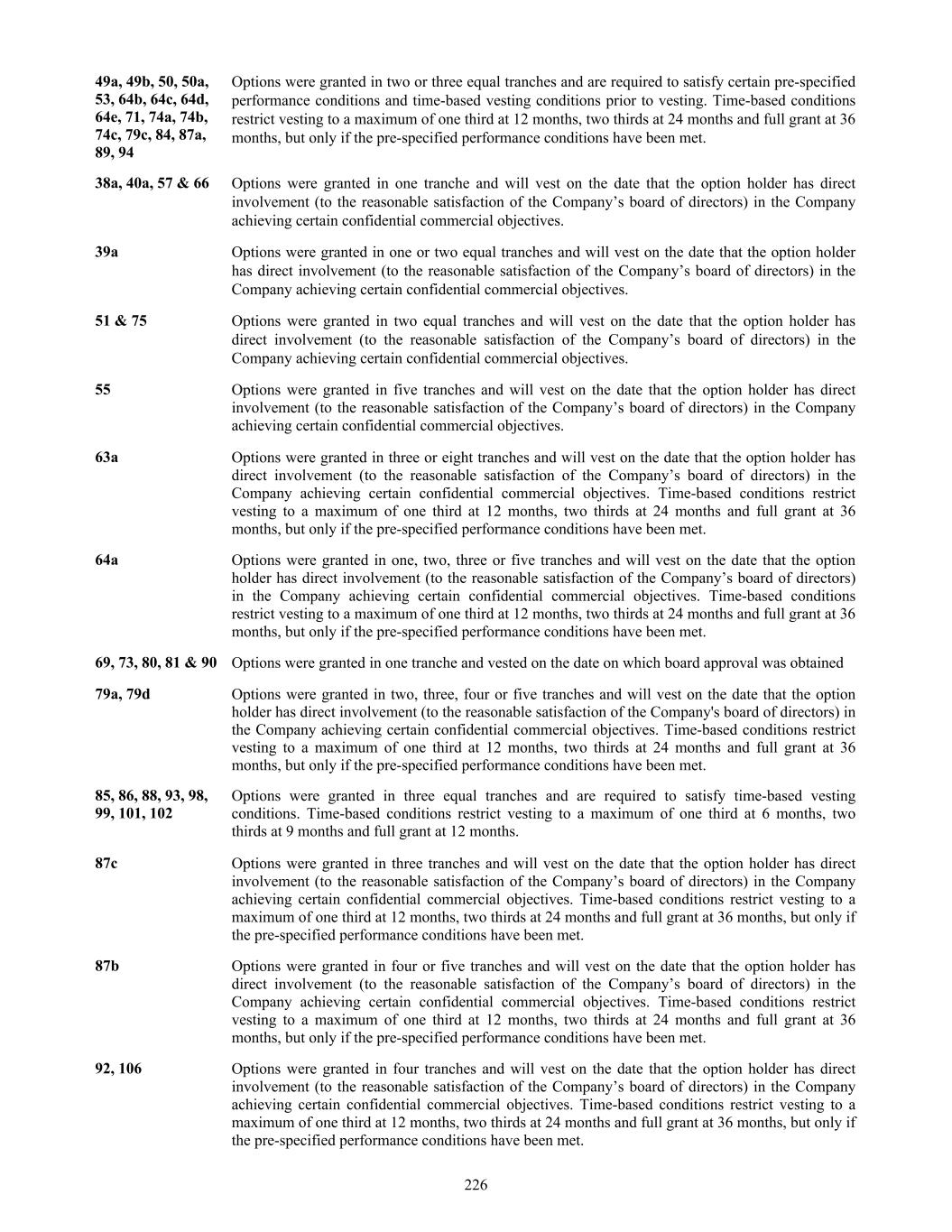 49a, 49b, 50, 50a, 53, 64b, 64c, 64d, 64e, 71, 74a, 74b, 74c, 79c, 84, 87a, 89, 94 Options were granted in two or three equal tranches and are required to satisfy certain pre-specified performance conditions and time-based vesting conditions prior to vesting. Time-based conditions restrict vesting to a maximum of one third at 12 months, two thirds at 24 months and full grant at 36 months, but only if the pre-specified performance conditions have been met. 38a, 40a, 57 & 66 Options were granted in one tranche and will vest on the date that the option holder has direct involvement (to the reasonable satisfaction of the Company’s board of directors) in the Company achieving certain confidential commercial objectives. 39a Options were granted in one or two equal tranches and will vest on the date that the option holder has direct involvement (to the reasonable satisfaction of the Company’s board of directors) in the Company achieving certain confidential commercial objectives. 51 & 75 Options were granted in two equal tranches and will vest on the date that the option holder has direct involvement (to the reasonable satisfaction of the Company’s board of directors) in the Company achieving certain confidential commercial objectives. 55 Options were granted in five tranches and will vest on the date that the option holder has direct involvement (to the reasonable satisfaction of the Company’s board of directors) in the Company achieving certain confidential commercial objectives. 63a Options were granted in three or eight tranches and will vest on the date that the option holder has direct involvement (to the reasonable satisfaction of the Company’s board of directors) in the Company achieving certain confidential commercial objectives. Time-based conditions restrict vesting to a maximum of one third at 12 months, two thirds at 24 months and full grant at 36 months, but only if the pre-specified performance conditions have been met. 64a Options were granted in one, two, three or five tranches and will vest on the date that the option holder has direct involvement (to the reasonable satisfaction of the Company’s board of directors) in the Company achieving certain confidential commercial objectives. Time-based conditions restrict vesting to a maximum of one third at 12 months, two thirds at 24 months and full grant at 36 months, but only if the pre-specified performance conditions have been met. 69, 73, 80, 81 & 90 Options were granted in one tranche and vested on the date on which board approval was obtained 79a, 79d Options were granted in two, three, four or five tranches and will vest on the date that the option holder has direct involvement (to the reasonable satisfaction of the Company's board of directors) in the Company achieving certain confidential commercial objectives. Time-based conditions restrict vesting to a maximum of one third at 12 months, two thirds at 24 months and full grant at 36 months, but only if the pre-specified performance conditions have been met. 85, 86, 88, 93, 98, 99, 101, 102 Options were granted in three equal tranches and are required to satisfy time-based vesting conditions. Time-based conditions restrict vesting to a maximum of one third at 6 months, two thirds at 9 months and full grant at 12 months. 87c Options were granted in three tranches and will vest on the date that the option holder has direct involvement (to the reasonable satisfaction of the Company’s board of directors) in the Company achieving certain confidential commercial objectives. Time-based conditions restrict vesting to a maximum of one third at 12 months, two thirds at 24 months and full grant at 36 months, but only if the pre-specified performance conditions have been met. 87b Options were granted in four or five tranches and will vest on the date that the option holder has direct involvement (to the reasonable satisfaction of the Company’s board of directors) in the Company achieving certain confidential commercial objectives. Time-based conditions restrict vesting to a maximum of one third at 12 months, two thirds at 24 months and full grant at 36 months, but only if the pre-specified performance conditions have been met. 92, 106 Options were granted in four tranches and will vest on the date that the option holder has direct involvement (to the reasonable satisfaction of the Company’s board of directors) in the Company achieving certain confidential commercial objectives. Time-based conditions restrict vesting to a maximum of one third at 12 months, two thirds at 24 months and full grant at 36 months, but only if the pre-specified performance conditions have been met. 226