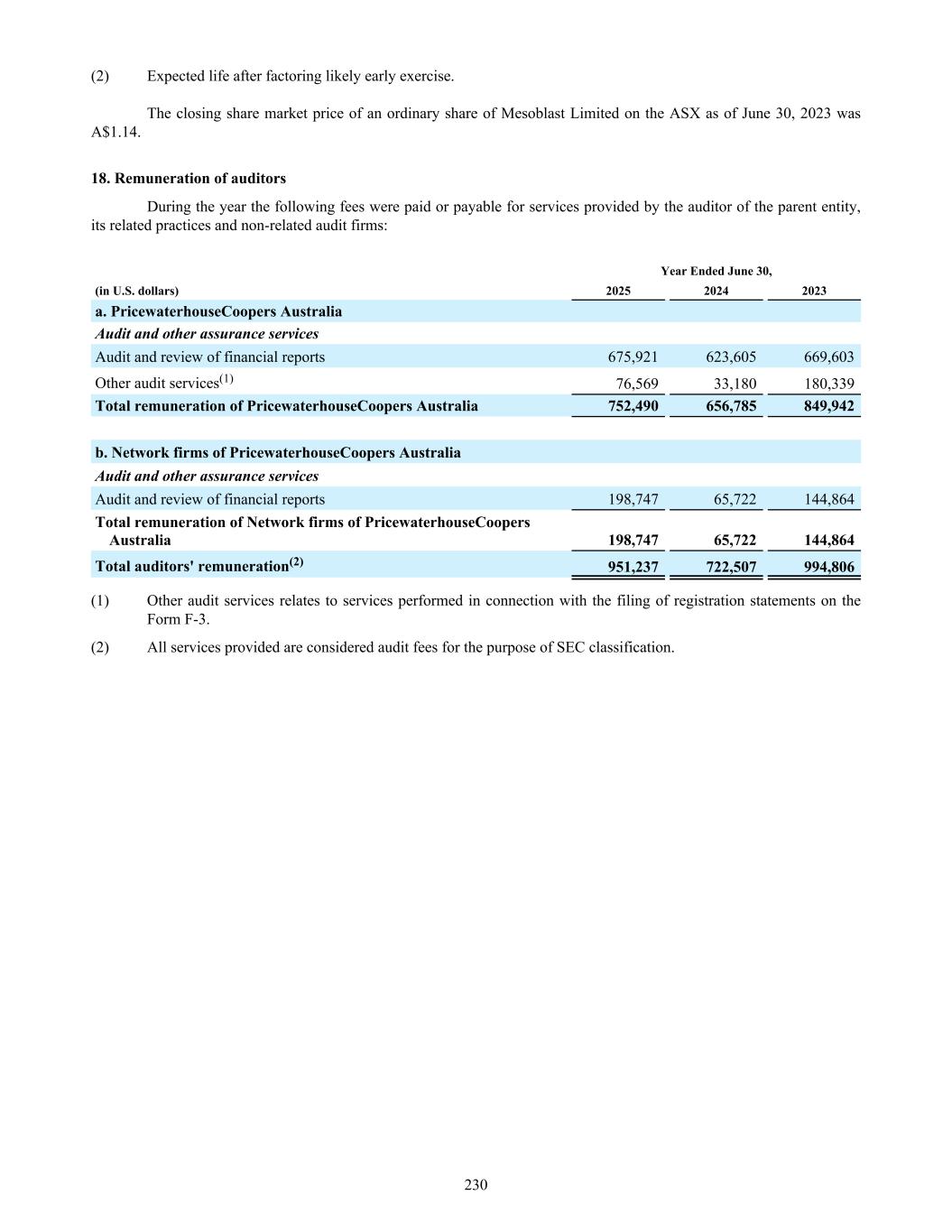 (2) Expected life after factoring likely early exercise. The closing share market price of an ordinary share of Mesoblast Limited on the ASX as of June 30, 2023 was A$1.14. 18. Remuneration of auditors During the year the following fees were paid or payable for services provided by the auditor of the parent entity, its related practices and non-related audit firms: Year Ended June 30, (in U.S. dollars) 2025 2024 2023 a. PricewaterhouseCoopers Australia Audit and other assurance services Audit and review of financial reports 675,921 623,605 669,603 Other audit services(1) 76,569 33,180 180,339 Total remuneration of PricewaterhouseCoopers Australia 752,490 656,785 849,942 b. Network firms of PricewaterhouseCoopers Australia Audit and other assurance services Audit and review of financial reports 198,747 65,722 144,864 Total remuneration of Network firms of PricewaterhouseCoopers Australia 198,747 65,722 144,864 Total auditors' remuneration(2) 951,237 722,507 994,806 (1) Other audit services relates to services performed in connection with the filing of registration statements on the Form F-3. (2) All services provided are considered audit fees for the purpose of SEC classification. 230