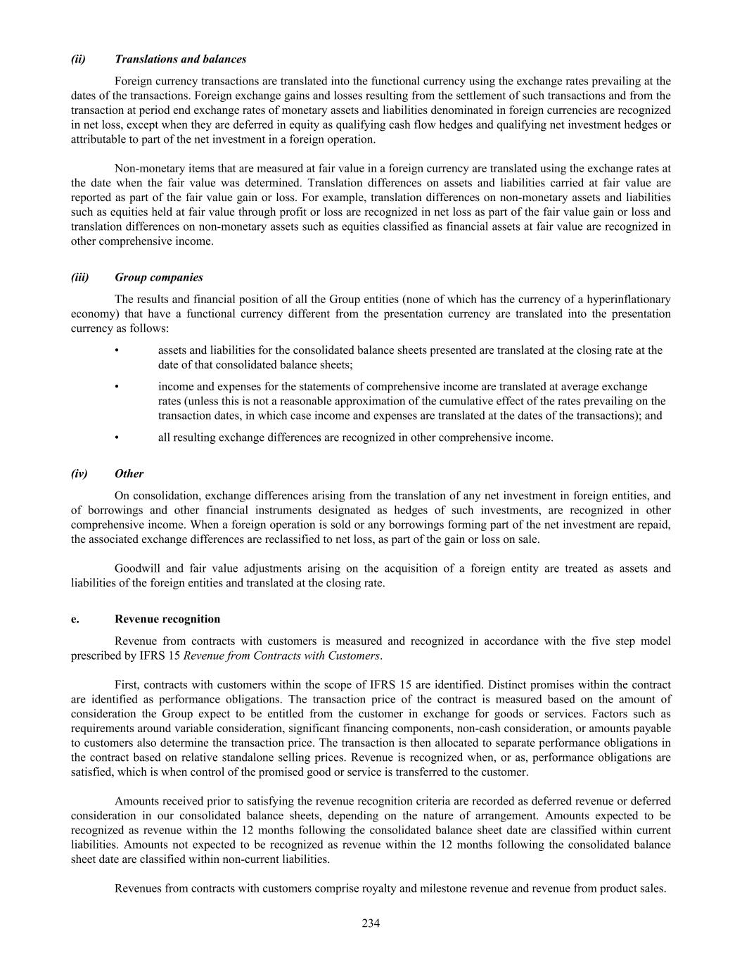 (ii) Translations and balances Foreign currency transactions are translated into the functional currency using the exchange rates prevailing at the dates of the transactions. Foreign exchange gains and losses resulting from the settlement of such transactions and from the transaction at period end exchange rates of monetary assets and liabilities denominated in foreign currencies are recognized in net loss, except when they are deferred in equity as qualifying cash flow hedges and qualifying net investment hedges or attributable to part of the net investment in a foreign operation. Non-monetary items that are measured at fair value in a foreign currency are translated using the exchange rates at the date when the fair value was determined. Translation differences on assets and liabilities carried at fair value are reported as part of the fair value gain or loss. For example, translation differences on non-monetary assets and liabilities such as equities held at fair value through profit or loss are recognized in net loss as part of the fair value gain or loss and translation differences on non-monetary assets such as equities classified as financial assets at fair value are recognized in other comprehensive income. (iii) Group companies The results and financial position of all the Group entities (none of which has the currency of a hyperinflationary economy) that have a functional currency different from the presentation currency are translated into the presentation currency as follows: • assets and liabilities for the consolidated balance sheets presented are translated at the closing rate at the date of that consolidated balance sheets; • income and expenses for the statements of comprehensive income are translated at average exchange rates (unless this is not a reasonable approximation of the cumulative effect of the rates prevailing on the transaction dates, in which case income and expenses are translated at the dates of the transactions); and • all resulting exchange differences are recognized in other comprehensive income. (iv) Other On consolidation, exchange differences arising from the translation of any net investment in foreign entities, and of borrowings and other financial instruments designated as hedges of such investments, are recognized in other comprehensive income. When a foreign operation is sold or any borrowings forming part of the net investment are repaid, the associated exchange differences are reclassified to net loss, as part of the gain or loss on sale. Goodwill and fair value adjustments arising on the acquisition of a foreign entity are treated as assets and liabilities of the foreign entities and translated at the closing rate. e. Revenue recognition Revenue from contracts with customers is measured and recognized in accordance with the five step model prescribed by IFRS 15 Revenue from Contracts with Customers. First, contracts with customers within the scope of IFRS 15 are identified. Distinct promises within the contract are identified as performance obligations. The transaction price of the contract is measured based on the amount of consideration the Group expect to be entitled from the customer in exchange for goods or services. Factors such as requirements around variable consideration, significant financing components, non-cash consideration, or amounts payable to customers also determine the transaction price. The transaction is then allocated to separate performance obligations in the contract based on relative standalone selling prices. Revenue is recognized when, or as, performance obligations are satisfied, which is when control of the promised good or service is transferred to the customer. Amounts received prior to satisfying the revenue recognition criteria are recorded as deferred revenue or deferred consideration in our consolidated balance sheets, depending on the nature of arrangement. Amounts expected to be recognized as revenue within the 12 months following the consolidated balance sheet date are classified within current liabilities. Amounts not expected to be recognized as revenue within the 12 months following the consolidated balance sheet date are classified within non-current liabilities. Revenues from contracts with customers comprise royalty and milestone revenue and revenue from product sales. 234