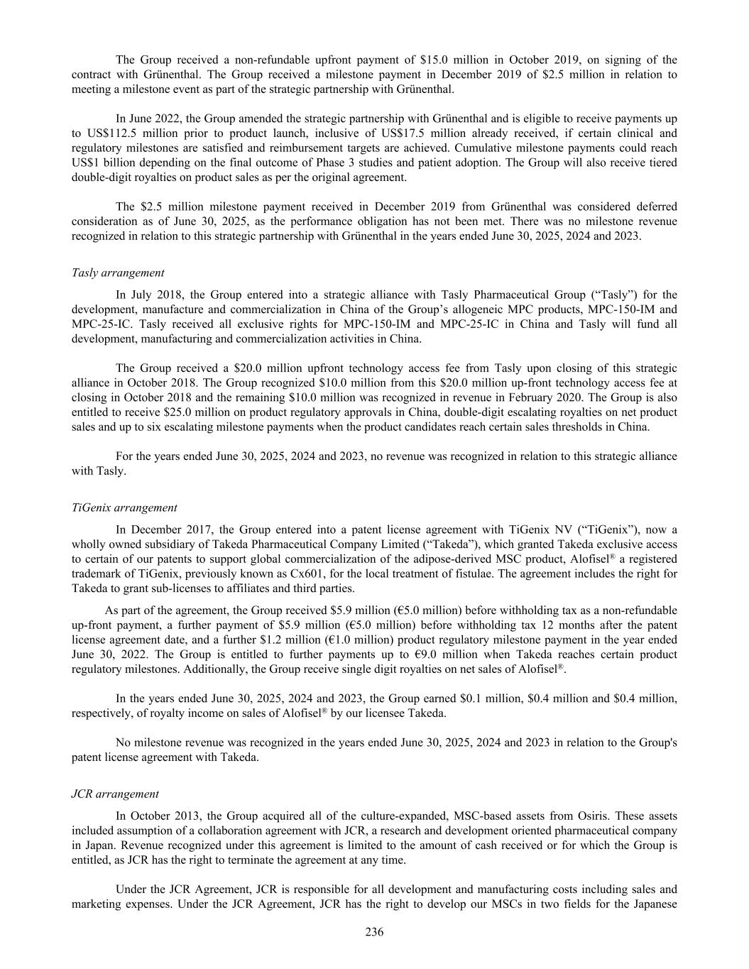 The Group received a non-refundable upfront payment of $15.0 million in October 2019, on signing of the contract with Grünenthal. The Group received a milestone payment in December 2019 of $2.5 million in relation to meeting a milestone event as part of the strategic partnership with Grünenthal. In June 2022, the Group amended the strategic partnership with Grünenthal and is eligible to receive payments up to US$112.5 million prior to product launch, inclusive of US$17.5 million already received, if certain clinical and regulatory milestones are satisfied and reimbursement targets are achieved. Cumulative milestone payments could reach US$1 billion depending on the final outcome of Phase 3 studies and patient adoption. The Group will also receive tiered double-digit royalties on product sales as per the original agreement. The $2.5 million milestone payment received in December 2019 from Grünenthal was considered deferred consideration as of June 30, 2025, as the performance obligation has not been met. There was no milestone revenue recognized in relation to this strategic partnership with Grünenthal in the years ended June 30, 2025, 2024 and 2023. Tasly arrangement In July 2018, the Group entered into a strategic alliance with Tasly Pharmaceutical Group (“Tasly”) for the development, manufacture and commercialization in China of the Group’s allogeneic MPC products, MPC-150-IM and MPC-25-IC. Tasly received all exclusive rights for MPC-150-IM and MPC-25-IC in China and Tasly will fund all development, manufacturing and commercialization activities in China. The Group received a $20.0 million upfront technology access fee from Tasly upon closing of this strategic alliance in October 2018. The Group recognized $10.0 million from this $20.0 million up-front technology access fee at closing in October 2018 and the remaining $10.0 million was recognized in revenue in February 2020. The Group is also entitled to receive $25.0 million on product regulatory approvals in China, double-digit escalating royalties on net product sales and up to six escalating milestone payments when the product candidates reach certain sales thresholds in China. For the years ended June 30, 2025, 2024 and 2023, no revenue was recognized in relation to this strategic alliance with Tasly. TiGenix arrangement In December 2017, the Group entered into a patent license agreement with TiGenix NV (“TiGenix”), now a wholly owned subsidiary of Takeda Pharmaceutical Company Limited (“Takeda”), which granted Takeda exclusive access to certain of our patents to support global commercialization of the adipose-derived MSC product, Alofisel® a registered trademark of TiGenix, previously known as Cx601, for the local treatment of fistulae. The agreement includes the right for Takeda to grant sub-licenses to affiliates and third parties. As part of the agreement, the Group received $5.9 million (€5.0 million) before withholding tax as a non-refundable up-front payment, a further payment of $5.9 million (€5.0 million) before withholding tax 12 months after the patent license agreement date, and a further $1.2 million (€1.0 million) product regulatory milestone payment in the year ended June 30, 2022. The Group is entitled to further payments up to €9.0 million when Takeda reaches certain product regulatory milestones. Additionally, the Group receive single digit royalties on net sales of Alofisel®. In the years ended June 30, 2025, 2024 and 2023, the Group earned $0.1 million, $0.4 million and $0.4 million, respectively, of royalty income on sales of Alofisel® by our licensee Takeda. No milestone revenue was recognized in the years ended June 30, 2025, 2024 and 2023 in relation to the Group's patent license agreement with Takeda. JCR arrangement In October 2013, the Group acquired all of the culture-expanded, MSC-based assets from Osiris. These assets included assumption of a collaboration agreement with JCR, a research and development oriented pharmaceutical company in Japan. Revenue recognized under this agreement is limited to the amount of cash received or for which the Group is entitled, as JCR has the right to terminate the agreement at any time. Under the JCR Agreement, JCR is responsible for all development and manufacturing costs including sales and marketing expenses. Under the JCR Agreement, JCR has the right to develop our MSCs in two fields for the Japanese 236