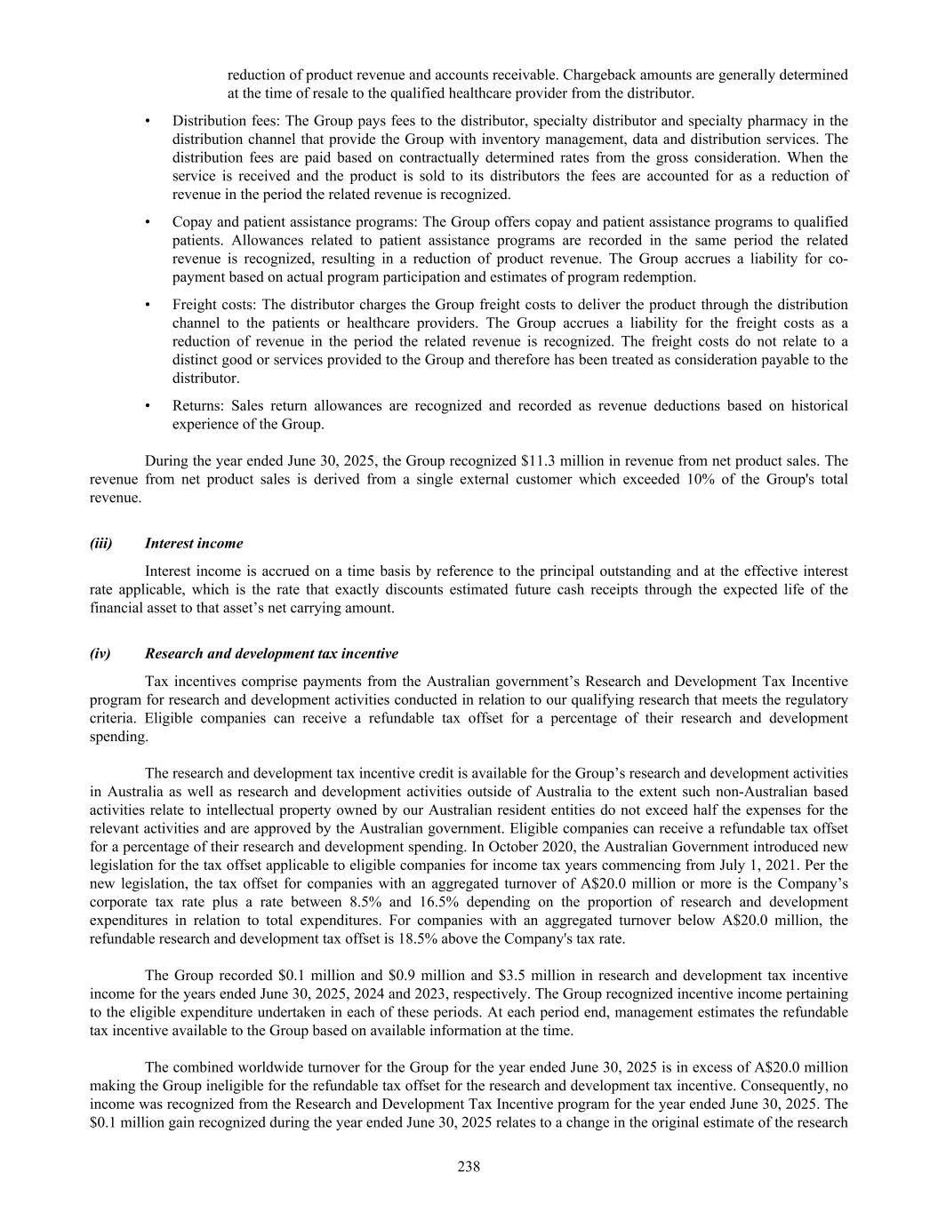 reduction of product revenue and accounts receivable. Chargeback amounts are generally determined at the time of resale to the qualified healthcare provider from the distributor. • Distribution fees: The Group pays fees to the distributor, specialty distributor and specialty pharmacy in the distribution channel that provide the Group with inventory management, data and distribution services. The distribution fees are paid based on contractually determined rates from the gross consideration. When the service is received and the product is sold to its distributors the fees are accounted for as a reduction of revenue in the period the related revenue is recognized. • Copay and patient assistance programs: The Group offers copay and patient assistance programs to qualified patients. Allowances related to patient assistance programs are recorded in the same period the related revenue is recognized, resulting in a reduction of product revenue. The Group accrues a liability for co- payment based on actual program participation and estimates of program redemption. • Freight costs: The distributor charges the Group freight costs to deliver the product through the distribution channel to the patients or healthcare providers. The Group accrues a liability for the freight costs as a reduction of revenue in the period the related revenue is recognized. The freight costs do not relate to a distinct good or services provided to the Group and therefore has been treated as consideration payable to the distributor. • Returns: Sales return allowances are recognized and recorded as revenue deductions based on historical experience of the Group. During the year ended June 30, 2025, the Group recognized $11.3 million in revenue from net product sales. The revenue from net product sales is derived from a single external customer which exceeded 10% of the Group's total revenue. (iii) Interest income Interest income is accrued on a time basis by reference to the principal outstanding and at the effective interest rate applicable, which is the rate that exactly discounts estimated future cash receipts through the expected life of the financial asset to that asset’s net carrying amount. (iv) Research and development tax incentive Tax incentives comprise payments from the Australian government’s Research and Development Tax Incentive program for research and development activities conducted in relation to our qualifying research that meets the regulatory criteria. Eligible companies can receive a refundable tax offset for a percentage of their research and development spending. The research and development tax incentive credit is available for the Group’s research and development activities in Australia as well as research and development activities outside of Australia to the extent such non-Australian based activities relate to intellectual property owned by our Australian resident entities do not exceed half the expenses for the relevant activities and are approved by the Australian government. Eligible companies can receive a refundable tax offset for a percentage of their research and development spending. In October 2020, the Australian Government introduced new legislation for the tax offset applicable to eligible companies for income tax years commencing from July 1, 2021. Per the new legislation, the tax offset for companies with an aggregated turnover of A$20.0 million or more is the Company’s corporate tax rate plus a rate between 8.5% and 16.5% depending on the proportion of research and development expenditures in relation to total expenditures. For companies with an aggregated turnover below A$20.0 million, the refundable research and development tax offset is 18.5% above the Company's tax rate. The Group recorded $0.1 million and $0.9 million and $3.5 million in research and development tax incentive income for the years ended June 30, 2025, 2024 and 2023, respectively. The Group recognized incentive income pertaining to the eligible expenditure undertaken in each of these periods. At each period end, management estimates the refundable tax incentive available to the Group based on available information at the time. The combined worldwide turnover for the Group for the year ended June 30, 2025 is in excess of A$20.0 million making the Group ineligible for the refundable tax offset for the research and development tax incentive. Consequently, no income was recognized from the Research and Development Tax Incentive program for the year ended June 30, 2025. The $0.1 million gain recognized during the year ended June 30, 2025 relates to a change in the original estimate of the research 238