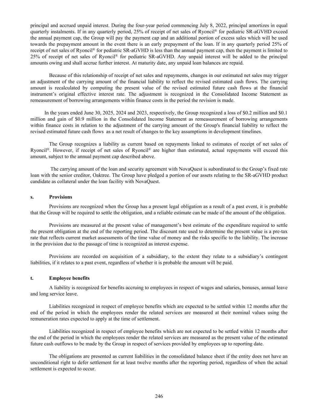 principal and accrued unpaid interest. During the four-year period commencing July 8, 2022, principal amortizes in equal quarterly instalments. If in any quarterly period, 25% of receipt of net sales of Ryoncil® for pediatric SR-aGVHD exceed the annual payment cap, the Group will pay the payment cap and an additional portion of excess sales which will be used towards the prepayment amount in the event there is an early prepayment of the loan. If in any quarterly period 25% of receipt of net sales of Ryoncil® for pediatric SR-aGVHD is less than the annual payment cap, then the payment is limited to 25% of receipt of net sales of Ryoncil® for pediatric SR-aGVHD. Any unpaid interest will be added to the principal amounts owing and shall accrue further interest. At maturity date, any unpaid loan balances are repaid. Because of this relationship of receipt of net sales and repayments, changes in our estimated net sales may trigger an adjustment of the carrying amount of the financial liability to reflect the revised estimated cash flows. The carrying amount is recalculated by computing the present value of the revised estimated future cash flows at the financial instrument’s original effective interest rate. The adjustment is recognized in the Consolidated Income Statement as remeasurement of borrowing arrangements within finance costs in the period the revision is made. In the years ended June 30, 2025, 2024 and 2023, respectively, the Group recognized a loss of $0.2 million and $0.1 million and gain of $0.9 million in the Consolidated Income Statement as remeasurement of borrowing arrangements within finance costs in relation to the adjustment of the carrying amount of the Group's financial liability to reflect the revised estimated future cash flows as a net result of changes to the key assumptions in development timelines. The Group recognizes a liability as current based on repayments linked to estimates of receipt of net sales of Ryoncil®. However, if receipt of net sales of Ryoncil® are higher than estimated, actual repayments will exceed this amount, subject to the annual payment cap described above. The carrying amount of the loan and security agreement with NovaQuest is subordinated to the Group’s fixed rate loan with the senior creditor, Oaktree. The Group have pledged a portion of our assets relating to the SR-aGVHD product candidate as collateral under the loan facility with NovaQuest. s. Provisions Provisions are recognized when the Group has a present legal obligation as a result of a past event, it is probable that the Group will be required to settle the obligation, and a reliable estimate can be made of the amount of the obligation. Provisions are measured at the present value of management’s best estimate of the expenditure required to settle the present obligation at the end of the reporting period. The discount rate used to determine the present value is a pre-tax rate that reflects current market assessments of the time value of money and the risks specific to the liability. The increase in the provision due to the passage of time is recognized as interest expense. Provisions are recorded on acquisition of a subsidiary, to the extent they relate to a subsidiary’s contingent liabilities, if it relates to a past event, regardless of whether it is probable the amount will be paid. t. Employee benefits A liability is recognized for benefits accruing to employees in respect of wages and salaries, bonuses, annual leave and long service leave. Liabilities recognized in respect of employee benefits which are expected to be settled within 12 months after the end of the period in which the employees render the related services are measured at their nominal values using the remuneration rates expected to apply at the time of settlement. Liabilities recognized in respect of employee benefits which are not expected to be settled within 12 months after the end of the period in which the employees render the related services are measured as the present value of the estimated future cash outflows to be made by the Group in respect of services provided by employees up to reporting date. The obligations are presented as current liabilities in the consolidated balance sheet if the entity does not have an unconditional right to defer settlement for at least twelve months after the reporting period, regardless of when the actual settlement is expected to occur. 246