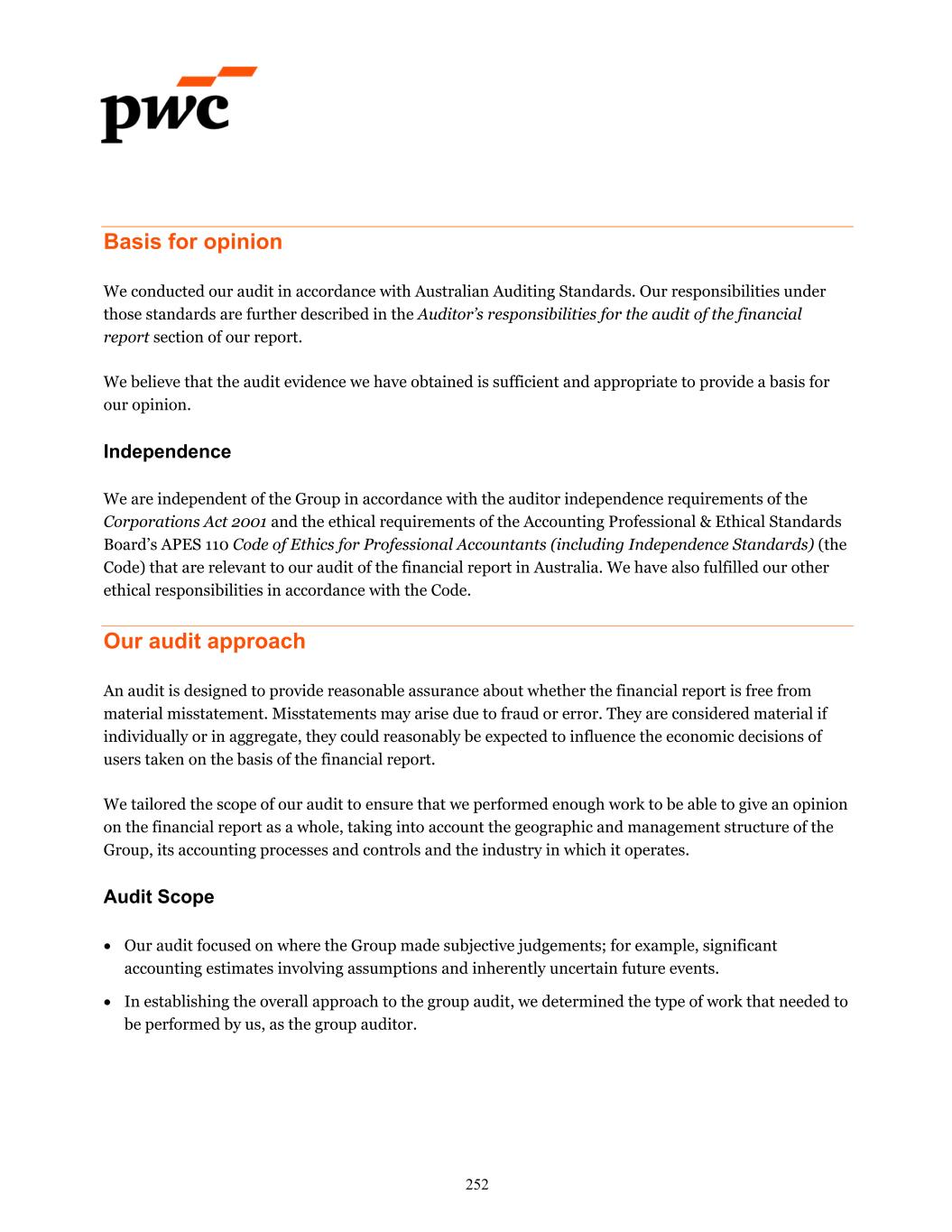 Basis for opinion We conducted our audit in accordance with Australian Auditing Standards. Our responsibilities under those standards are further described in the Auditor’s responsibilities for the audit of the financial report section of our report. We believe that the audit evidence we have obtained is sufficient and appropriate to provide a basis for our opinion. Independence We are independent of the Group in accordance with the auditor independence requirements of the Corporations Act 2001 and the ethical requirements of the Accounting Professional & Ethical Standards Board’s APES 110 Code of Ethics for Professional Accountants (including Independence Standards) (the Code) that are relevant to our audit of the financial report in Australia. We have also fulfilled our other ethical responsibilities in accordance with the Code. Our audit approach An audit is designed to provide reasonable assurance about whether the financial report is free from material misstatement. Misstatements may arise due to fraud or error. They are considered material if individually or in aggregate, they could reasonably be expected to influence the economic decisions of users taken on the basis of the financial report. We tailored the scope of our audit to ensure that we performed enough work to be able to give an opinion on the financial report as a whole, taking into account the geographic and management structure of the Group, its accounting processes and controls and the industry in which it operates. Audit Scope Our audit focused on where the Group made subjective judgements; for example, significant accounting estimates involving assumptions and inherently uncertain future events. In establishing the overall approach to the group audit, we determined the type of work that needed to be performed by us, as the group auditor. 252