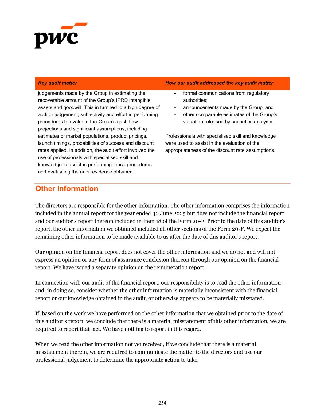 Key audit matter How our audit addressed the key audit matter judgements made by the Group in estimating the recoverable amount of the Group’s IPRD intangible assets and goodwill. This in turn led to a high degree of auditor judgement, subjectivity and effort in performing procedures to evaluate the Group’s cash flow projections and significant assumptions, including estimates of market populations, product pricings, launch timings, probabilities of success and discount rates applied. In addition, the audit effort involved the use of professionals with specialised skill and knowledge to assist in performing these procedures and evaluating the audit evidence obtained. - formal communications from regulatory authorities; - announcements made by the Group; and - other comparable estimates of the Group’s valuation released by securities analysts. Professionals with specialised skill and knowledge were used to assist in the evaluation of the appropriateness of the discount rate assumptions. Other information The directors are responsible for the other information. The other information comprises the information included in the annual report for the year ended 30 June 2025 but does not include the financial report and our auditor’s report thereon included in Item 18 of the Form 20-F. Prior to the date of this auditor's report, the other information we obtained included all other sections of the Form 20-F. We expect the remaining other information to be made available to us after the date of this auditor's report. Our opinion on the financial report does not cover the other information and we do not and will not express an opinion or any form of assurance conclusion thereon through our opinion on the financial report. We have issued a separate opinion on the remuneration report. In connection with our audit of the financial report, our responsibility is to read the other information and, in doing so, consider whether the other information is materially inconsistent with the financial report or our knowledge obtained in the audit, or otherwise appears to be materially misstated. If, based on the work we have performed on the other information that we obtained prior to the date of this auditor’s report, we conclude that there is a material misstatement of this other information, we are required to report that fact. We have nothing to report in this regard. When we read the other information not yet received, if we conclude that there is a material misstatement therein, we are required to communicate the matter to the directors and use our professional judgement to determine the appropriate action to take. 254