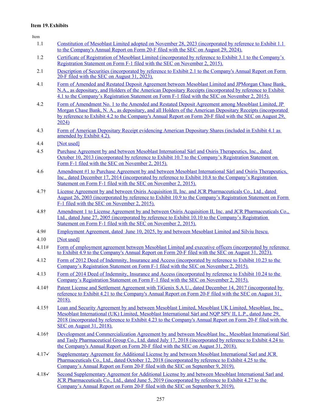 Item 19. Exhibits Item 1.1 Constitution of Mesoblast Limited adopted on November 28, 2023 (incorporated by reference to Exhibit 1.1 to the Company's Annual Report on Form 20-F filed with the SEC on August 29, 2024). 1.2 Certificate of Registration of Mesoblast Limited (incorporated by reference to Exhibit 3.1 to the Company’s Registration Statement on Form F-1 filed with the SEC on November 2, 2015). 2.1 Description of Securities (incorporated by reference to Exhibit 2.1 to the Company's Annual Report on Form 20-F filed with the SEC on August 31, 2023). 4.1 Form of Amended and Restated Deposit Agreement between Mesoblast Limited and JPMorgan Chase Bank, N.A., as depositary, and Holders of the American Depositary Receipts (incorporated by reference to Exhibit 4.1 to the Company’s Registration Statement on Form F-1 filed with the SEC on November 2, 2015). 4.2 Form of Amendment No. 1 to the Amended and Restated Deposit Agreement among Mesoblast Limited, JP Morgan Chase Bank, N. A., as depositary, and all Holders of the American Depositary Receipts (incorporated by reference to Exhibit 4.2 to the Company's Annual Report on Form 20-F filed with the SEC on August 29, 2024) 4.3 Form of American Depositary Receipt evidencing American Depositary Shares (included in Exhibit 4.1 as amended by Exhibit 4.2). 4.4 [Not used] 4.5 Purchase Agreement by and between Mesoblast International Sàrl and Osiris Therapeutics, Inc., dated October 10, 2013 (incorporated by reference to Exhibit 10.7 to the Company’s Registration Statement on Form F-1 filed with the SEC on November 2, 2015). 4.6 Amendment #1 to Purchase Agreement by and between Mesoblast International Sàrl and Osiris Therapeutics, Inc., dated December 17, 2014 (incorporated by reference to Exhibit 10.8 to the Company’s Registration Statement on Form F-1 filed with the SEC on November 2, 2015). 4.7† License Agreement by and between Osiris Acquisition II, Inc. and JCR Pharmaceuticals Co., Ltd., dated August 26, 2003 (incorporated by reference to Exhibit 10.9 to the Company’s Registration Statement on Form F-1 filed with the SEC on November 2, 2015). 4.8† Amendment 1 to License Agreement by and between Osiris Acquisition II, Inc. and JCR Pharmaceuticals Co., Ltd., dated June 27, 2005 (incorporated by reference to Exhibit 10.10 to the Company’s Registration Statement on Form F-1 filed with the SEC on November 2, 2015). 4.9# Employment Agreement, dated June 10, 2025, by and between Mesoblast Limited and Silviu Itescu. 4.10 [Not used] 4.11# Form of employment agreement between Mesoblast Limited and executive officers (incorporated by reference to Exhibit 4.9 to the Company's Annual Report on Form 20-F filed with the SEC on August 31, 2023). 4.12 Form of 2012 Deed of Indemnity, Insurance and Access (incorporated by reference to Exhibit 10.23 to the Company’s Registration Statement on Form F-1 filed with the SEC on November 2, 2015). 4.13 Form of 2014 Deed of Indemnity, Insurance and Access (incorporated by reference to Exhibit 10.24 to the Company’s Registration Statement on Form F-1 filed with the SEC on November 2, 2015). 4.14† Patent License and Settlement Agreement with TiGenix S.A.U., dated December 14, 2017 (incorporated by reference to Exhibit 4.21 to the Company's Annual Report on Form 20-F filed with the SEC on August 31, 2018). 4.15† Loan and Security Agreement by and between Mesoblast Limited, Mesoblast UK Limited, Mesoblast, Inc., Mesoblast International (UK) Limited, Mesoblast International Sàrl and NQP SPV II, L.P., dated June 29, 2018 (incorporated by reference to Exhibit 4.23 to the Company's Annual Report on Form 20-F filed with the SEC on August 31, 2018). 4.16† Development and Commercialization Agreement by and between Mesoblast Inc., Mesoblast International Sàrl and Tasly Pharmaceutical Group Co., Ltd. dated July 17, 2018 (incorporated by reference to Exhibit 4.24 to the Company's Annual Report on Form 20-F filed with the SEC on August 31, 2018). 4.17✓ Supplementary Agreement for Additional License by and between Mesoblast International Sarl and JCR Pharmaceuticals Co., Ltd., dated October 12, 2018 (incorporated by reference to Exhibit 4.25 to the Company’s Annual Report on Form 20-F filed with the SEC on September 9, 2019). 4.18✓ Second Supplementary Agreement for Additional License by and between Mesoblast International Sarl and JCR Pharmaceuticals Co., Ltd., dated June 5, 2019 (incorporated by reference to Exhibit 4.27 to the Company’s Annual Report on Form 20-F filed with the SEC on September 9, 2019). 257