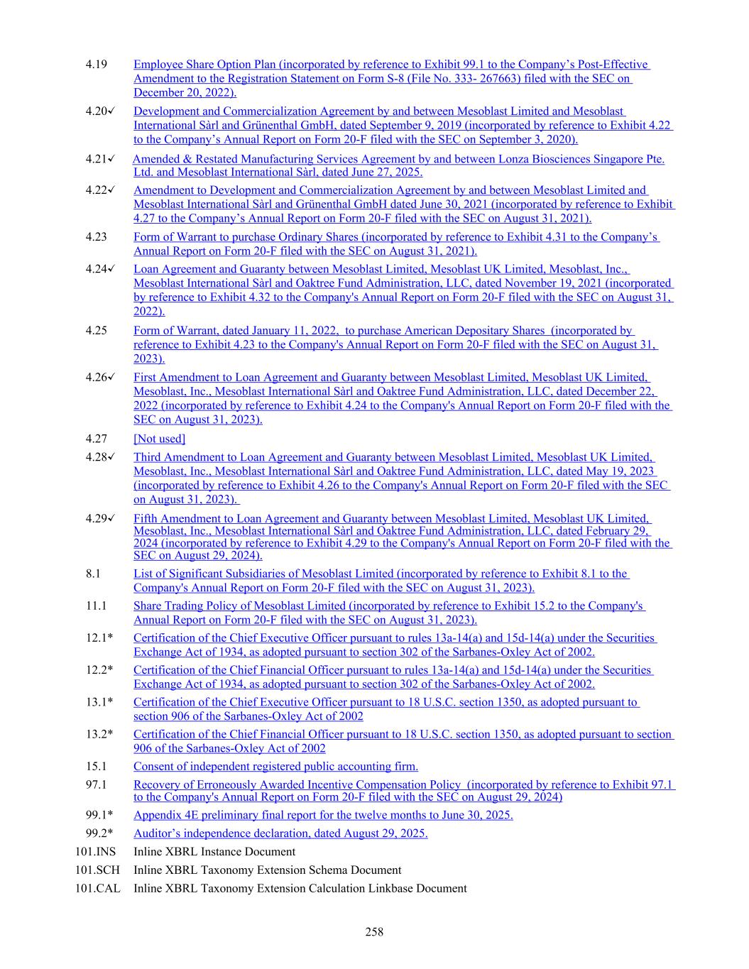 4.19 Employee Share Option Plan (incorporated by reference to Exhibit 99.1 to the Company’s Post-Effective Amendment to the Registration Statement on Form S-8 (File No. 333- 267663) filed with the SEC on December 20, 2022). 4.20✓ Development and Commercialization Agreement by and between Mesoblast Limited and Mesoblast International Sàrl and Grünenthal GmbH, dated September 9, 2019 (incorporated by reference to Exhibit 4.22 to the Company’s Annual Report on Form 20-F filed with the SEC on September 3, 2020). 4.21✓ Amended & Restated Manufacturing Services Agreement by and between Lonza Biosciences Singapore Pte. Ltd. and Mesoblast International Sàrl, dated June 27, 2025. 4.22✓ Amendment to Development and Commercialization Agreement by and between Mesoblast Limited and Mesoblast International Sàrl and Grünenthal GmbH dated June 30, 2021 (incorporated by reference to Exhibit 4.27 to the Company’s Annual Report on Form 20-F filed with the SEC on August 31, 2021). 4.23 Form of Warrant to purchase Ordinary Shares (incorporated by reference to Exhibit 4.31 to the Company’s Annual Report on Form 20-F filed with the SEC on August 31, 2021). 4.24✓ Loan Agreement and Guaranty between Mesoblast Limited, Mesoblast UK Limited, Mesoblast, Inc., Mesoblast International Sàrl and Oaktree Fund Administration, LLC, dated November 19, 2021 (incorporated by reference to Exhibit 4.32 to the Company's Annual Report on Form 20-F filed with the SEC on August 31, 2022). 4.25 Form of Warrant, dated January 11, 2022, to purchase American Depositary Shares (incorporated by reference to Exhibit 4.23 to the Company's Annual Report on Form 20-F filed with the SEC on August 31, 2023). 4.26✓ First Amendment to Loan Agreement and Guaranty between Mesoblast Limited, Mesoblast UK Limited, Mesoblast, Inc., Mesoblast International Sàrl and Oaktree Fund Administration, LLC, dated December 22, 2022 (incorporated by reference to Exhibit 4.24 to the Company's Annual Report on Form 20-F filed with the SEC on August 31, 2023). 4.27 [Not used] 4.28✓ Third Amendment to Loan Agreement and Guaranty between Mesoblast Limited, Mesoblast UK Limited, Mesoblast, Inc., Mesoblast International Sàrl and Oaktree Fund Administration, LLC, dated May 19, 2023 (incorporated by reference to Exhibit 4.26 to the Company's Annual Report on Form 20-F filed with the SEC on August 31, 2023). 4.29✓ Fifth Amendment to Loan Agreement and Guaranty between Mesoblast Limited, Mesoblast UK Limited, Mesoblast, Inc., Mesoblast International Sàrl and Oaktree Fund Administration, LLC, dated February 29, 2024 (incorporated by reference to Exhibit 4.29 to the Company's Annual Report on Form 20-F filed with the SEC on August 29, 2024). 8.1 List of Significant Subsidiaries of Mesoblast Limited (incorporated by reference to Exhibit 8.1 to the Company's Annual Report on Form 20-F filed with the SEC on August 31, 2023). 11.1 Share Trading Policy of Mesoblast Limited (incorporated by reference to Exhibit 15.2 to the Company's Annual Report on Form 20-F filed with the SEC on August 31, 2023). 12.1* Certification of the Chief Executive Officer pursuant to rules 13a-14(a) and 15d-14(a) under the Securities Exchange Act of 1934, as adopted pursuant to section 302 of the Sarbanes-Oxley Act of 2002. 12.2* Certification of the Chief Financial Officer pursuant to rules 13a-14(a) and 15d-14(a) under the Securities Exchange Act of 1934, as adopted pursuant to section 302 of the Sarbanes-Oxley Act of 2002. 13.1* Certification of the Chief Executive Officer pursuant to 18 U.S.C. section 1350, as adopted pursuant to section 906 of the Sarbanes-Oxley Act of 2002 13.2* Certification of the Chief Financial Officer pursuant to 18 U.S.C. section 1350, as adopted pursuant to section 906 of the Sarbanes-Oxley Act of 2002 15.1 Consent of independent registered public accounting firm. 97.1 Recovery of Erroneously Awarded Incentive Compensation Policy (incorporated by reference to Exhibit 97.1 to the Company's Annual Report on Form 20-F filed with the SEC on August 29, 2024) 99.1* Appendix 4E preliminary final report for the twelve months to June 30, 2025. 99.2* Auditor’s independence declaration, dated August 29, 2025. 101.INS Inline XBRL Instance Document 101.SCH Inline XBRL Taxonomy Extension Schema Document 101.CAL Inline XBRL Taxonomy Extension Calculation Linkbase Document 258