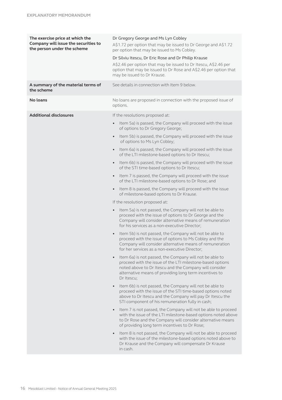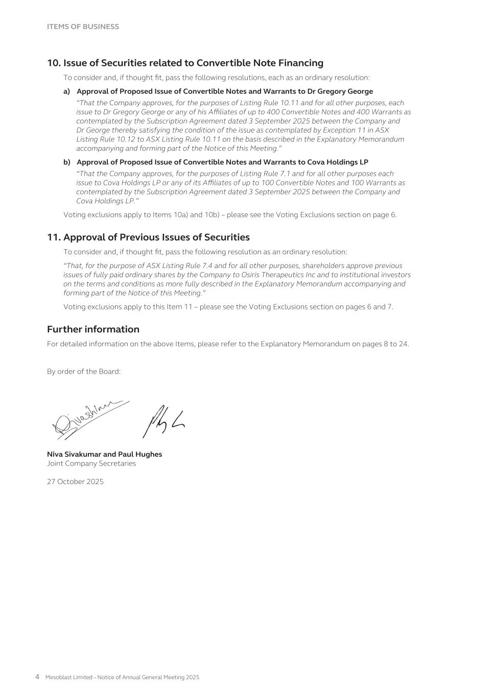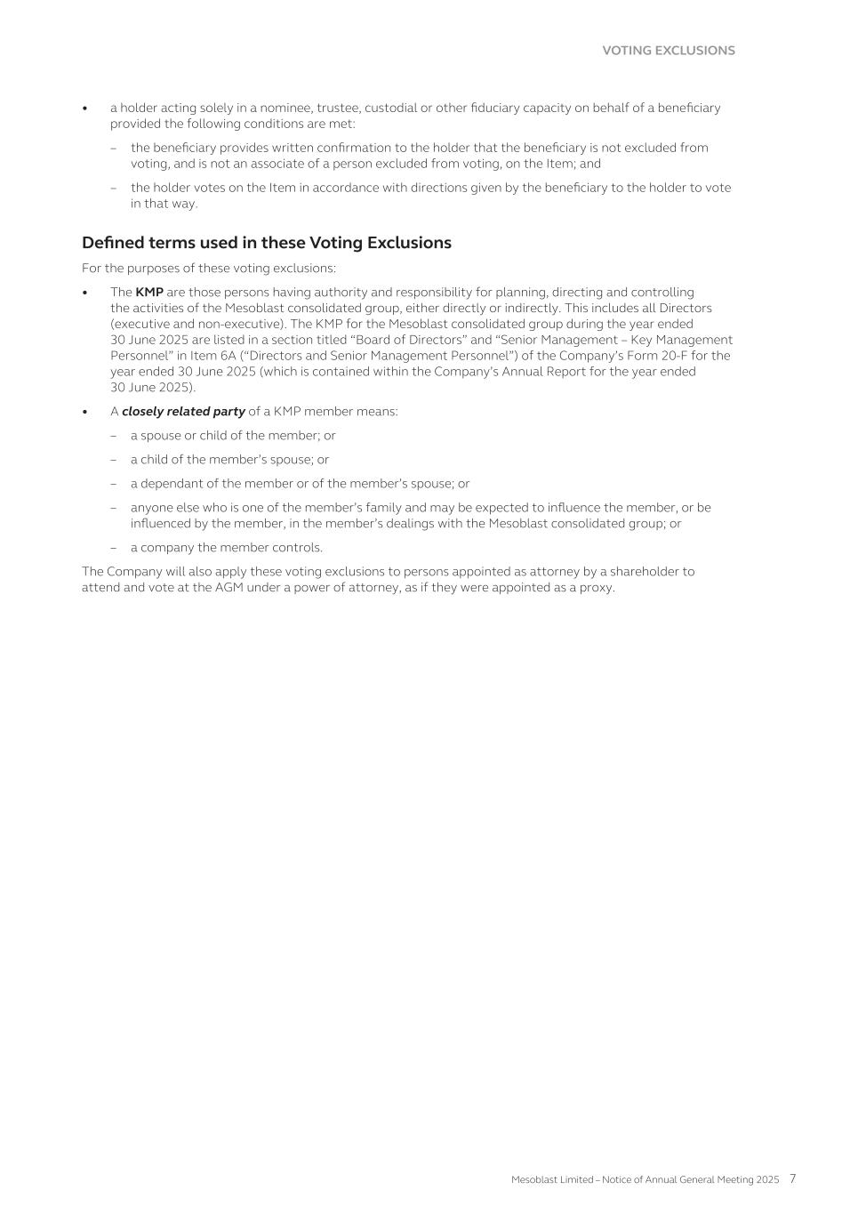 SHAREHOLDER INFORMATION A. Substantial Shareholders Holders of substantial holdings of ordinary shares in the Company and the numbers of shares in which they and their associates have a relevant interest as of 30 September 2025 (as disclosed in announcements lodged with the Australian Securities Exchange): Shareholder Number of ordinary shares held Gregory George and G to the Fourth Investments, LLC 267,021,132 Professor Silviu Itescu 78,958,928 William Gueck 64,171,900 B. Distribution of Equity Securities and Voting Rights Distribution of holders of equity securities as of 30 September 2025: Range Ordinary shares(1) Options(2) Warrants(3) ADS Warrants(4) Warrants 2(5) Number of holders % of Ordinary shares held by holders Number of holders % of Options held by holders Number of holders % of Warrants held by holders Number of holders % of ADS Warrants held by holders Number of holders % of Warrants 2 held by holders 1 – 1,000 12,356 0.47% 0 0% 0 0% 0 0% 0 0% 1,001 – 5,000 9,631 1.95% 0 0% 0 0% 0 0% 0 0% 5,001 – 10,000 3,067 1.85% 0 0% 3 0.13% 0 0% 0 0% 10,001 – 100,000 4,139 9.61% 15 1% 10 2.08% 7 45.04% 0 0% 100,001 and over 655 86.12% 80 99% 16 97.79% 3 54.96% 1 100% Total number of holders of equity securities 29,848 – 95 – 29 – 10 – 1 – (1) There are 2,795 holders of less than a marketable parcel of 211 ordinary shares ($2.37 per share) as of 30 September 2025. (2) There are 88,359,029 Options on issue as of 30 September 2025. (3) 15,027,327 Warrants are on issue as of 30 September 2025, including 6,830,602 Warrants issued to G to the Fourth Investments, LLC. (4) 884,838 ADS Warrants are on issue as of 30 September 2025, including 248,801 ADS Warrants issued to Oaktree LSL Fund Holdings EURRC S.A.R.L. (5) 2,000,000 Warrants 2 are on issue as 30 September 2025 issued to Dr Gregory George. The voting rights attaching to each class of equity securities are: i. Ordinary shares On a show of hands, every member present at a meeting, in person or by proxy, shall have one vote and upon a poll each share shall have one vote. ii. Other classes of equity securities There are no voting rights attaching to Options, Warrants, ADS Warrants or Warrants 2. MESOBLAST LIMITED 2025 ANNUAL REPORT 261
