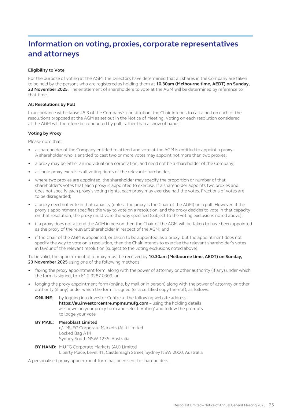 matters. As a result, our public shareholders and holders of the ADSs may have more difficulty in protecting their interests through actions against us, our management, our directors than would shareholders of a corporation incorporated in a jurisdiction in the United States. Item 4. Information on the Company 4.A History and Development of Mesoblast Mesoblast Limited Mesoblast Limited was incorporated on June 8, 2004 as a public company in Australia under the Corporations Act 2001 with an indefinite duration. On December 16, 2004 we became listed on the Australian Securities Exchange (the “ASX”). On November 13, 2015, we became listed on the Nasdaq Global Select Market (“Nasdaq”) and from this date we have been dual-listed in Australia and the United States. Our registered office is located at the following address: Mesoblast Ltd Level 38 55 Collins Street Melbourne VIC 3000 Australia Telephone: +61 3 9639 6036 Web: www.mesoblast.com Our agent for service of process in the United States is Mesoblast Inc., W.R. Grace Building, 1114 6th Avenue, 4th Floor, New York, NY 10036. All information we file with the SEC is available through the SEC's Electronic Data Gathering, Analysis and Retrieval system, which may be accessed through the SEC's website at www.sec.gov. For a list of our significant subsidiaries, see Exhibit 8.1 to this Annual Report. Important Corporate Developments Fiscal year 2025 to date of annual report July 2025 Mesoblast provided a commercial launch update for Ryoncil® (remestemcel-L-rknd). More than 25 transplant centers have been onboarded since product launch. Coverage for Ryoncil® continues to expand with over 250 million US lives insured by commercial and government payers. Federal Medicaid coverage by Centers for Medicare and Medicaid (CMS) is in place and mandatory fee-for-service Medicaid coverage for Ryoncil® became effective July 1 in all US states. Mesoblast received the United States Food and Drug Administration ("FDA") minutes from its Type B meeting for Revascor® (rexlemestrocel-L) confirming alignment on items regarding chemistry, manufacturing & controls (CMC), potency assays for commercial product release, and proposed design and primary endpoint for the confirmatory trial post approval in ischemic heart failure with reduced ejection fraction (HFrEF). June 2025 Held a Type B meeting with FDA for Revascor® to discuss components of a potential filing for accelerated approval in the treatment of patients with ischemic chronic HFrEF and inflammation implanted with a left ventricular assist device (LVAD). Announced an upcoming meeting with FDA to discuss a pivotal trial of Ryoncil® in adults with steroid-refractory acute graft versus host disease (SR-aGvHD). The trial will be conducted with the NIH-funded Bone Marrow Transplant Clinical Trials Network (BMT-CTN), the objective being to extend the product’s label from children to adults with SR-aGvHD. May 2025 Received seven years of orphan-drug exclusive approval from FDA for Ryoncil® for treatment of SR-aGvHD in pediatric patients 2 months of age and older April 2025 Appointed Lyn Cobley to the Mesoblast Board of Directors 43