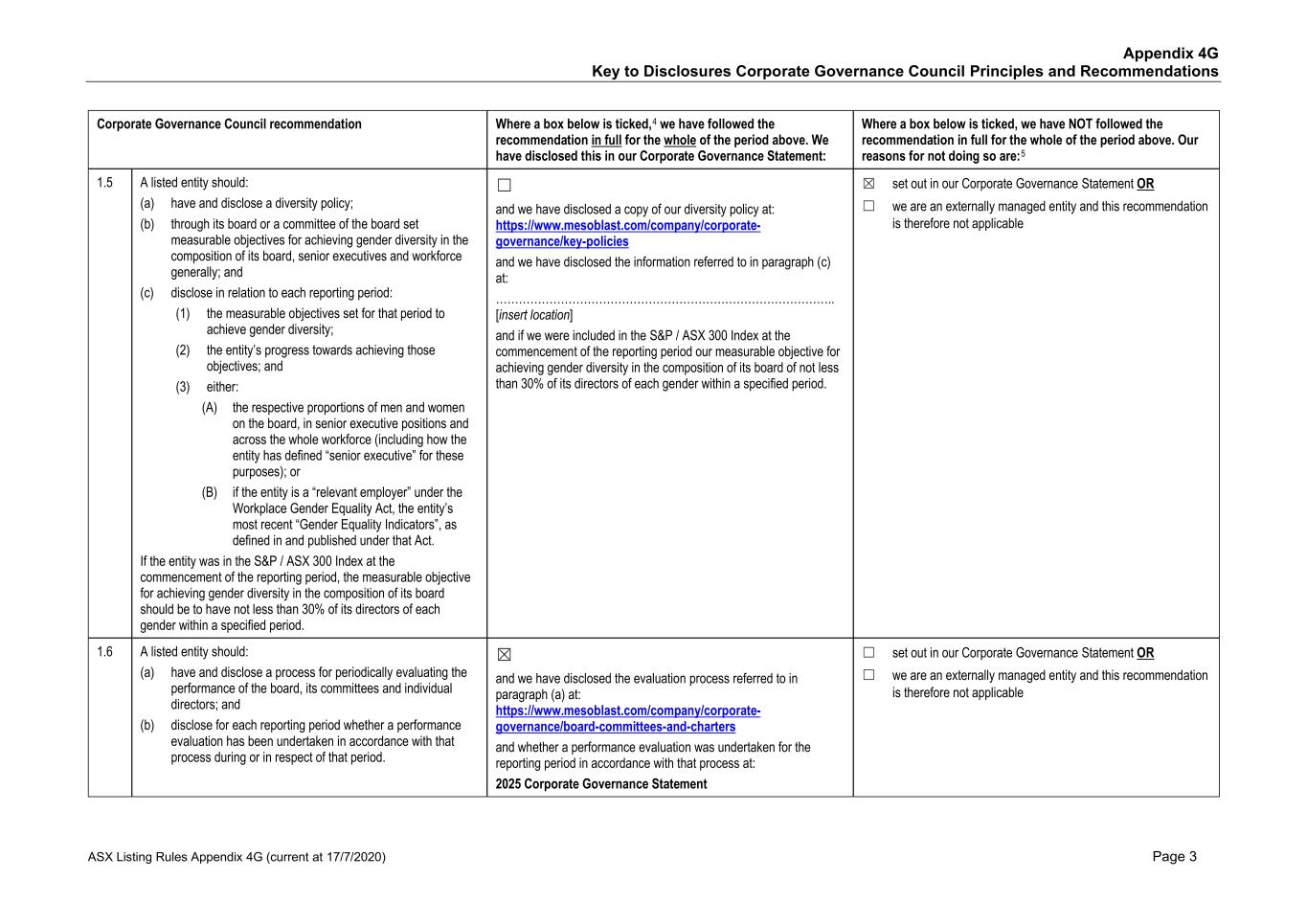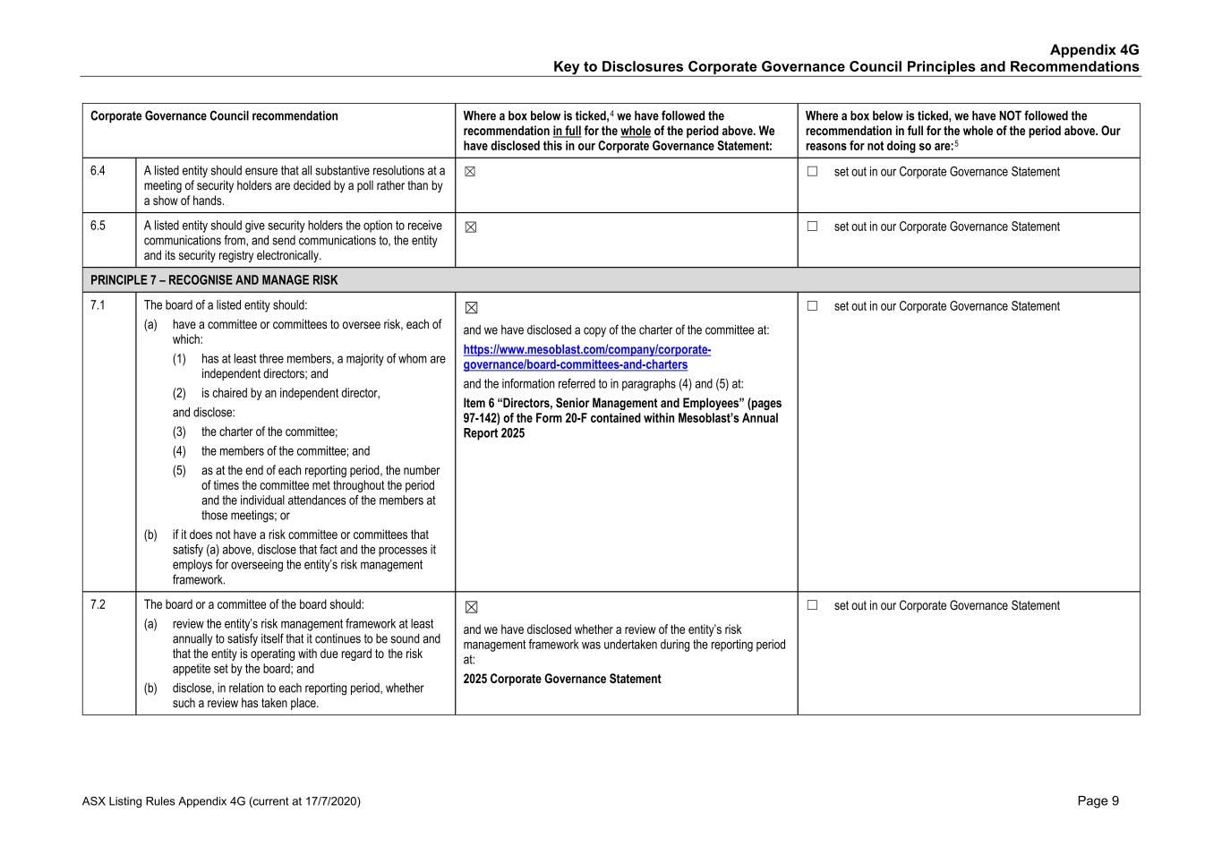 • Price reporting • Financial reporting • Securities trading • Ethical research • Interactions with the patient community • Ensuring product quality and patient safety • Interactions with healthcare professionals • Ethical marketing and advertising • Compliance with laws and regulations The Code also states that it is against Mesoblast policy for personnel to use illegal drugs or be under the influence of or impaired by alcohol or drugs while on company property or performing company work. No issues of Code non-compliance have been brought forward to the Board in FY25. Mesoblast has an Anti-Bribery and Anti-Corruption Policy and complies with global and regional laws preventing corrupt business practices and bribery, including the U.S. Foreign Corrupt Practices Act and the United Kingdom Bribery Act. We have a Disclosure of Complaints and Concerns Policy which addresses, among other things, breaches under the Company’s Code, Anti-Bribery and Anti-Corruption Policy, or other Company policies. Under the Disclosure of Complaints and Concerns Policy, Mesoblast personnel are entitled to robust employment protections if they report concerns and suspected violations covered under the policy. Personnel can report to Legal, Chair of the Board, or other officers or senior managers, and may do so anonymously. Further, Mesoblast’s Fair Treatment Policy requires personnel to report workplace harassment and prohibits retaliation of any kind against anyone who does so in good faith. During FY25, Mesoblast was in compliance with the Fair Treatment Policy. The Company is satisfied that it adhered to its policies in all material respects. In addition, Mesoblast has an ‘Ethics Hotline’ that is managed by a third-party, where our personnel and other stakeholders may make a report anonymously, 24 hours a day, seven days a week. There have been no whistle-blower reports to this hotline in the reporting period. All Mesoblast personnel are required to acknowledge the Code and other key policies and are required to participate in annual compliance training. The Company has a process in place to inform the Board or a committee of the Board of any material breaches of the Code, the Anti-Bribery and Anti-Corruption Policy, and material incidents reported under the Disclosure of Complaints and Concerns Policy. A copy of the Code and other key policies can be found at www.mesoblast.com. 3. Risk Management The Board is responsible for satisfying itself annually, or more frequently as required, that management has developed and implemented an effective system of risk management and internal control. Management is responsible for ensuring there are adequate policies in relation to risk management, compliance, and internal control systems. The ARC monitors Mesoblast’s risk management by overseeing management’s actions in the evaluation, management, monitoring, and reporting of material operational, financial, compliance, strategic, and certain ESG risks. Mesoblast’s risk management group is part of executive management. This group is responsible for designing, implementing, monitoring, and reporting on Mesoblast’s management of material business risks and the effectiveness of Mesoblast’s risk management and internal control system. ESG risks have been incorporated into and are considered as part of Mesoblast’s risk management system. Mesoblast's risk management group regularly reviews Mesoblast’s risks across its business and operations, and Mesoblast’s material business risks and risk management framework are reviewed at least annually by the ARC. 47