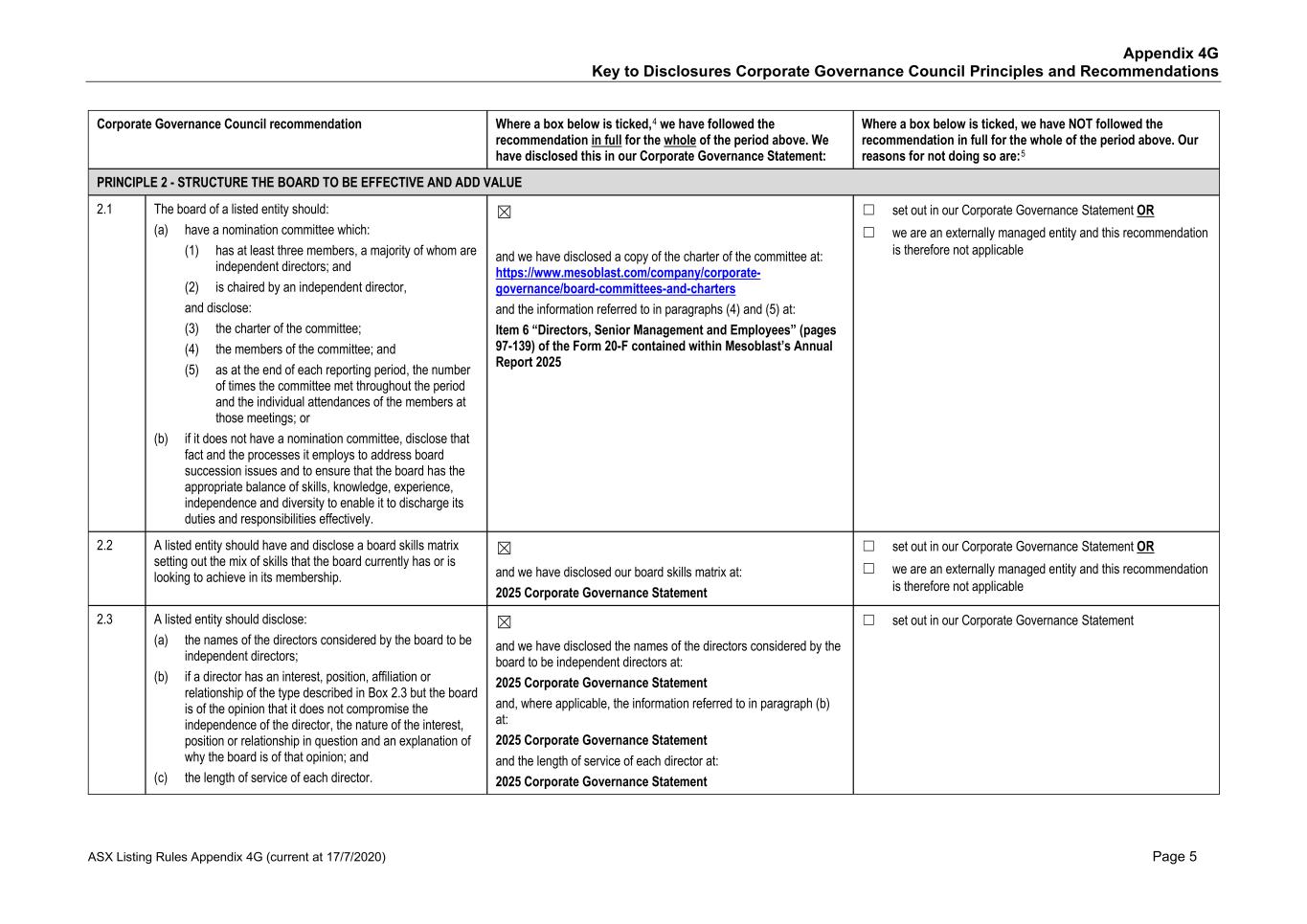 4. Human Capital Management 5. Product Quality and Patient Safety 6. Ethical Marketing 7. Supply Chain Management 8. Access to Healthcare 9. Environment These are dealt with in turn below. 1. Corporate Governance Mesoblast is committed to implementing and achieving an effective corporate governance framework to ensure that the Company is managed effectively, honestly and ethically. More information on our corporate governance practices is set out in Mesoblast’s Corporate Governance Statement, available at www.mesoblast.com. The Company references and reports against ASX Corporate Governance Council’s (Council) Corporate Governance Principles and Recommendations. Mesoblast’s Board of Directors (the “Board”) provides oversight of the Company’s ESG-related risks and opportunities on a regular basis at Board meetings, and in particular focus through its two committees: • Nomination and Remuneration Committee (“NRC”) • Audit and Risk Committee (“ARC”) The NRC assists the Board in the discharge of its responsibilities, and in particular to ensure that there is an environment where the Board can carry out effective and responsible decision-making and oversight, including on ESG matters such as fair remuneration and health & safety. Since June 2022, all independent, Non-Executive Directors of the Board are members of the NRC, reflecting the importance the Board places on ESG. In addition to its main financial reporting responsibilities, the ARC is tasked with overseeing the effective operation of Mesoblast’s risk management framework, in which certain ESG matters are considered. Management is responsible for assessing and managing ESG-related risks and opportunities within the board approved control framework, and for reporting progress against goals and targets to the Board. 2. Business Ethics, Integrity, and Compliance We are committed to the highest standards of ethical conduct and transparency in the way we deal with our patients, healthcare providers, employees, strategic partners, and other important stakeholders. We comply with all national and local laws and regulations applying to our Company. Zero cases of material non-compliance occurred in FY25. Mesoblast has established a Code of Business Conduct & Ethics (“Code”) to promote honest and ethical conduct, comprehensive disclosures of business dealings, compliance with government laws and regulations, and a positive work environment. All Mesoblast personnel, including Directors, officers, employees, contractors, and consultants, are expected to comply with the principles set out in the Code. The Code covers the following topics: • Our Values • Ethical business practices • Safe workplace and respectful workplace conduct • Fair competition • Conflicts of interest • Social media use • Confidentiality and protection of assets • Quality assurance 46