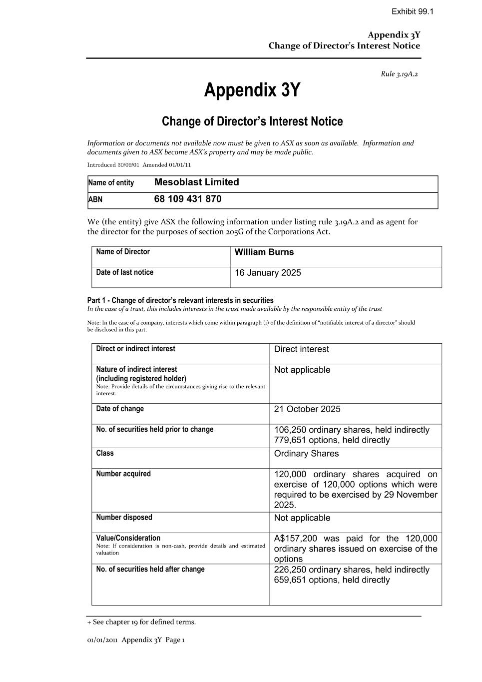 Appendix 3Y of Mesoblast Ltd, dated October 28, 2025. |
