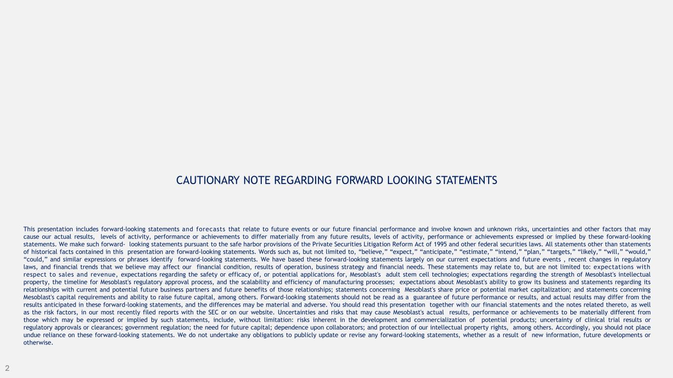 CAUTIONARY NOTE REGARDING FORWARD LOOKING STATEMENTS This presentation includes forward-looking statements and forecasts that relate to future events or our future financial performance and involve known and unknown risks, uncertainties and other factors that may cause our actual results, levels of activity, performance or achievements to differ materially from any future results, levels of activity, performance or achievements expressed or implied by these forward-looking statements. We make such forward- looking statements pursuant to the safe harbor provisions of the Private Securities Litigation Reform Act of 1995 and other federal securities laws. All statements other than statements of historical facts contained in this presentation are forward-looking statements. Words such as, but not limited to, “believe,” “expect,” “anticipate,” “estimate,” “intend,” “plan,” “targets,” “likely,” “will,” “would,” “could,” and similar expressions or phrases identify forward-looking statements. We have based these forward-looking statements largely on our current expectations and future events , recent changes in regulatory laws, and financial trends that we believe may affect our financial condition, results of operation, business strategy and financial needs. These statements may relate to, but are not limited to: expectations with respect to sales and revenue, expectations regarding the safety or efficacy of, or potential applications for, Mesoblast's adult stem cell technologies; expectations regarding the strength of Mesoblast's intellectual property, the timeline for Mesoblast's regulatory approval process, and the scalability and efficiency of manufacturing processes; expectations about Mesoblast's ability to grow its business and statements regarding its relationships with current and potential future business partners and future benefits of those relationships; statements concerning Mesoblast's share price or potential market capitalization; and statements concerning Mesoblast's capital requirements and ability to raise future capital, among others. Forward-looking statements should not be read as a guarantee of future performance or results, and actual results may differ from the results anticipated in these forward-looking statements, and the differences may be material and adverse. You should read this presentation together with our financial statements and the notes related thereto, as well as the risk factors, in our most recently filed reports with the SEC or on our website. Uncertainties and risks that may cause Mesoblast's actual results, performance or achievements to be materially different from those which may be expressed or implied by such statements, include, without limitation: risks inherent in the development and commercialization of potential products; uncertainty of clinical trial results or regulatory approvals or clearances; government regulation; the need for future capital; dependence upon collaborators; and protection of our intellectual property rights, among others. Accordingly, you should not place undue reliance on these forward-looking statements. We do not undertake any obligations to publicly update or revise any forward-looking statements, whether as a result of new information, future developments or otherwise. 2