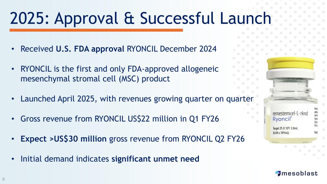 Press Release available at www.mesoblast.com 1. Please see the full Prescribing Information at www.ryoncil.com RYONCIL® is the first FDA-approved, off- the-shelf cell therapy for children aged 2 months and older, including adolescents and teenagers, with steroid-refractory acute graft versus host disease (SR- aGvHD), a life-threatening condition with high mortality rates.1