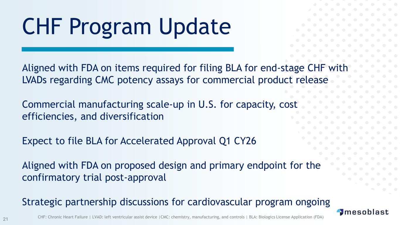 Aligned with FDA on items required for filing BLA for end-stage CHF with LVADs regarding CMC potency assays for commercial product release Commercial manufacturing scale-up in U.S. for capacity, cost efficiencies, and diversification Expect to file BLA for Accelerated Approval Q1 CY26 Aligned with FDA on proposed design and primary endpoint for the confirmatory trial post-approval Strategic partnership discussions for cardiovascular program ongoing CHF Program Update CHF: Chronic Heart Failure | LVAD: left ventricular assist device |CMC: chemistry, manufacturing, and controls | BLA: Biologics License Application (FDA) 21