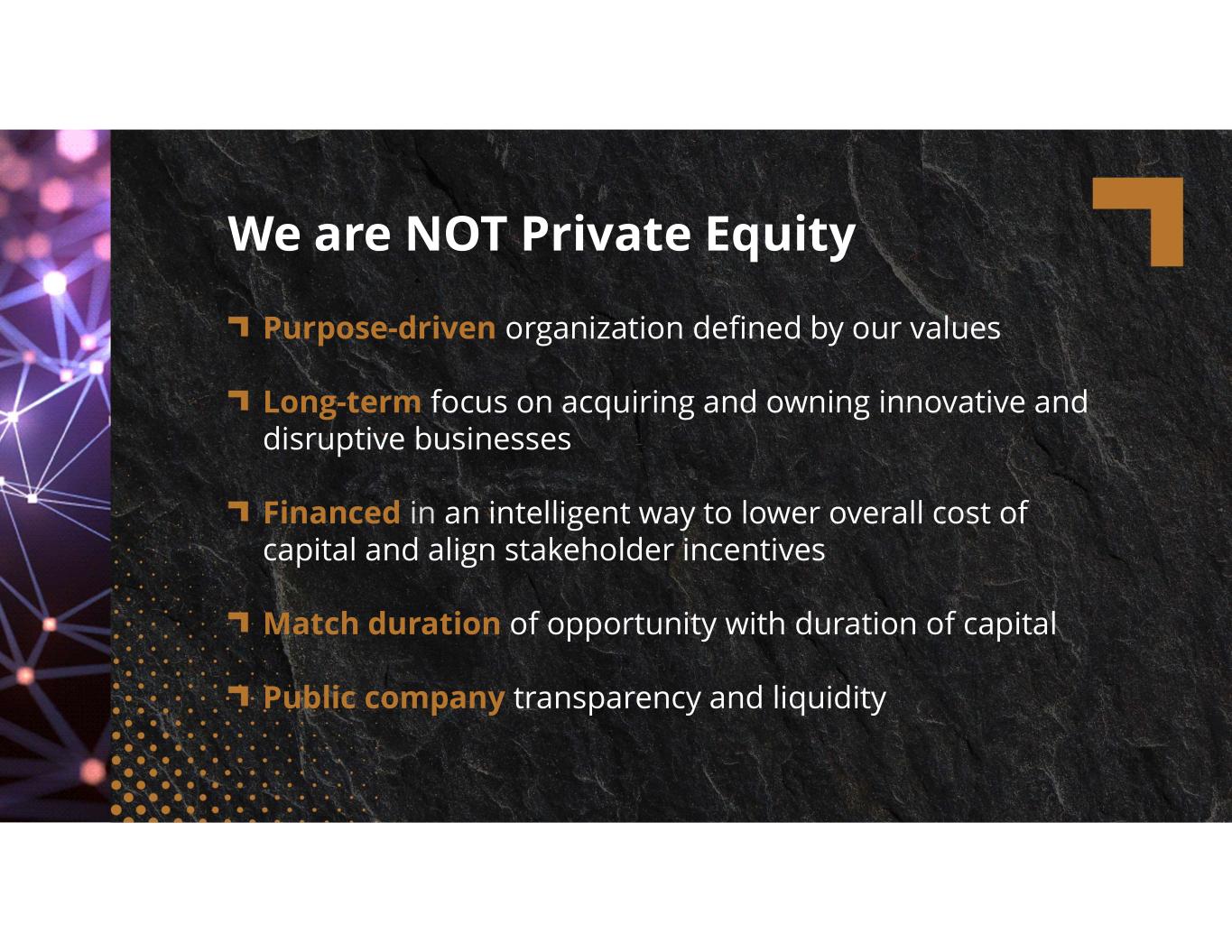 compassdiversified.com Purpose-driven organization defined by our values Long-term focus on acquiring and owning innovative and disruptive businesses Financed in an intelligent way to lower overall cost of capital and align stakeholder incentives Match duration of opportunity with duration of capital Public company transparency and liquidity We are NOT Private Equity