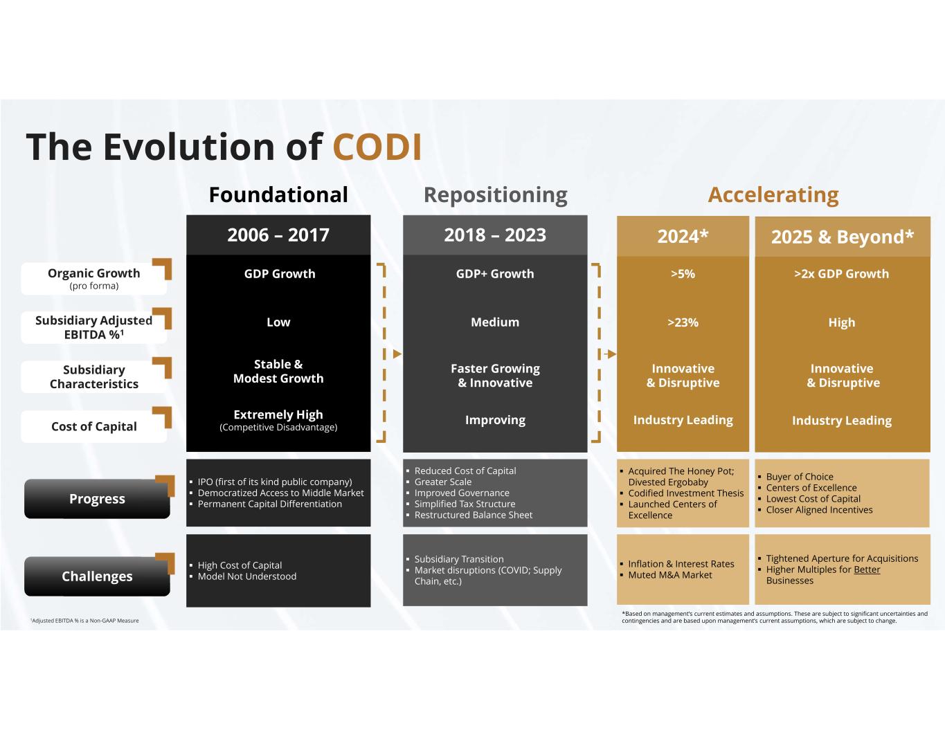 compassdiversified.com The Evolution of CODI Inflation & Interest Rates Muted M&A Market Acquired The Honey Pot; Divested Ergobaby Codified Investment Thesis Launched Centers of Excellence 2024* >5% >23% Innovative & Disruptive Industry Leading Accelerating Tightened Aperture for Acquisitions Higher Multiples for Better Businesses Buyer of Choice Centers of Excellence Lowest Cost of Capital Closer Aligned Incentives 2025 & Beyond* >2x GDP Growth High Innovative & Disruptive Industry Leading Organic Growth (pro forma) Subsidiary Adjusted EBITDA %1 Subsidiary Characteristics Cost of Capital Progress Challenges 2018 – 2023 GDP+ Growth Medium Faster Growing & Innovative Improving Repositioning Subsidiary Transition Market disruptions (COVID; Supply Chain, etc.) Reduced Cost of Capital Greater Scale Improved Governance Simplified Tax Structure Restructured Balance Sheet *Based on management’s current estimates and assumptions. These are subject to significant uncertainties and contingencies and are based upon management’s current assumptions, which are subject to change. 2006 – 2017 GDP Growth Low Stable & Modest Growth Extremely High (Competitive Disadvantage) Foundational High Cost of Capital Model Not Understood IPO (first of its kind public company) Democratized Access to Middle Market Permanent Capital Differentiation 1Adjusted EBITDA % is a Non-GAAP Measure