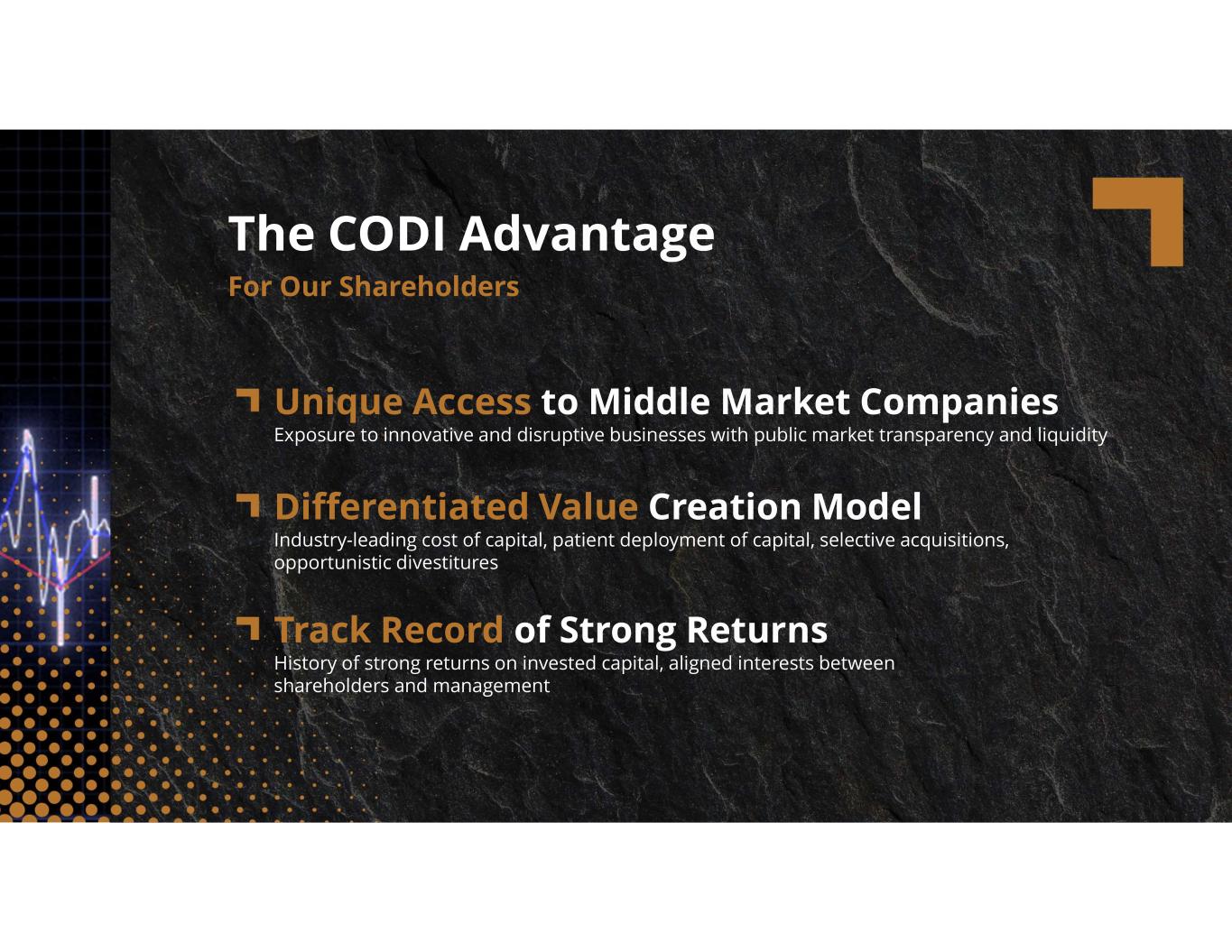 compassdiversified.com Unique Access to Middle Market Companies Exposure to innovative and disruptive businesses with public market transparency and liquidity The CODI Advantage For Our Shareholders Differentiated Value Creation Model Industry-leading cost of capital, patient deployment of capital, selective acquisitions, opportunistic divestitures Track Record of Strong Returns History of strong returns on invested capital, aligned interests between shareholders and management