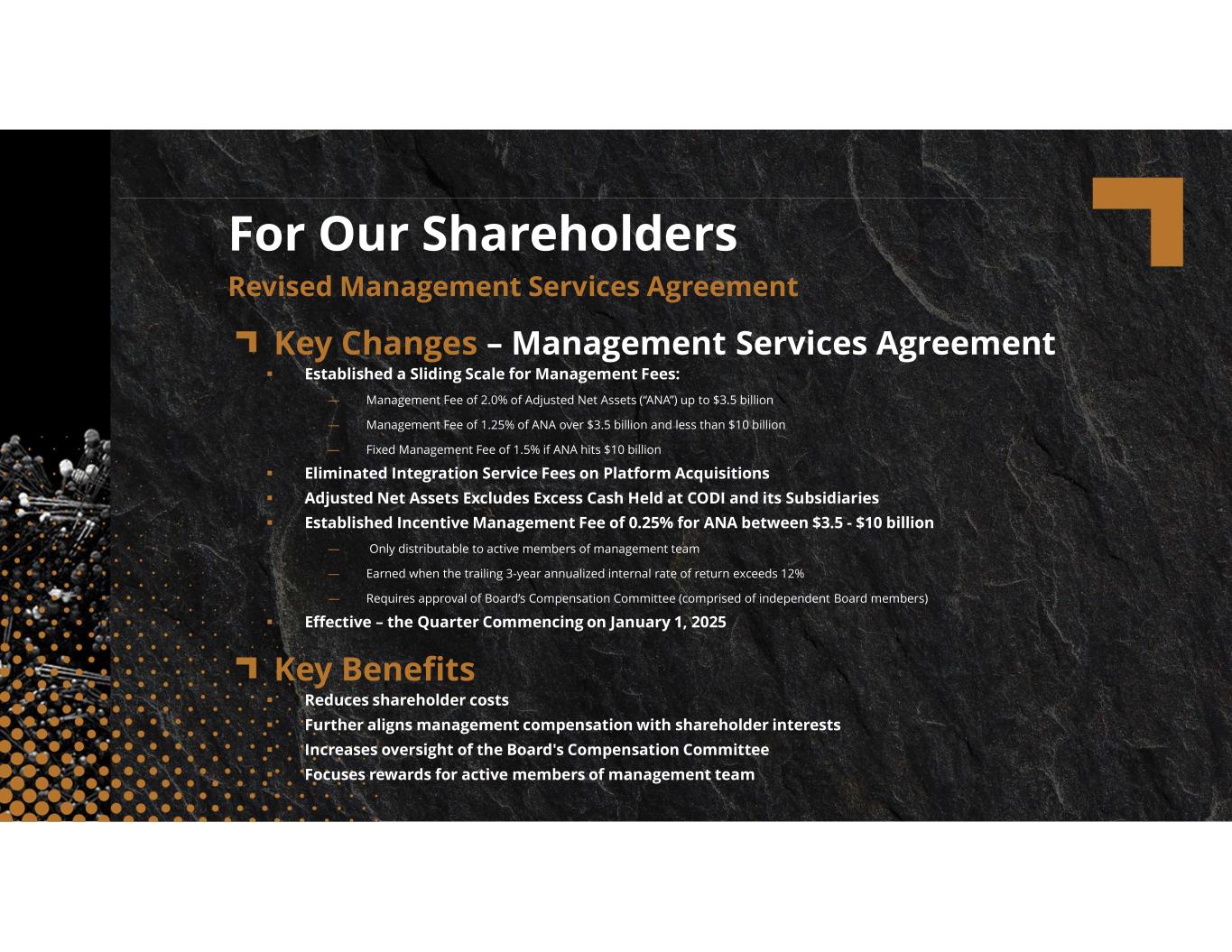 compassdiversified.com Key Changes – Management Services Agreement Established a Sliding Scale for Management Fees: — Management Fee of 2.0% of Adjusted Net Assets (“ANA”) up to $3.5 billion — Management Fee of 1.25% of ANA over $3.5 billion and less than $10 billion — Fixed Management Fee of 1.5% if ANA hits $10 billion Eliminated Integration Service Fees on Platform Acquisitions Adjusted Net Assets Excludes Excess Cash Held at CODI and its Subsidiaries Established Incentive Management Fee of 0.25% for ANA between $3.5 - $10 billion — Only distributable to active members of management team — Earned when the trailing 3-year annualized internal rate of return exceeds 12% — Requires approval of Board’s Compensation Committee (comprised of independent Board members) Effective – the Quarter Commencing on January 1, 2025 For Our Shareholders Revised Management Services Agreement Key Benefits Reduces shareholder costs Further aligns management compensation with shareholder interests Increases oversight of the Board's Compensation Committee Focuses rewards for active members of management team