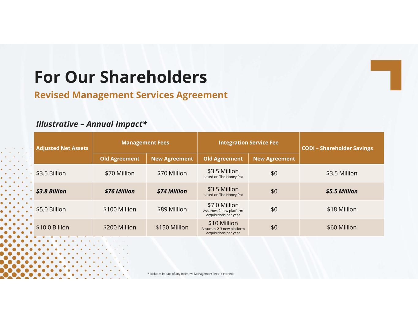 compassdiversified.com CODI – Shareholder Savings Integration Service FeeManagement Fees Adjusted Net Assets New Agreement Old AgreementNew Agreement Old Agreement $3.5 Million $0 $3.5 Million based on The Honey Pot $70 Million$70 Million$3.5 Billion $5.5 Million$0 $3.5 Million based on The Honey Pot $74 Million$76 Million$3.8 Billion $18 Million$0 $7.0 Million Assumes 2 new platform acquisitions per year $89 Million$100 Million$5.0 Billion $60 Million$0 $10 Million Assumes 2-3 new platform acquisitions per year $150 Million$200 Million$10.0 Billion For Our Shareholders Revised Management Services Agreement Illustrative – Annual Impact* *Excludes impact of any Incentive Management Fees (if earned)
