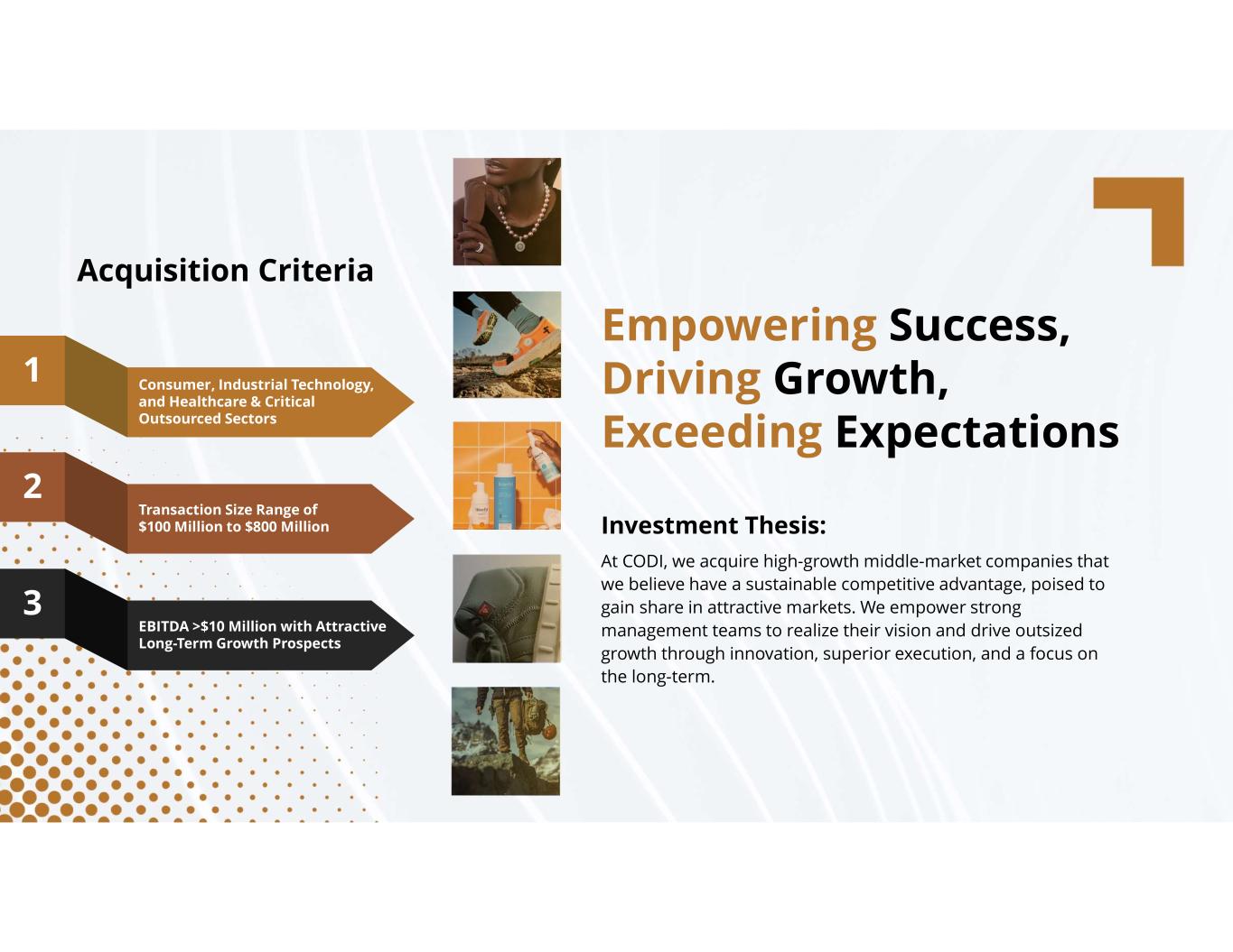 compassdiversified.com Empowering Success, Driving Growth, Exceeding Expectations Investment Thesis: At CODI, we acquire high-growth middle-market companies that we believe have a sustainable competitive advantage, poised to gain share in attractive markets. We empower strong management teams to realize their vision and drive outsized growth through innovation, superior execution, and a focus on the long-term. 2 Transaction Size Range of $100 Million to $800 Million 1 Consumer, Industrial Technology, and Healthcare & Critical Outsourced Sectors 3 EBITDA >$10 Million with Attractive Long-Term Growth Prospects Acquisition Criteria