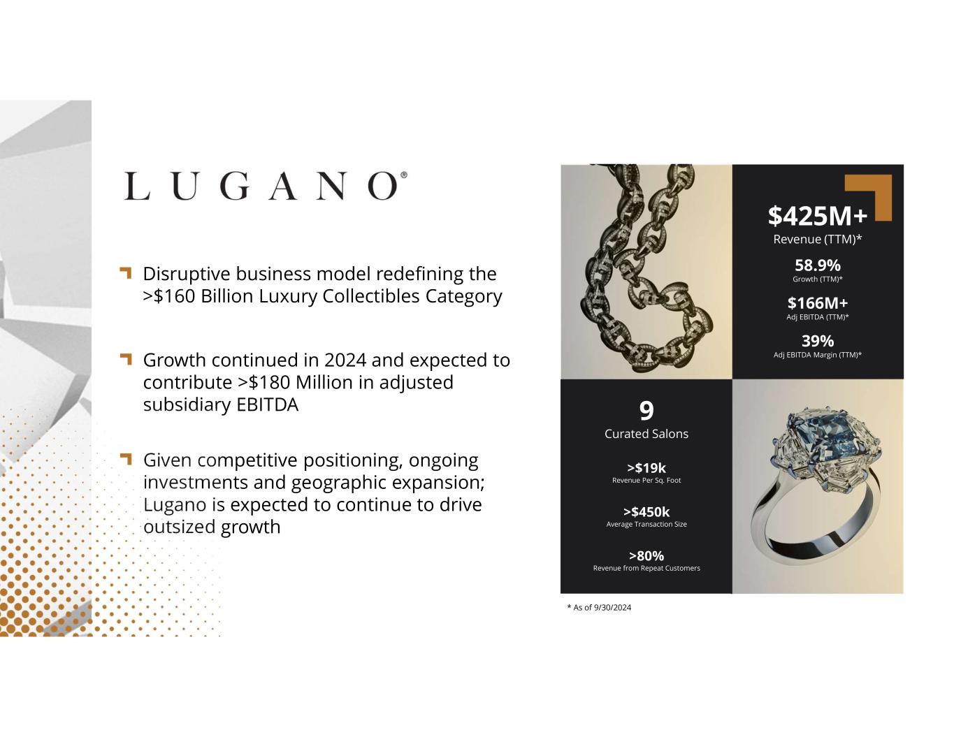 compassdiversified.com 9 Curated Salons >$450k Average Transaction Size $425M+ Revenue (TTM)* 58.9% Growth (TTM)* $166M+ Adj EBITDA (TTM)* >80% Revenue from Repeat Customers >$19k Revenue Per Sq. Foot 39% Adj EBITDA Margin (TTM)* Disruptive business model redefining the >$160 Billion Luxury Collectibles Category * As of 9/30/2024 Growth continued in 2024 and expected to contribute >$180 Million in adjusted subsidiary EBITDA Given competitive positioning, ongoing investments and geographic expansion; Lugano is expected to continue to drive outsized growth